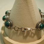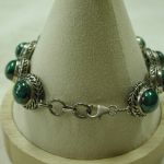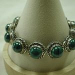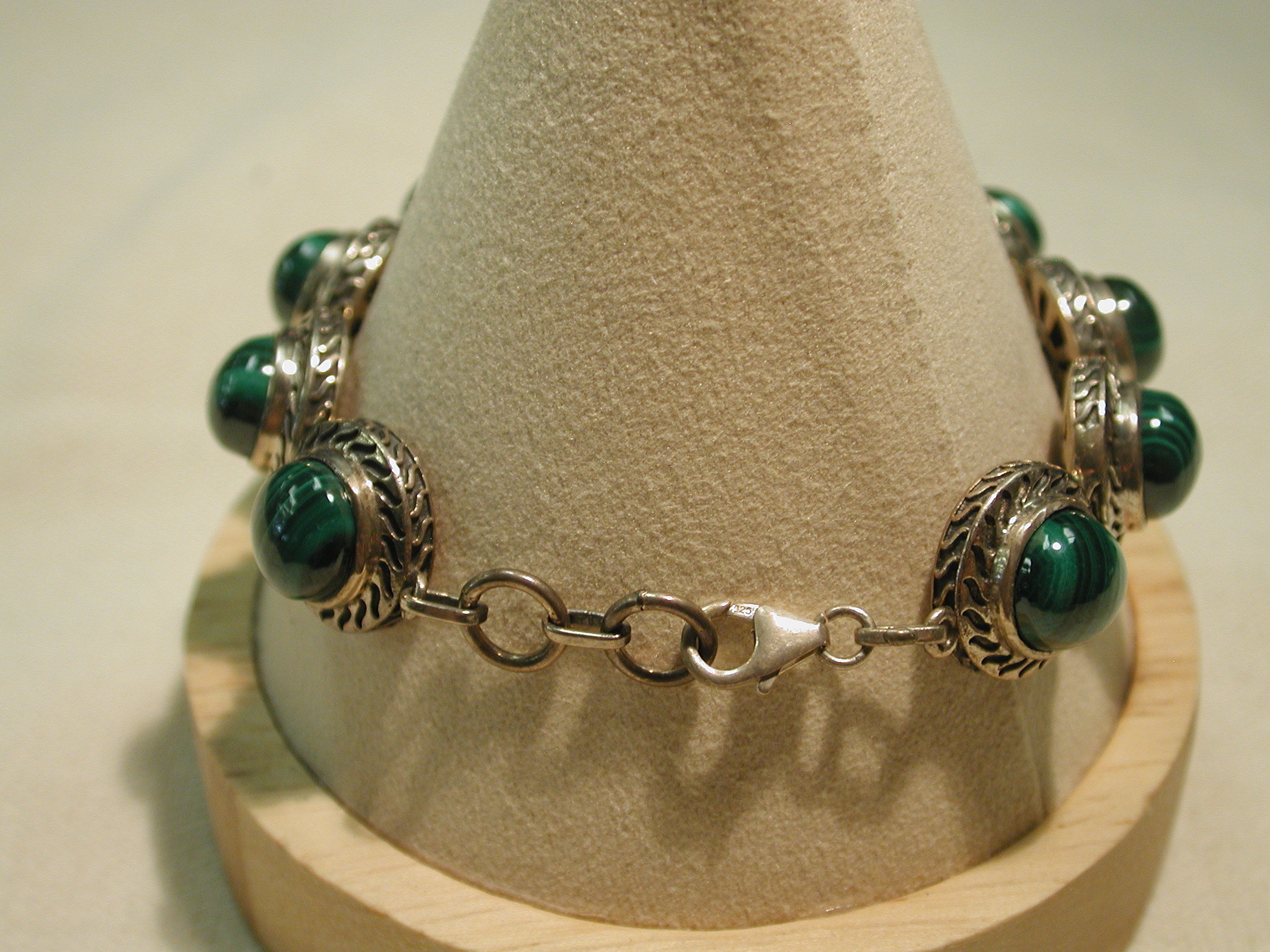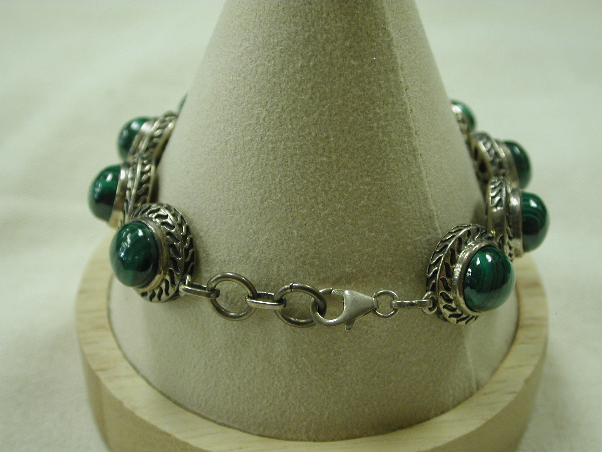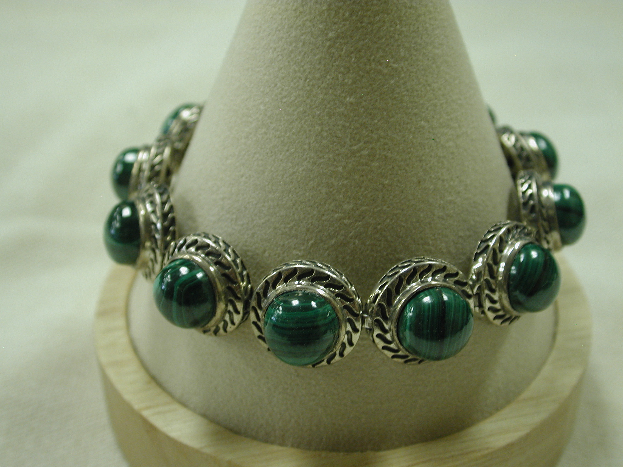 10mm round Malachite Sterling Bracelet 7 1/2 inches – each polished domed malachite is bezel set in a 15mm round rope seciton with very pretty cut design. Well made it weighs 44 grams.