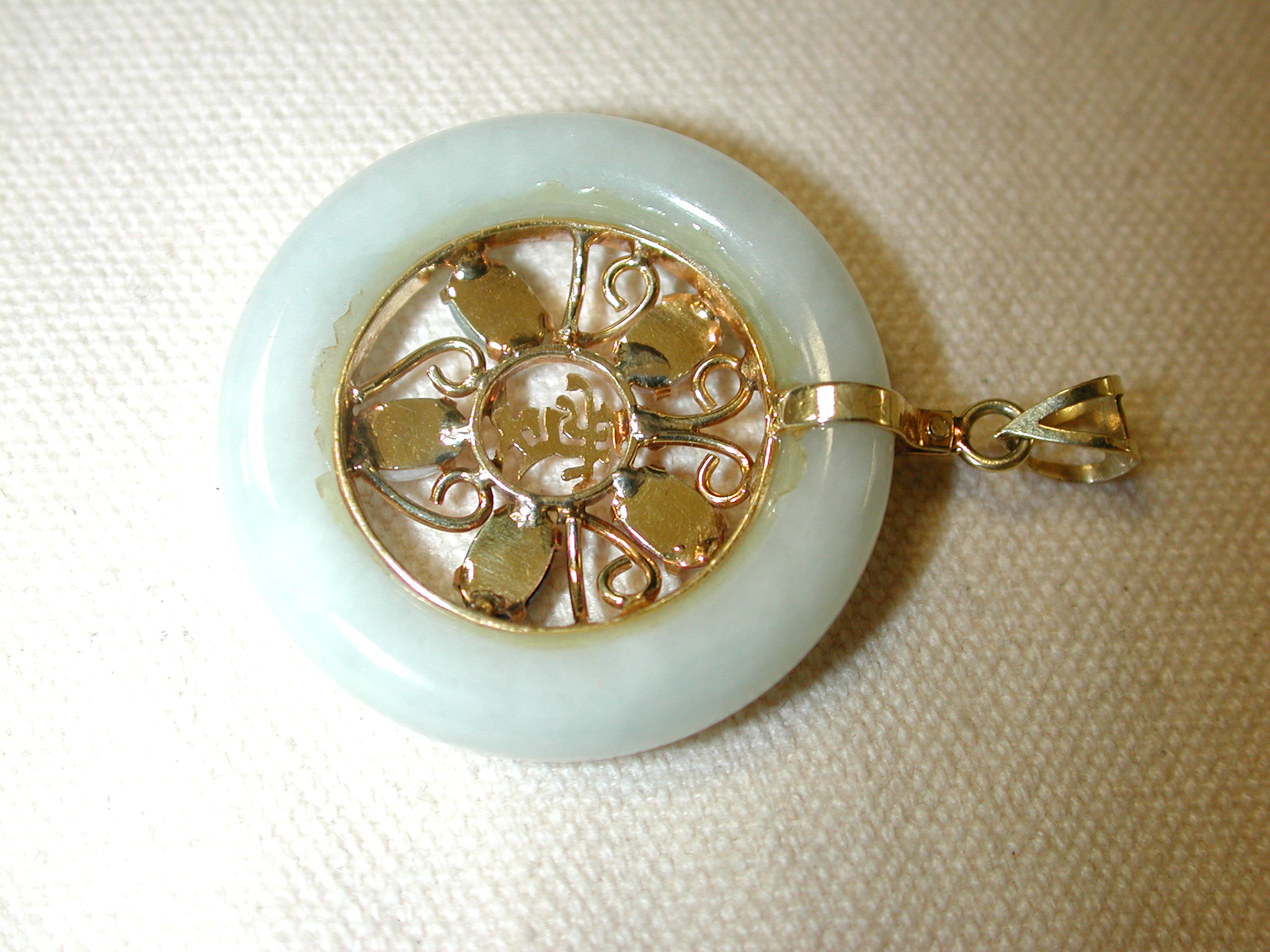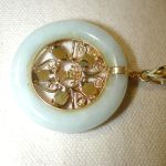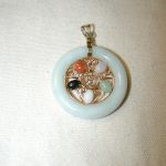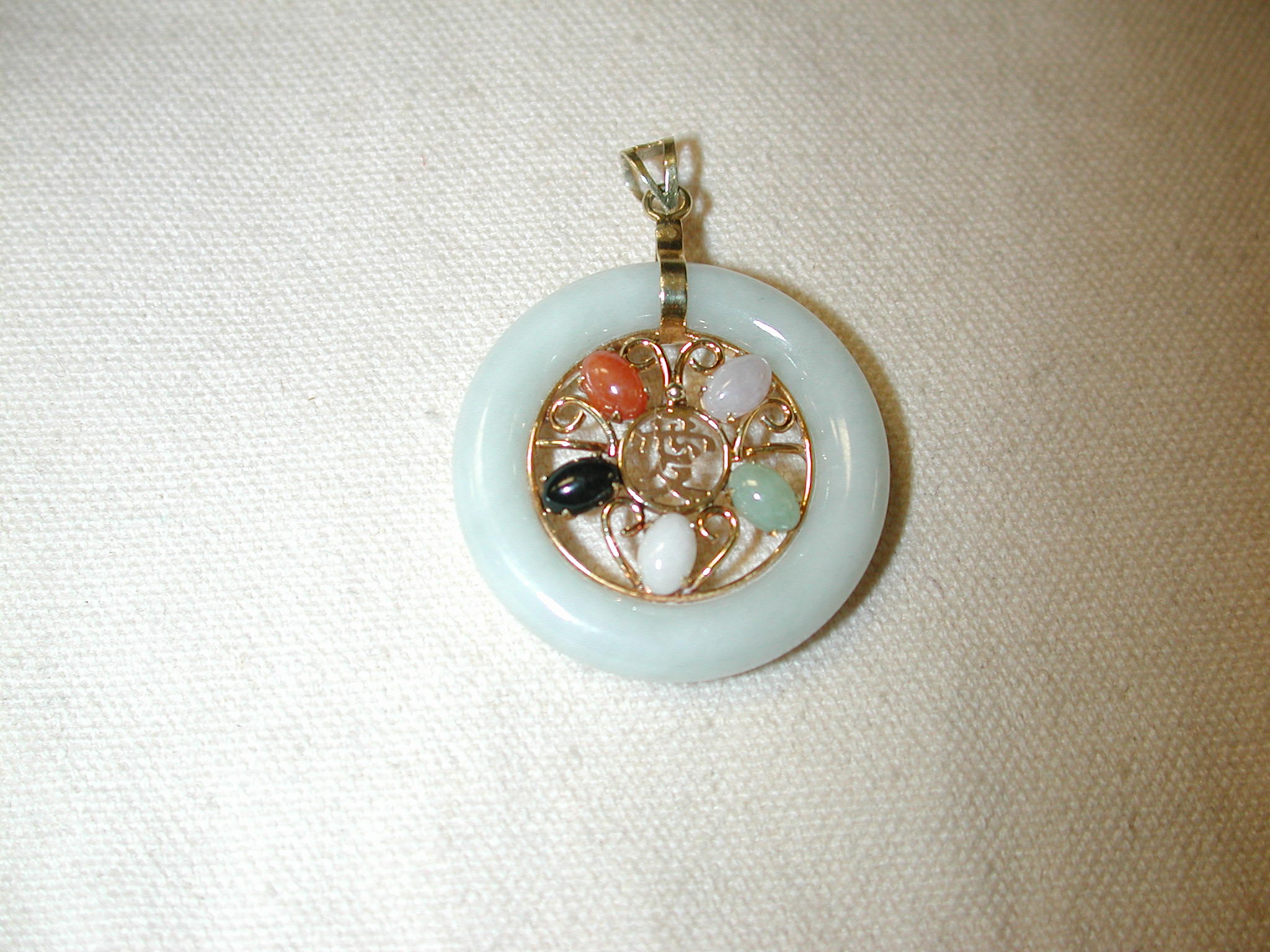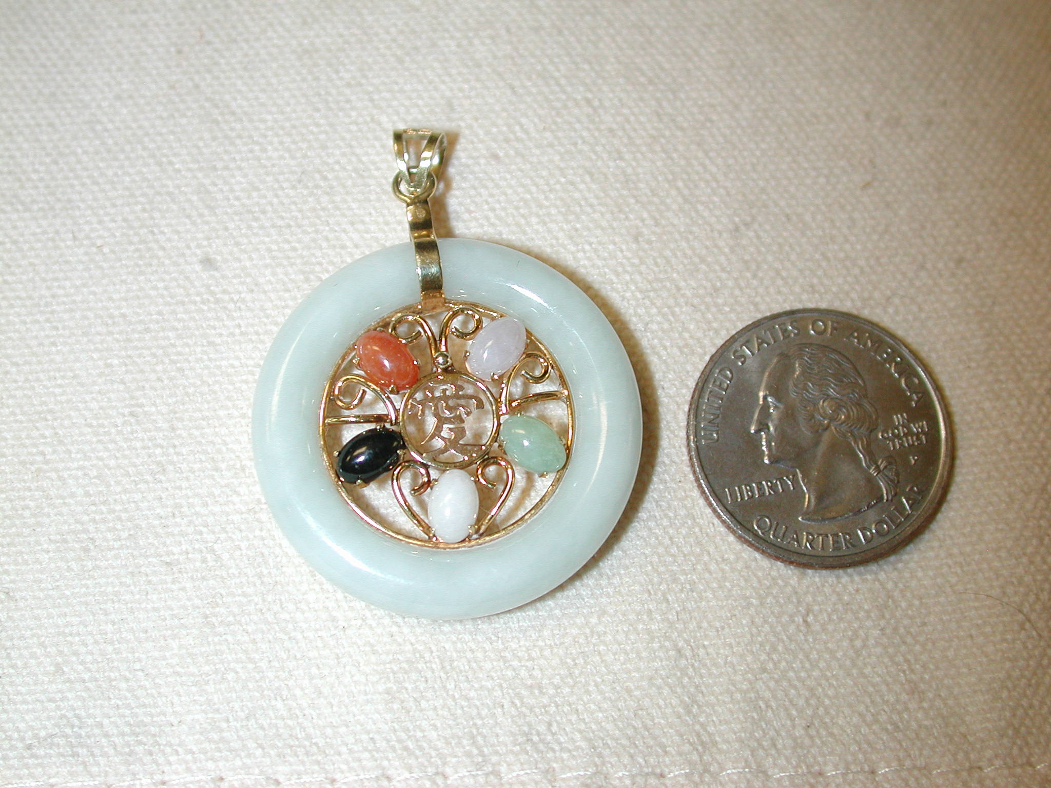 14KT Circle Jade Ring Love Pendant multi color 36mm round – Chinese character for Love is in center surrounded by 5 oval cabochon assuming other jade stones. Surrounded by a 6mm round circle of pale green jade. Stamped 14kt and the piece shows no signs of wear at all. Top bale can accommodate a 4mm chain.