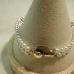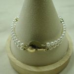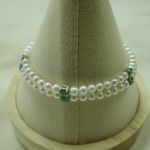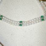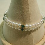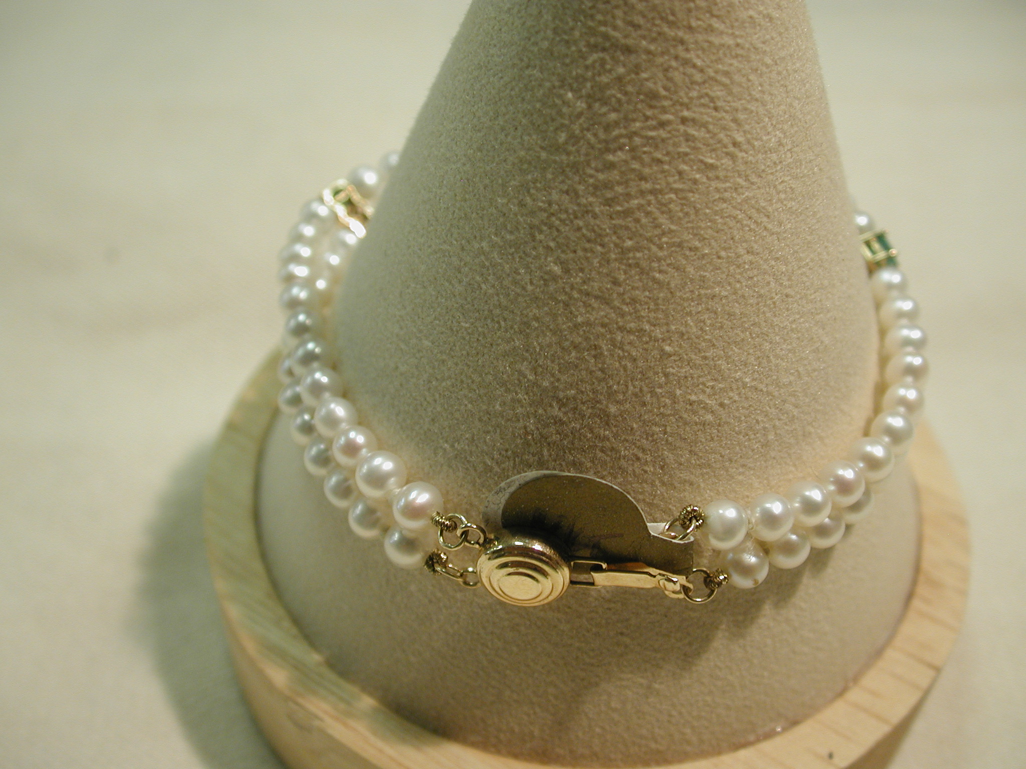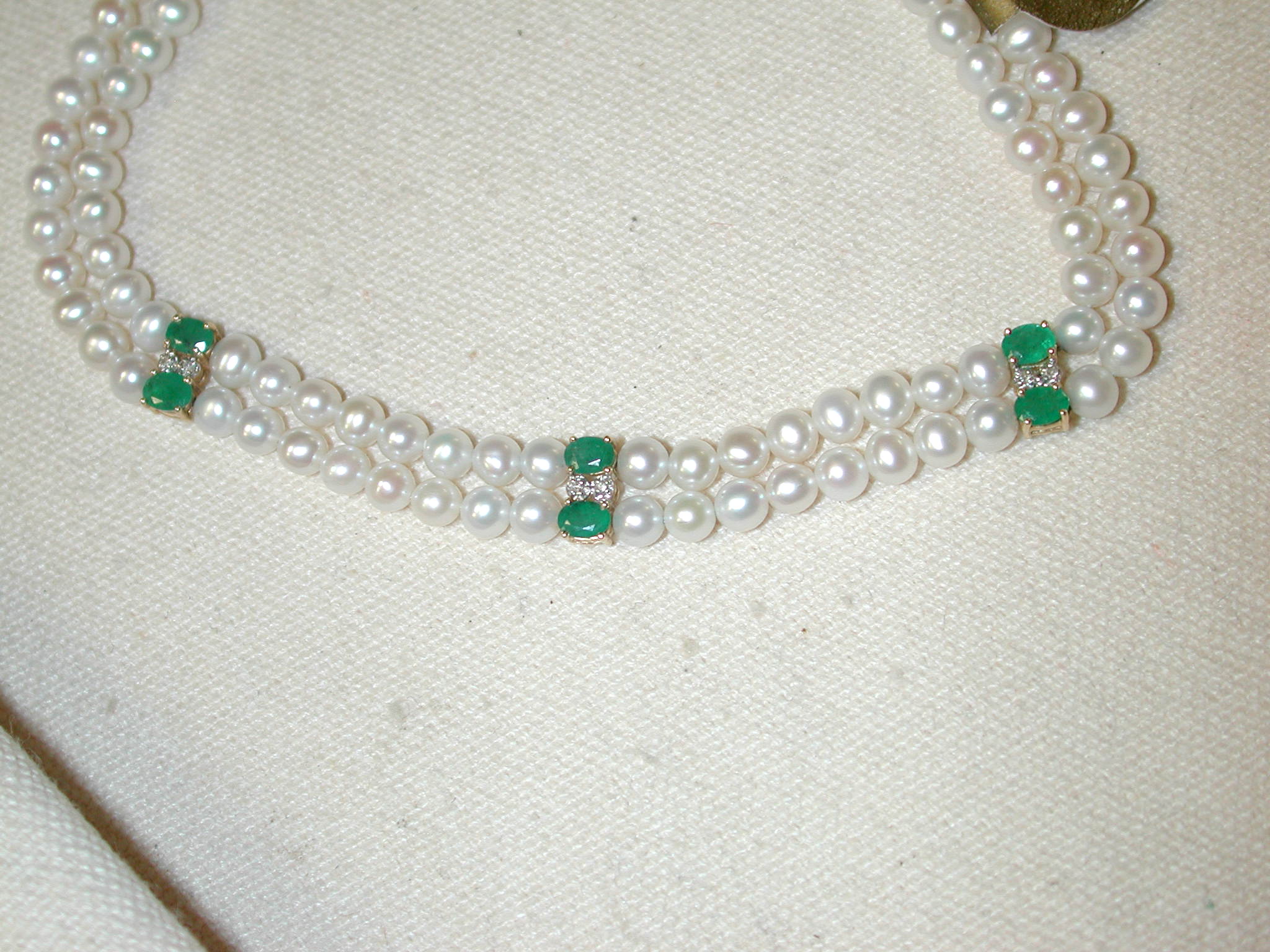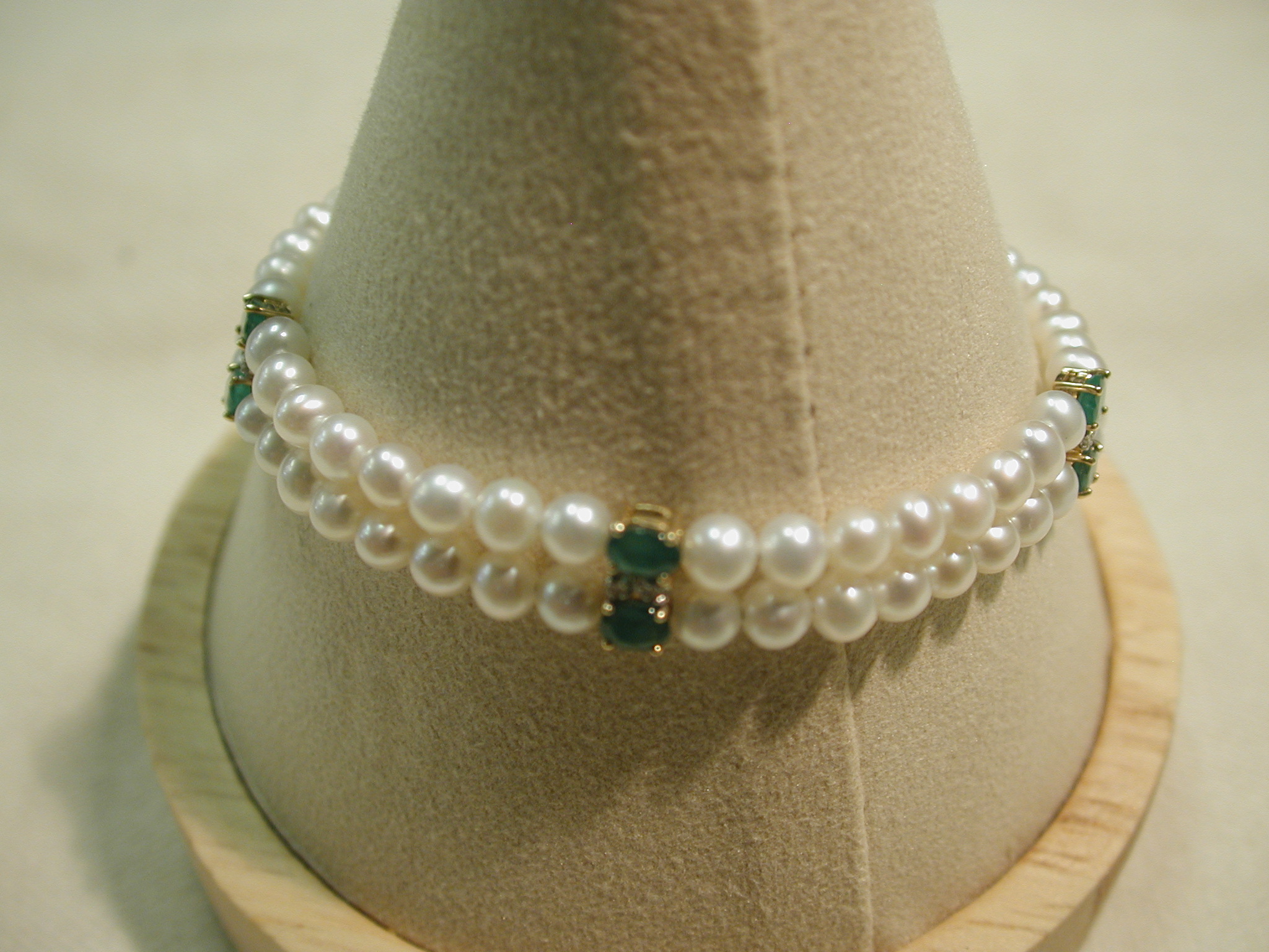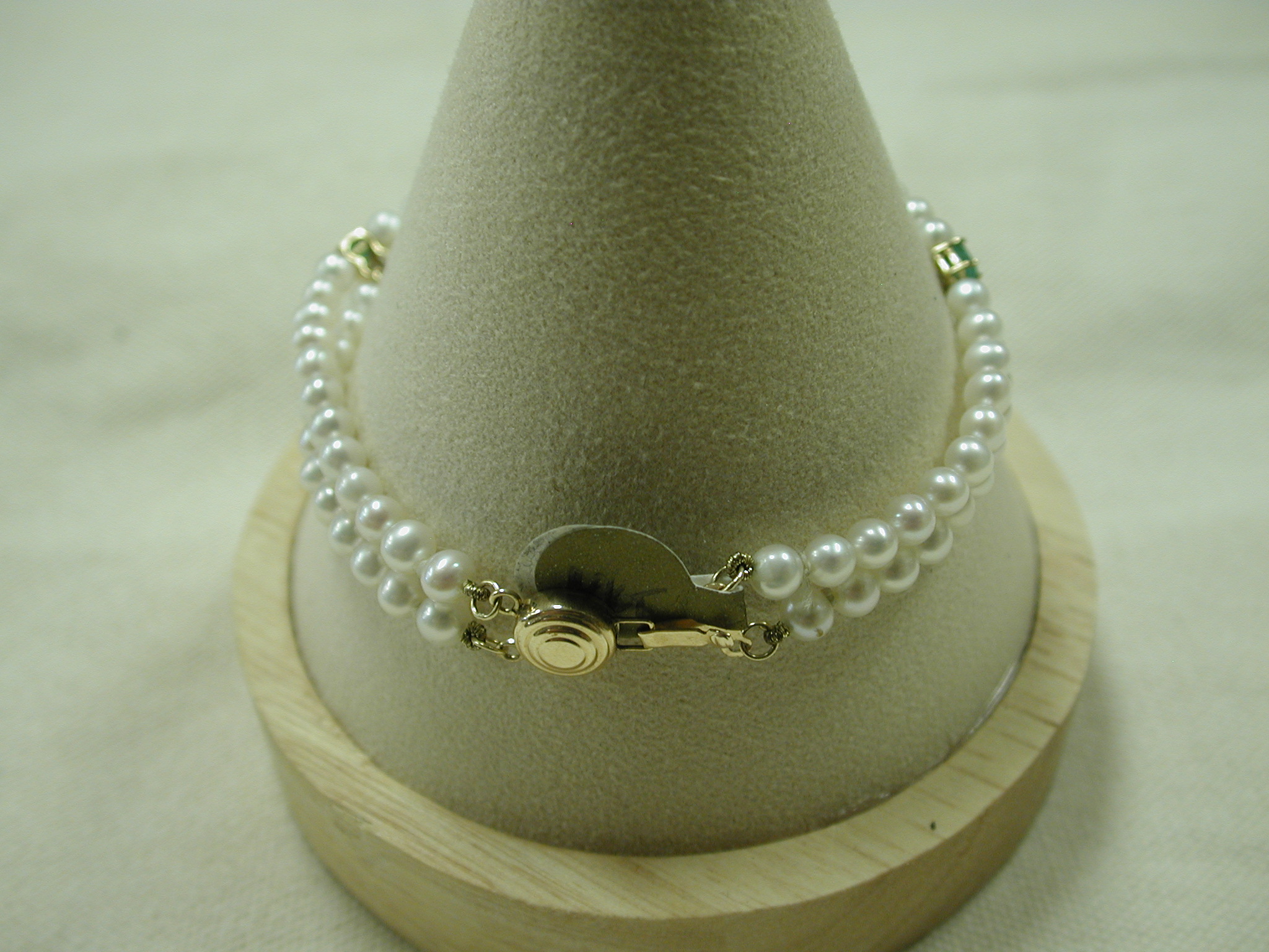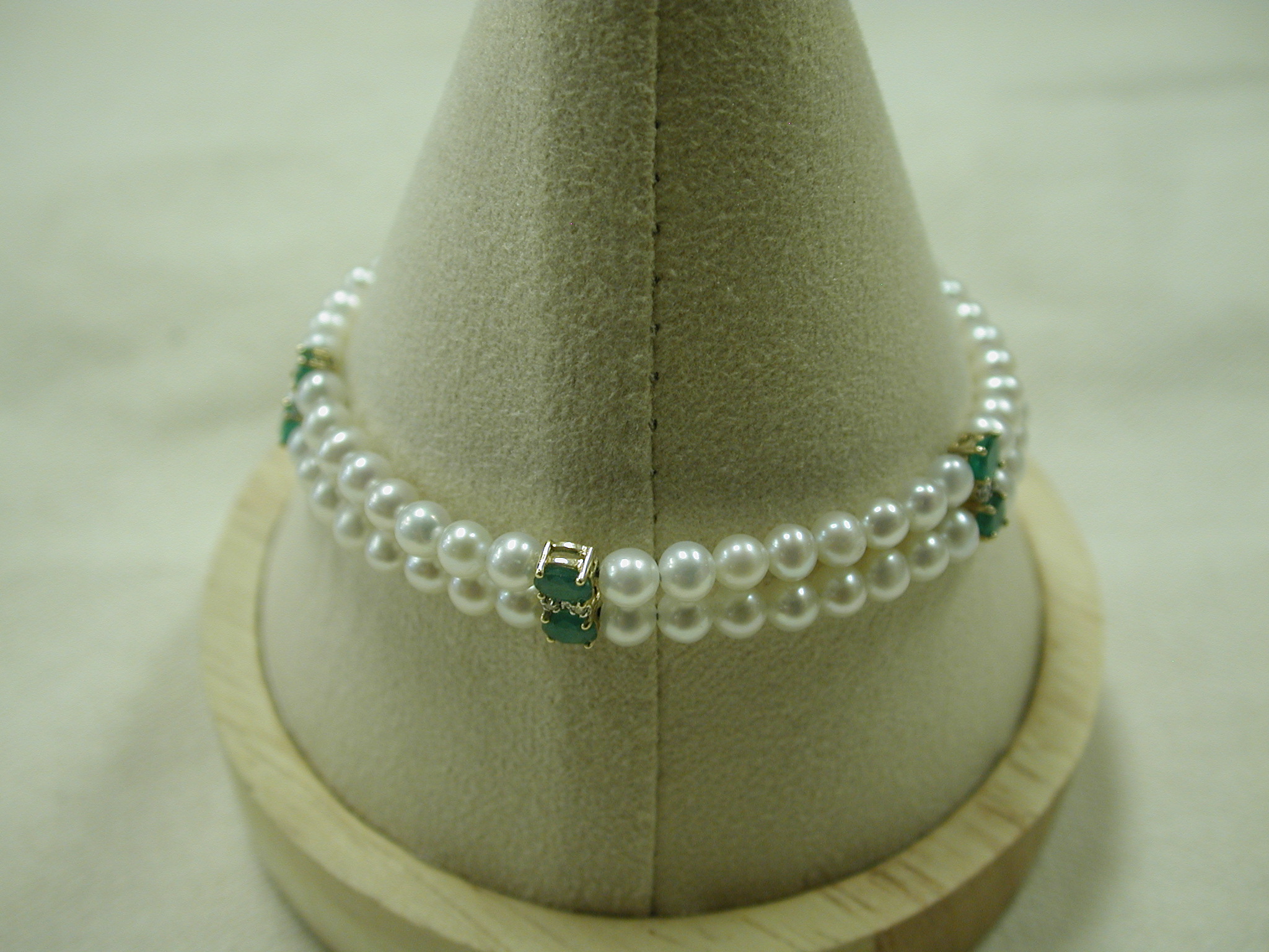 14KT yellow gold pearl and emerald diamond double strand bracelet- pearls are 4mm round and there are 3 sections of emerald/diamonds – 6 green natural emeralds oval 3 x 4 mm and 6 .01 point round brilliant cut diamonds set in between. The double strand is 8mm total width and has a nice cuff appearance.