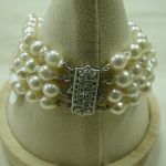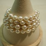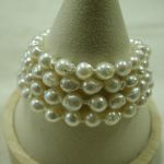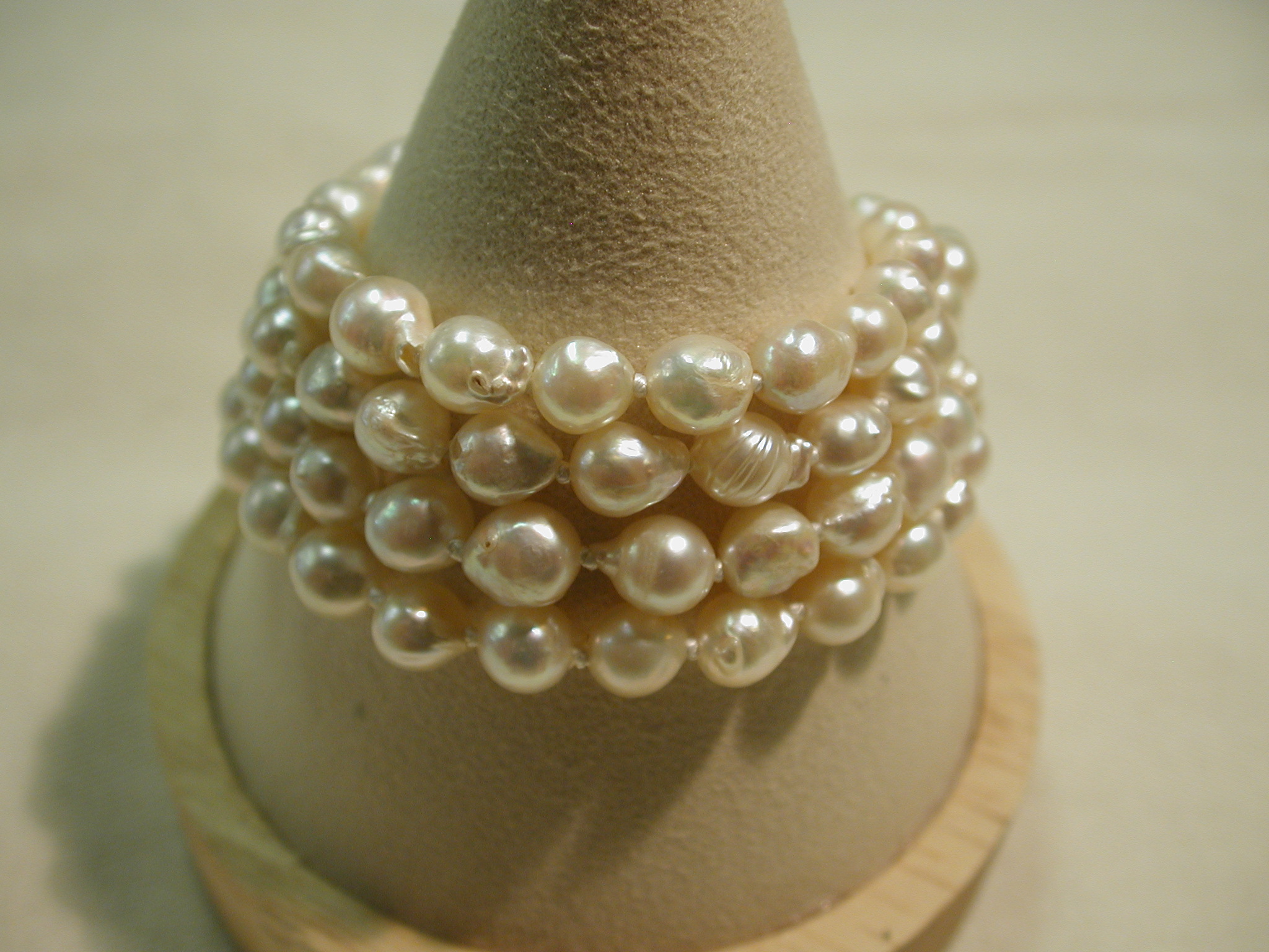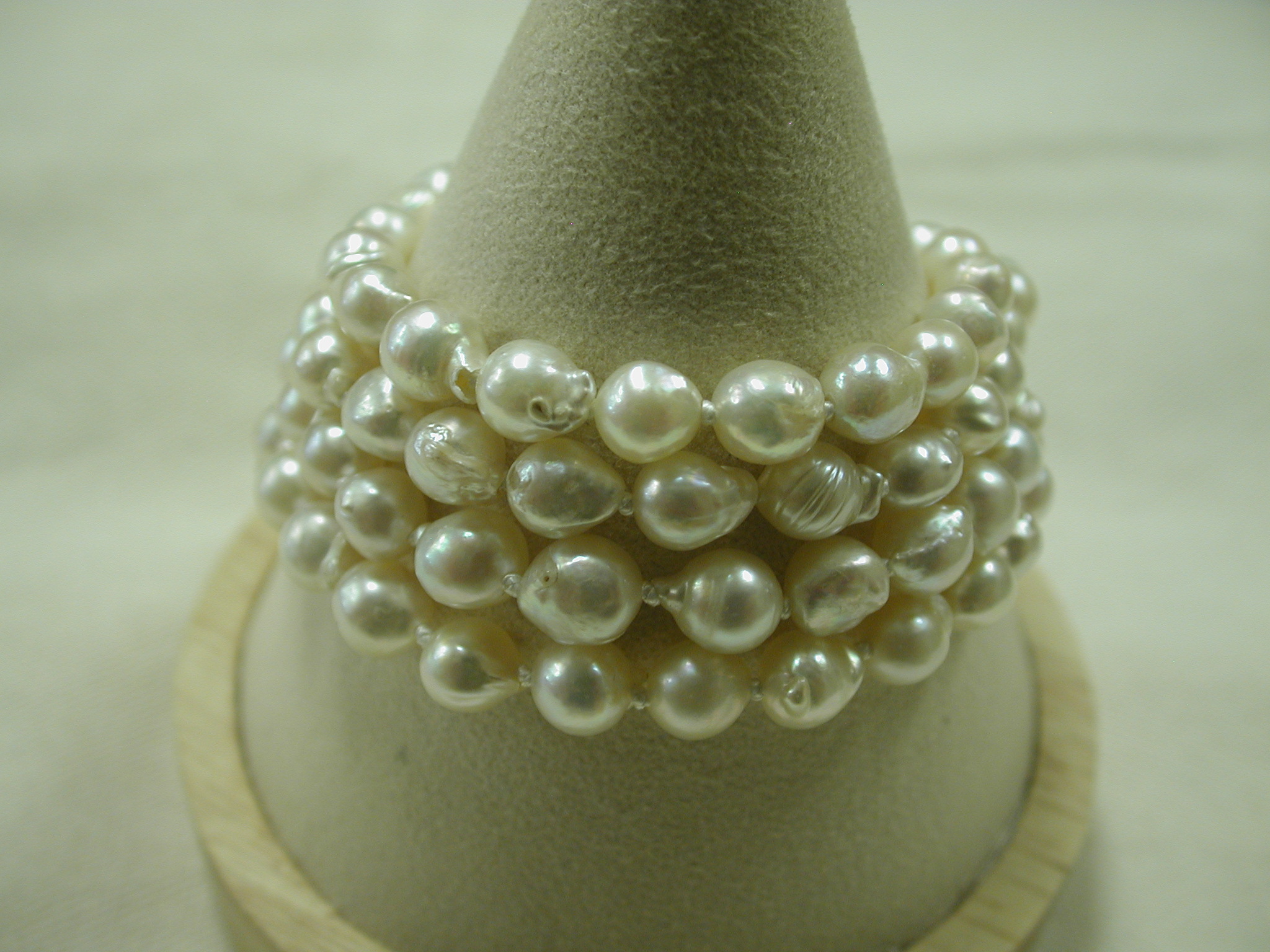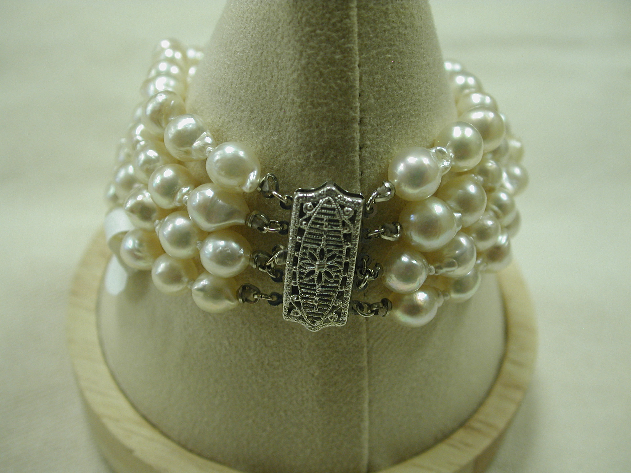 14KT white gold Baroque Pearl 4 strand Bracelet filigree clasp 7 inches = the pearls are 6-77mm and are knotted in between – together the strands are 25mm in width so it has a nice cuff look. The filigree clasp is 20mm x 8 mm. Natural baroque pearls are a creamy white.