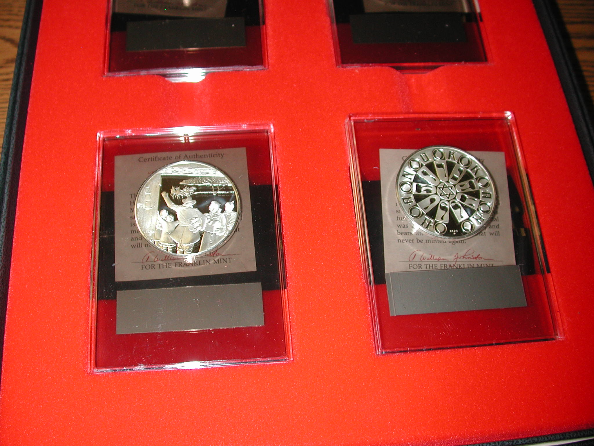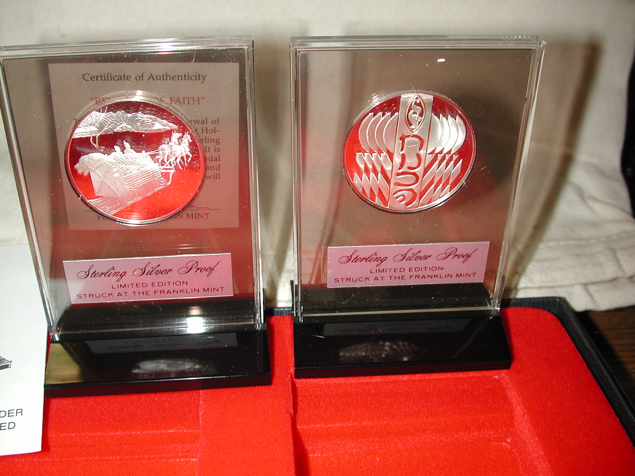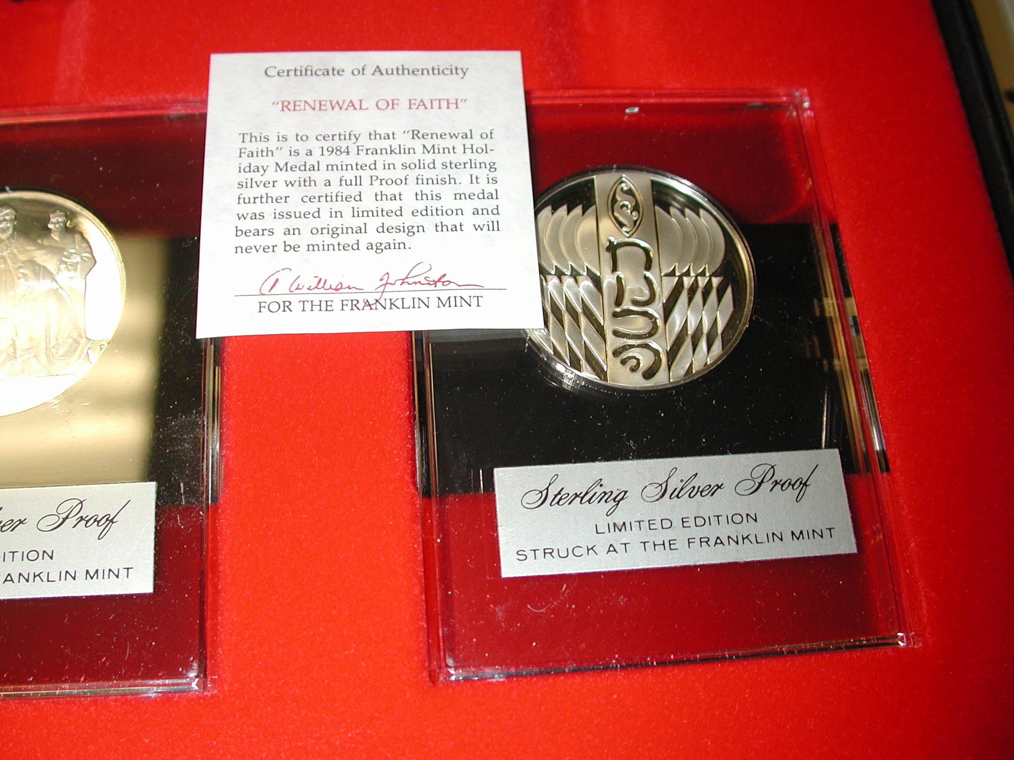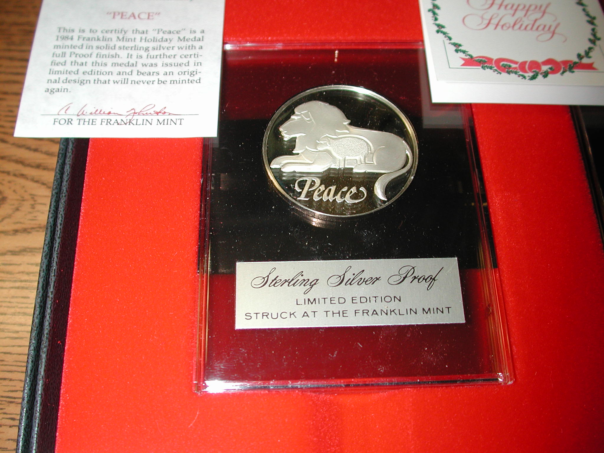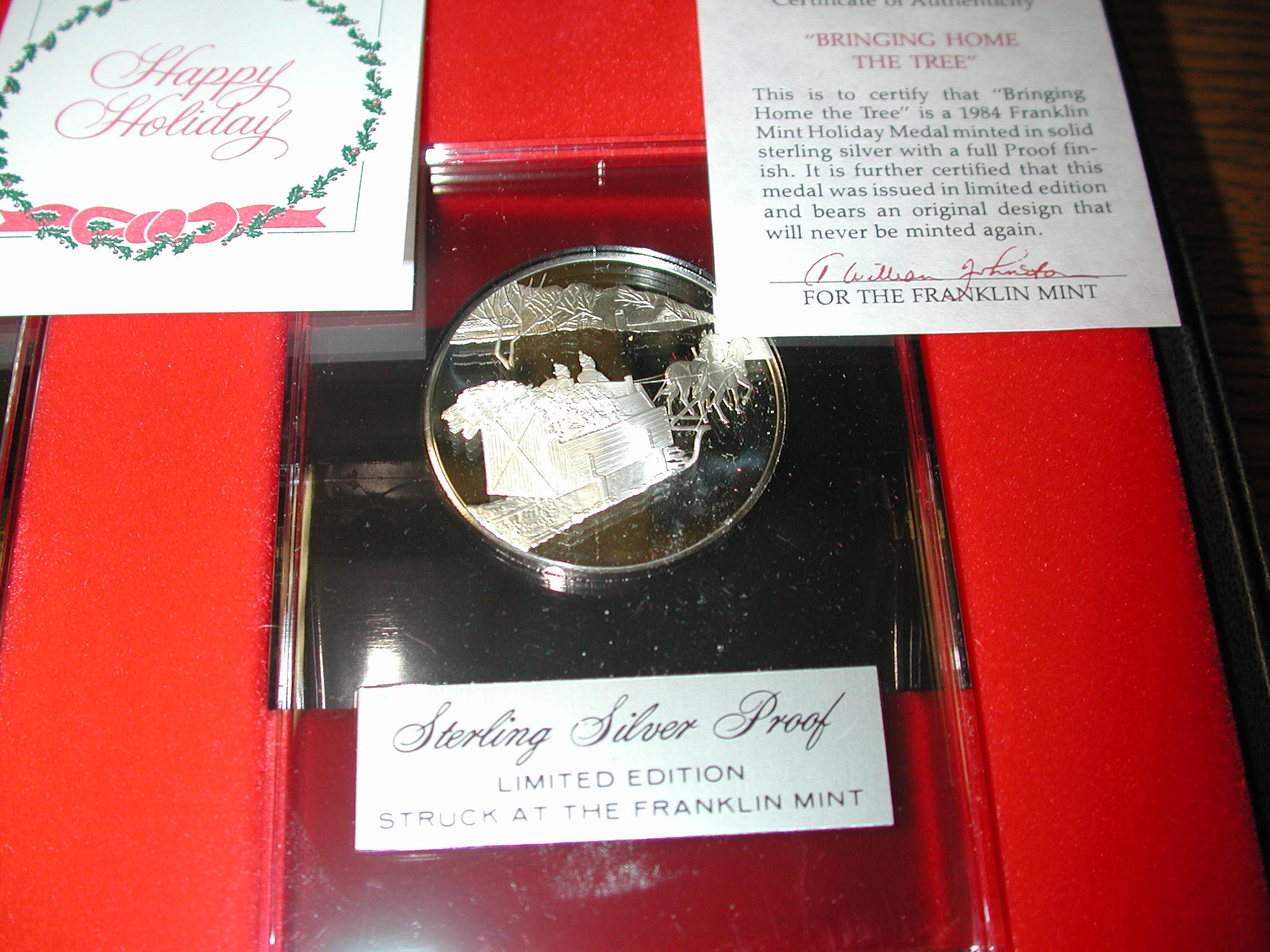 This is a 1984 FRANKLIN MINT “HOLIDAY” SILVER MEDAL SET OF 4 DIFFERENT. The Medals are made from STERLING SILVER, weigh from 24 to 25 Grams each, are in Proof Condition with no spots or toning, and come in the Original Display Case with Stand & COA and Box. Never opened and presented – in original box – has the Happy Holidays little notecard if you want to inscribe.