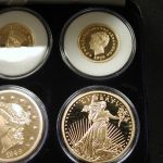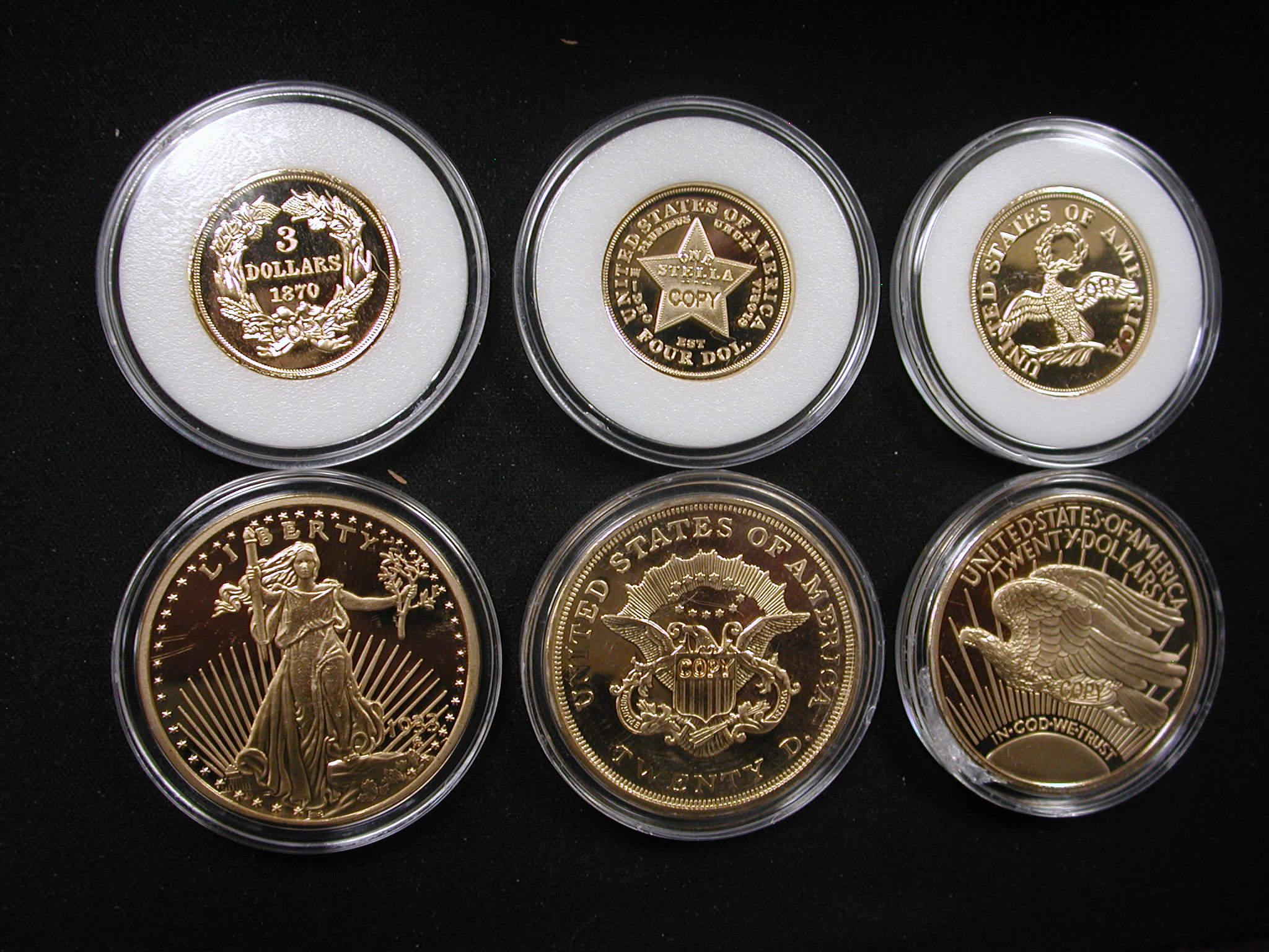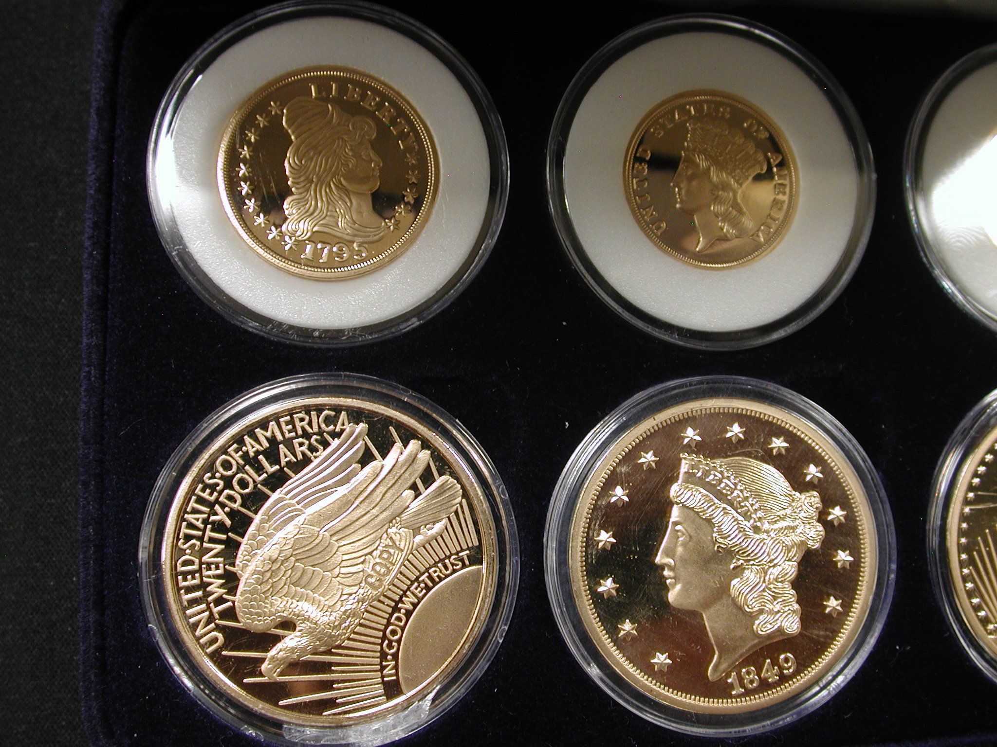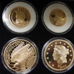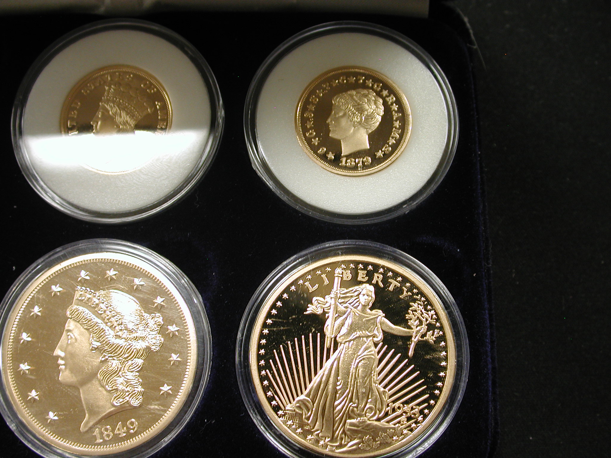America’s Rare Gold Coin Tribute Proof Collection – these are NOT gold – they are gold plated bronze replicas – come in a blue velvet box with COA paperwork.