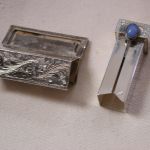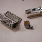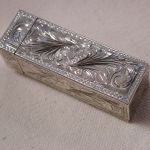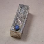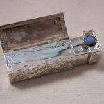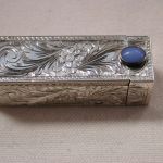Antique 800 Silver Lipstick Holder Filigree Scroll Chalcedony stone – we have cleaned and polished and it looks amazing! The stone is bit worn but the color is classic chalcedony. The mirror finish has worn of the little rectangle glass however you should be able to get a glass place to cut a small piece of mirror to fit. It has a hinge and the mirror side ‘pops’ up strongly when you pull the chalcedony end open. Beautiful design and its ready for lipstick which of course you will have to retrofit. I see the round bottom is about 12mm in diameter and it pushes up easily. Measures 2 1/8 inches long by 5/8 square. Weighs 16.5 dwt.