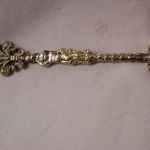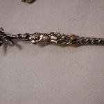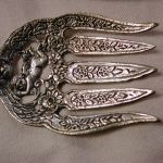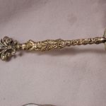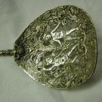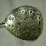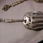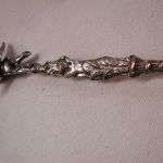 Lot 2 Putti Cherub Repousse Italy serving spoon and fork goldwash – these are not sterling – very ornate and beautiful. The slotted spoon still has a lot of goldwash and is 8 inches long and the fork is 9 inches and has a tiny bit of goldwash left. Both hallmarked Italy.