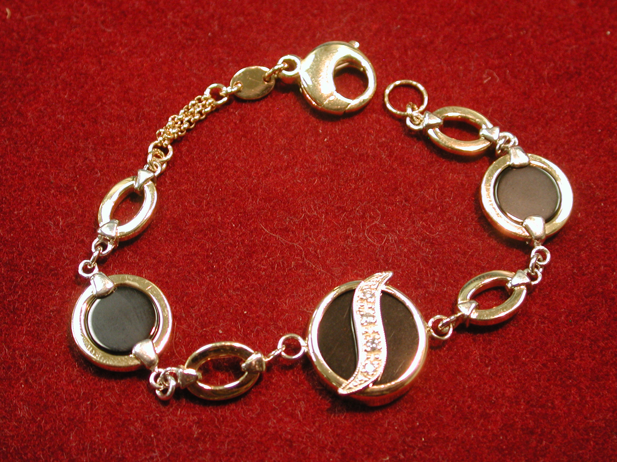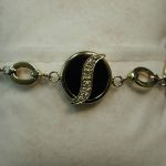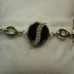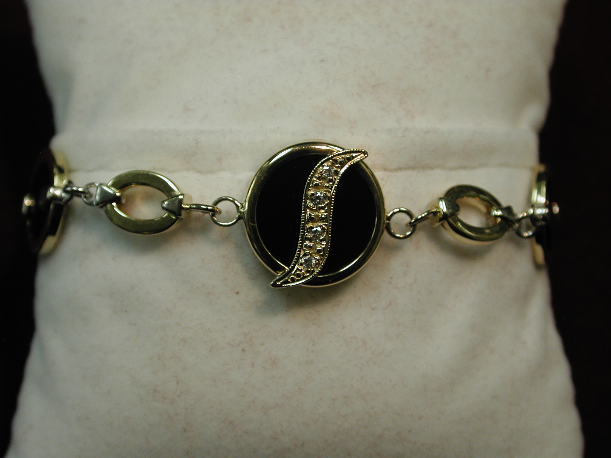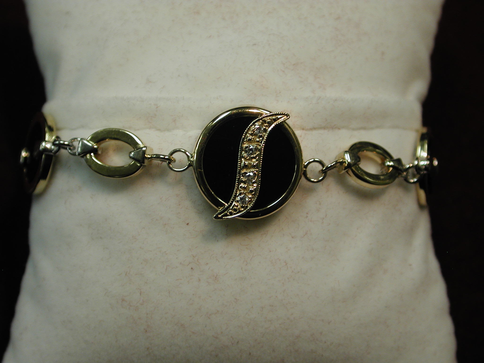 14KT white and yellow gold Onyx and Diamond Geometric bracelet – 7″ long Made in Italy – Center round onyx in bezel measures 17mm round and the smaller onyx sections are 13mm round. The center has a diamond adornment that has 4 round brilliant cut natural diamonds pave set gives the whole bracelet a bit of bling yet this piece can be worn layered or alone with jeans or with a black dress. Many options. Weighs 13.68 grams. Polished and cleaned and ready to gift or wear!