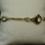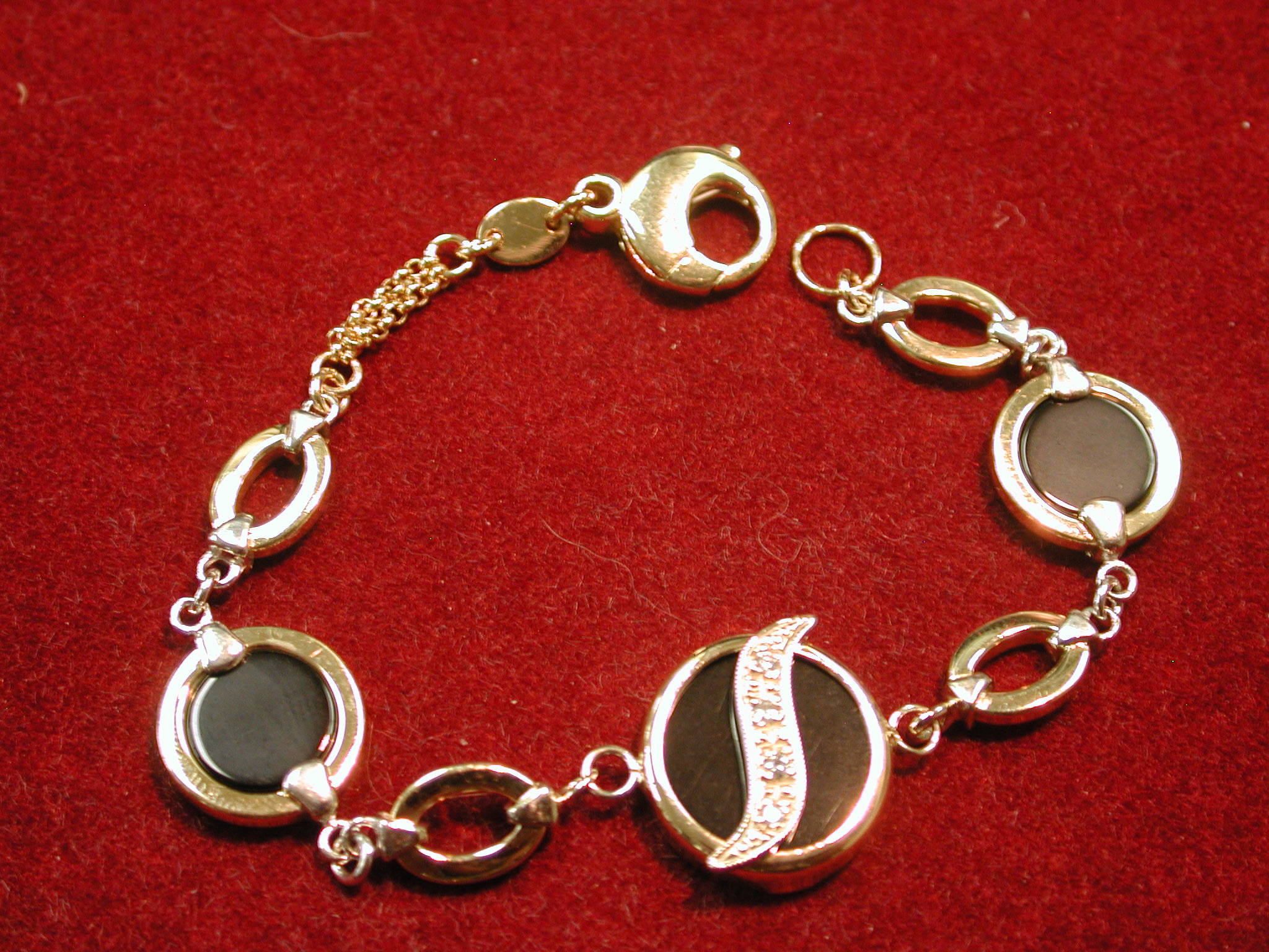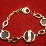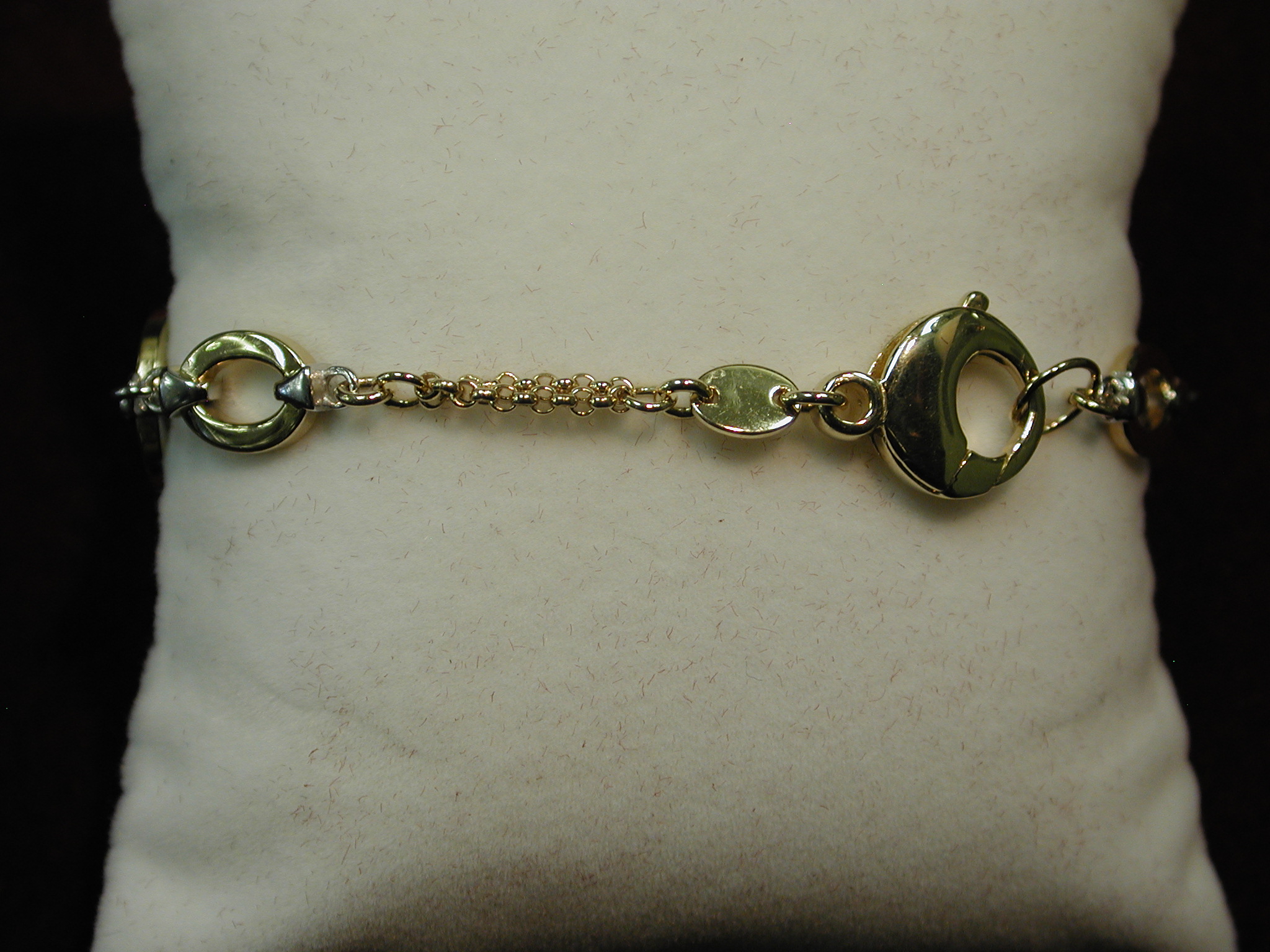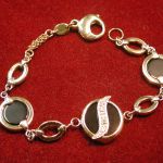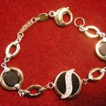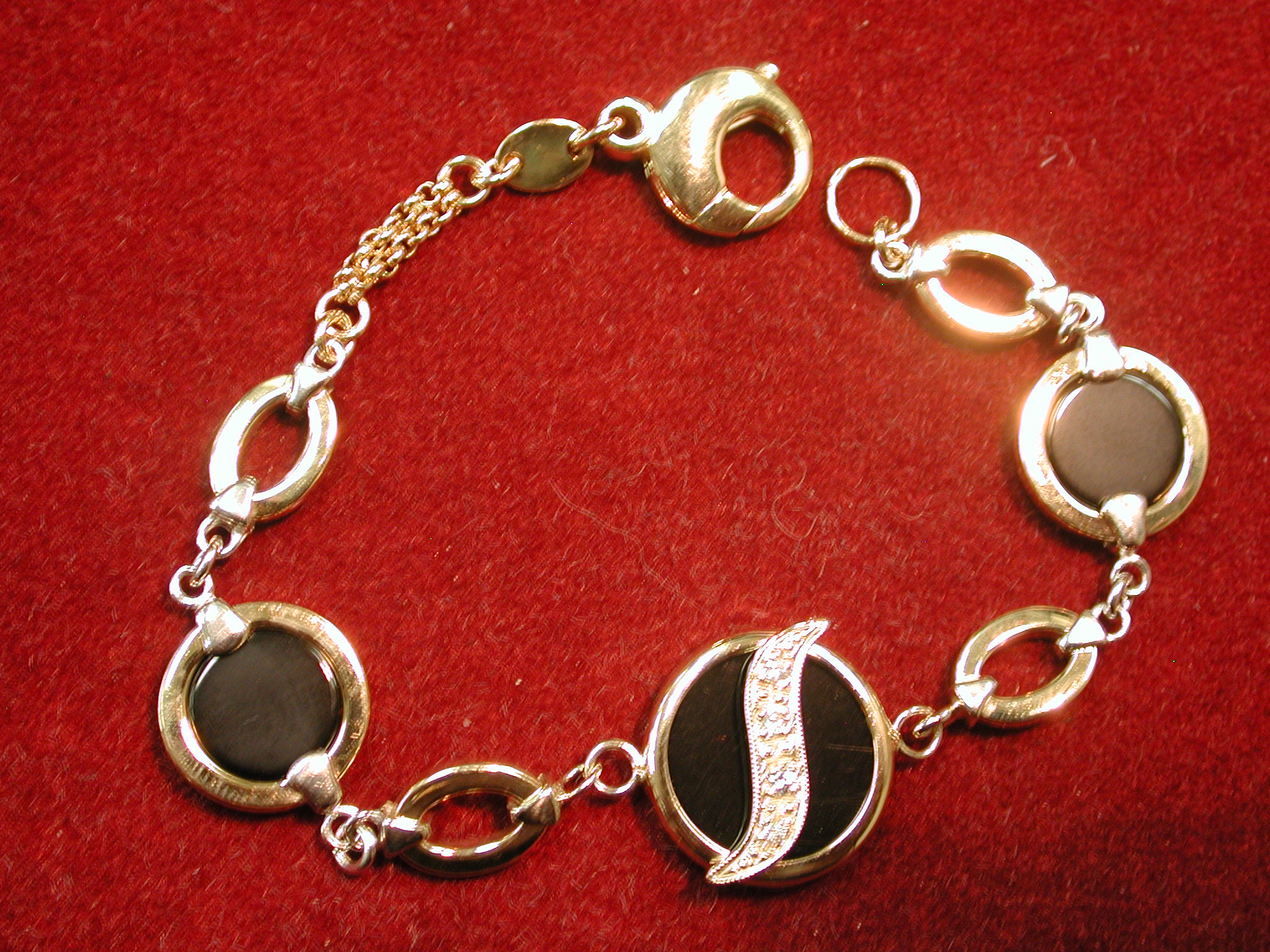 14KT white and yellow gold Onyx and Diamond Geometric bracelet – 7″ long Made in Italy – Center round onyx in bezel measures 17mm round and the smaller onyx sections are 13mm round. The center has a diamond adornment that has 4 round brilliant cut natural diamonds pave set gives the whole bracelet a bit of bling yet this piece can be worn layered or alone with jeans or with a black dress. Many options. Weighs 13.68 grams. Polished and cleaned and ready to gift or wear!