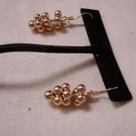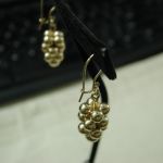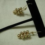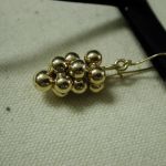 14KT yellow grape bead cluster dangle earrings – beads are 4mm – soldered groups of 4 – three movable rows and then 1 – 5mm round bead at the bottom. So all the rows move around a center pole so these earrings have movement and shimmer as you wear them. Overall width is approx 10mm and they hang down 1 1/2 inches. Kidney wires. Not stamped however they test 14KT with our testing kit. Appear to be handmade and vintage as they came from an estate and had a note in box that they were from 1962. Together they weigh 7.77 grams. We have cleaned and polished and they are ready to wear!