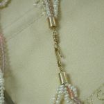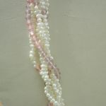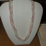 Pink White Lavender multi strand pearl 19″ from Borgata May Gallery New in box – the pink and lavendar are crystal beads and the other strands are tiny white fresh water pearls. Clasp is a gold tone hook and eye – easy to use. Each strand is approx. 3-4mm in width. Can be twisted or not twisted depending on your desired look. Never worn.
