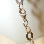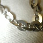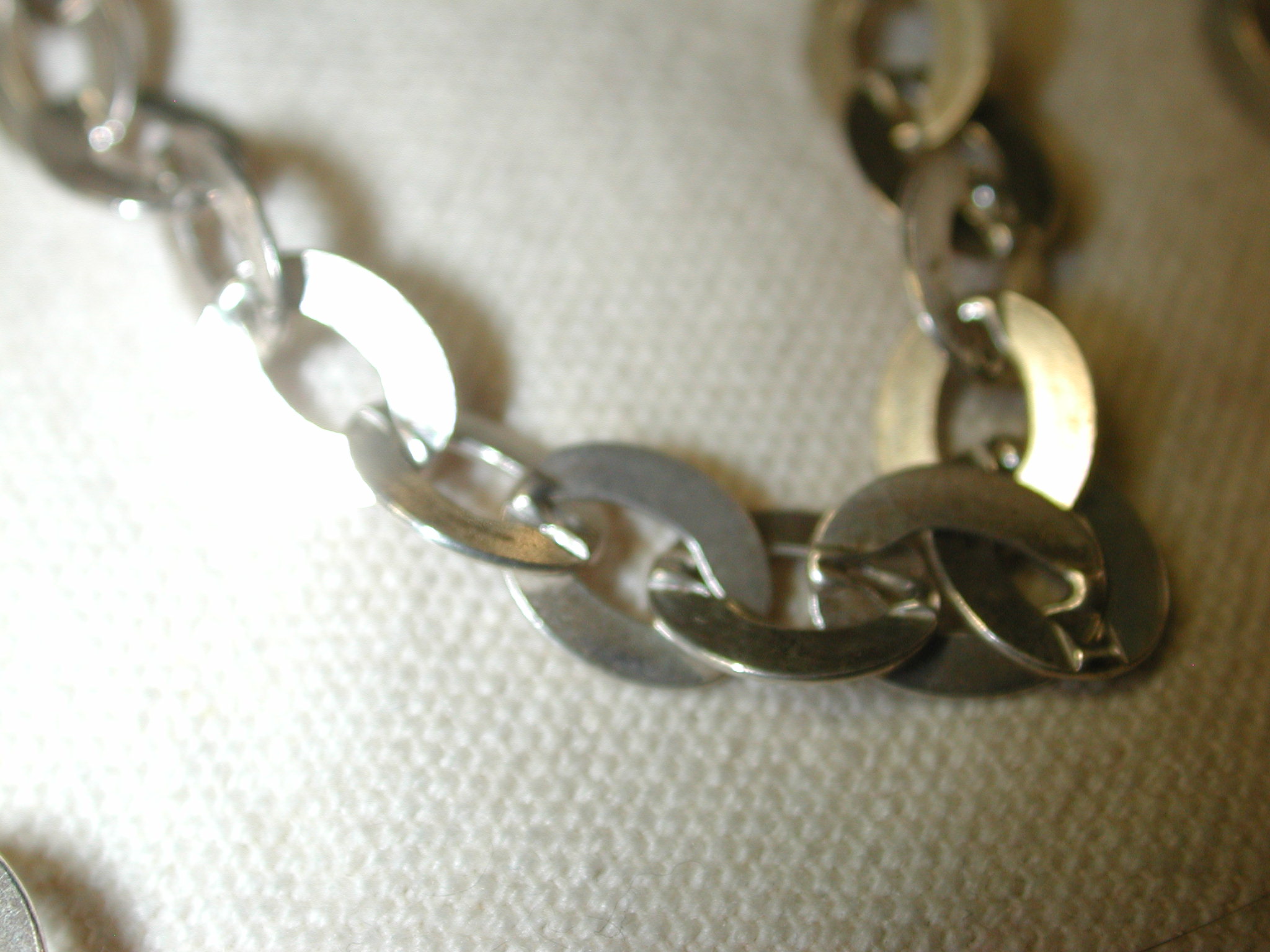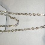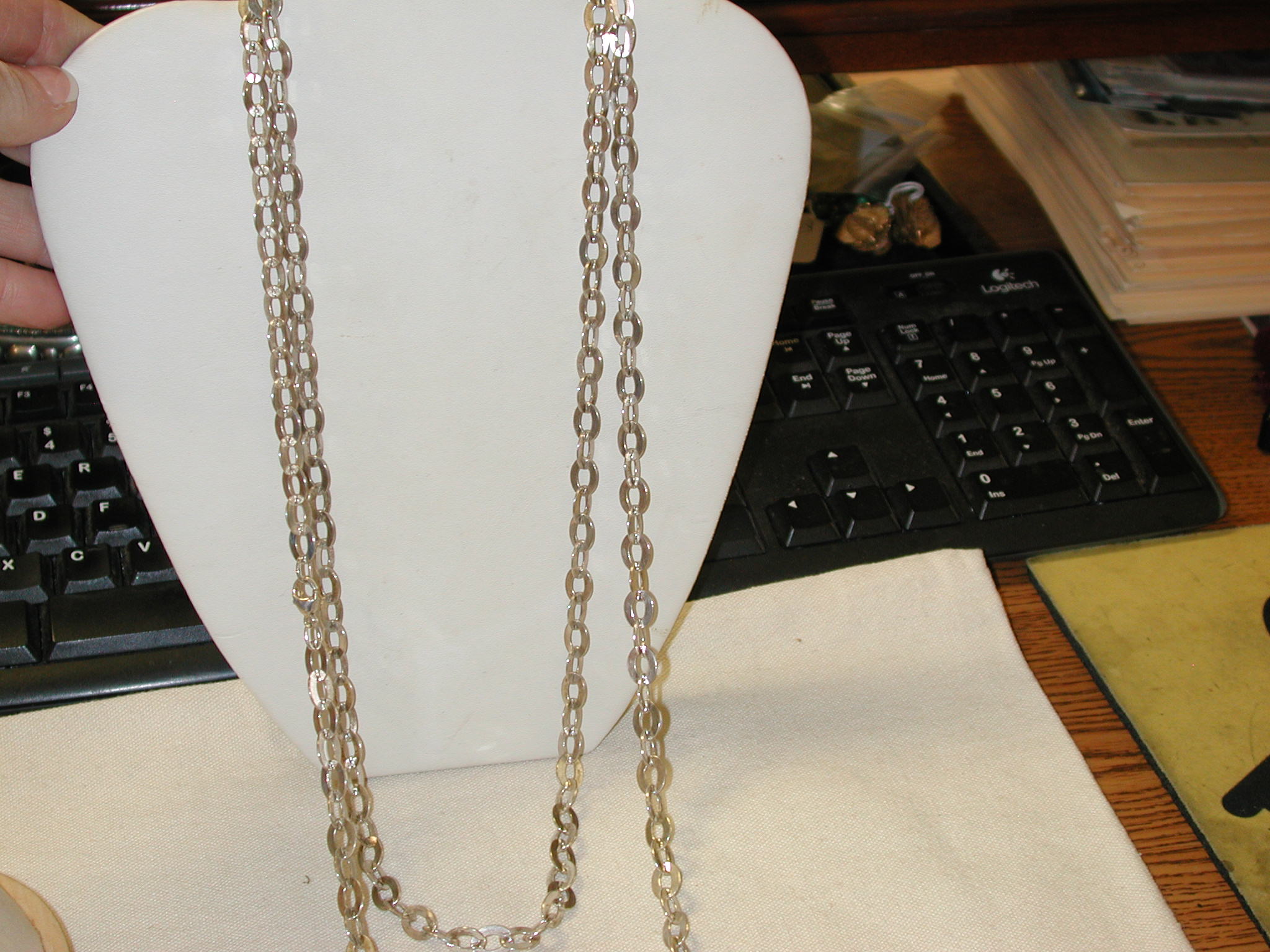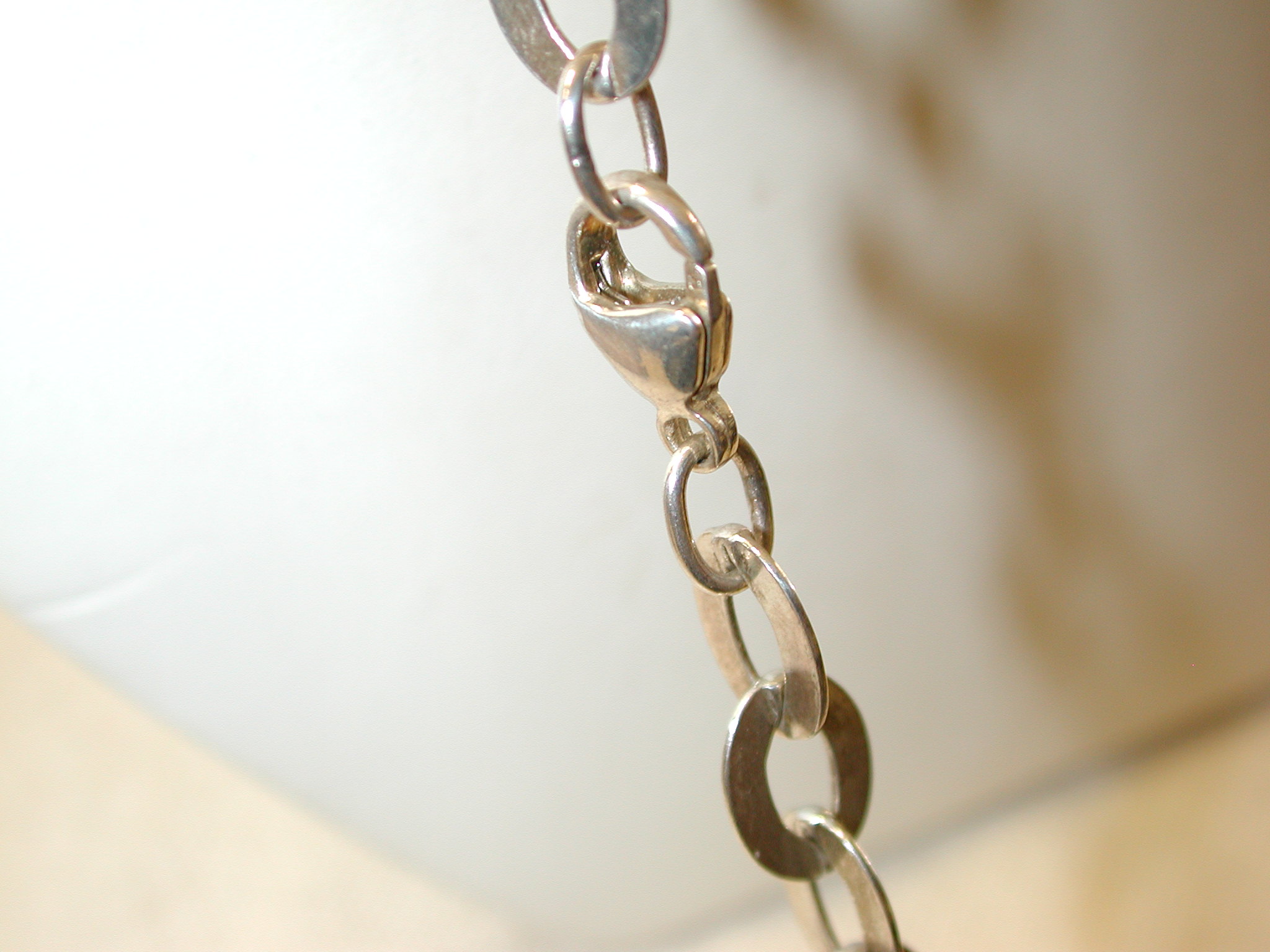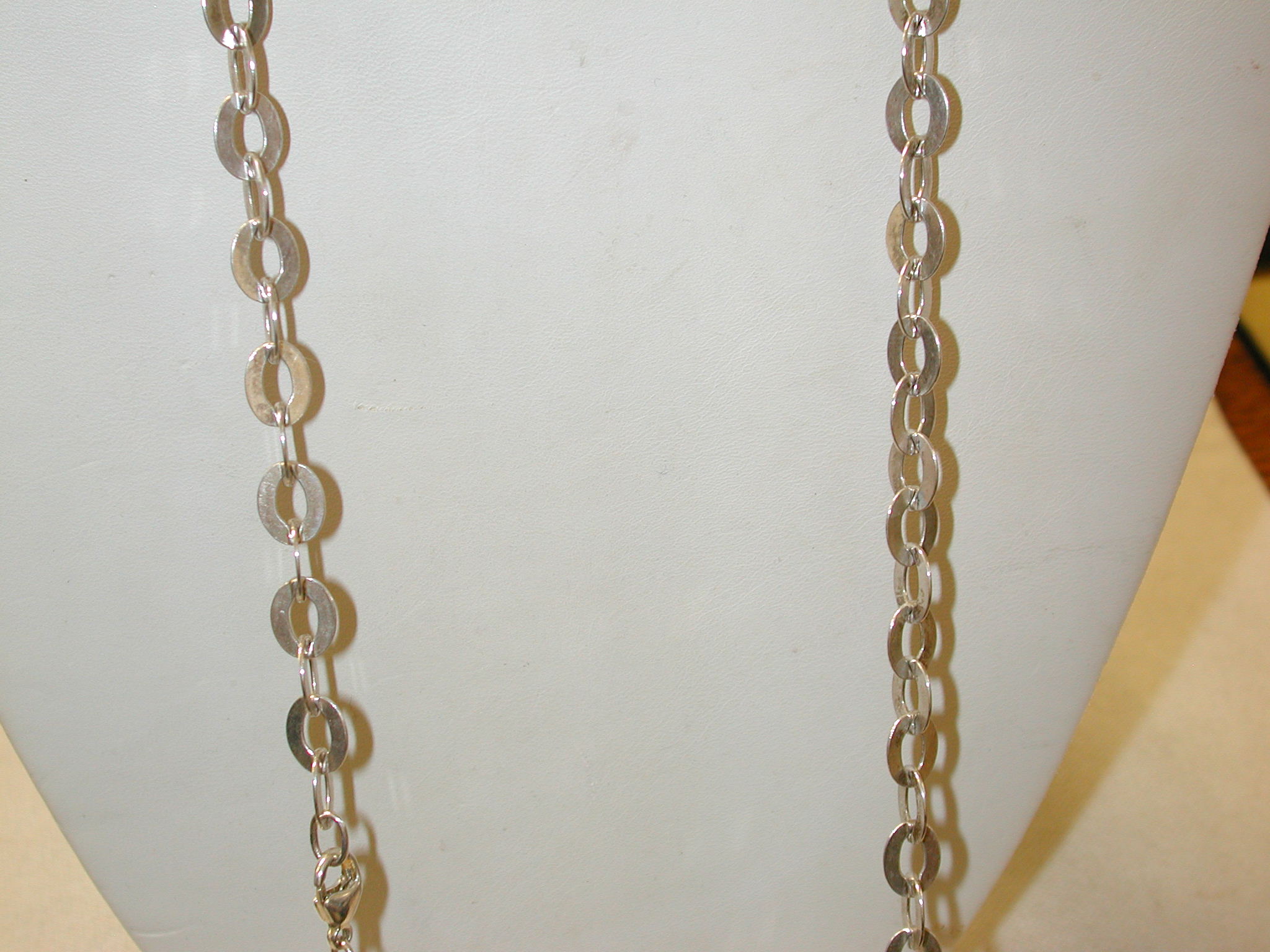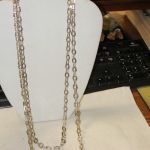 Sterling 60″ interlocking Oval chain belt – long necklace – 8mm wide – each loop is 8mm x 10mm oval and the overall length is 60inches! Each link interlocks with the next and they are all soldered together so its very well made and very sturdy. Could be worn double triple strand with charms – or as a chain belt – the lobster claw can be clipped anywhere on the chain so it can wrap around your waist and then hang down – lots and lots of fashion options with this one! They don’t make items like this any more given the cost of sterling silver. Hallmarked RC and 925 on clasp – probably an old Royal Chain product. Could use a polishing. Weighs 62 grams.