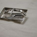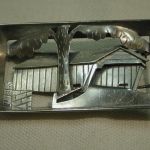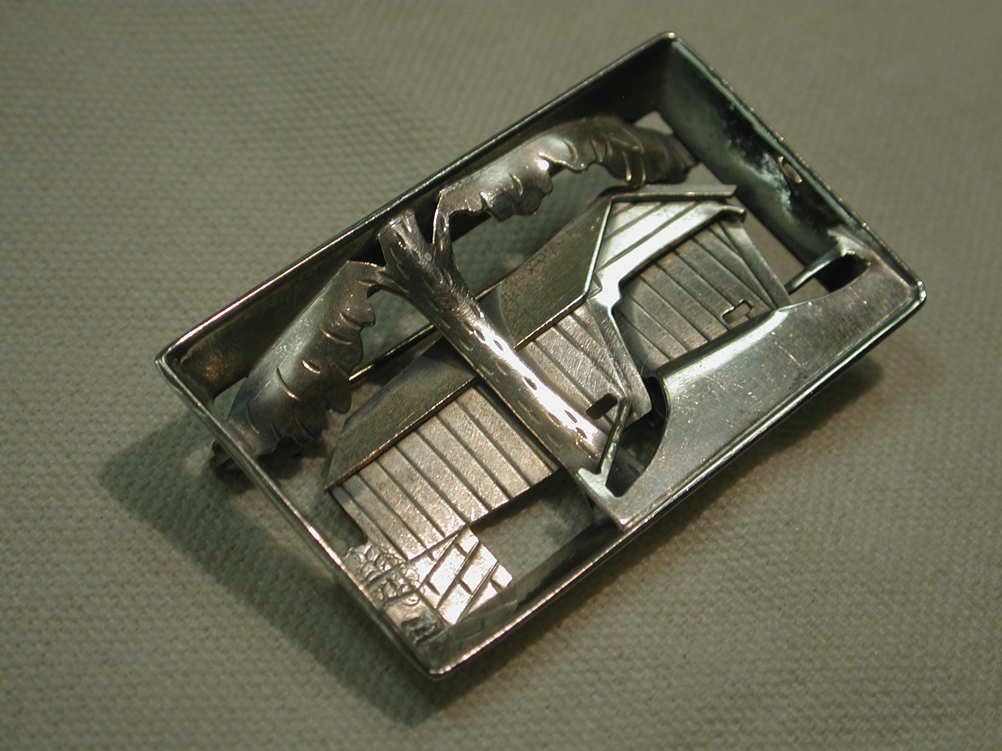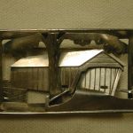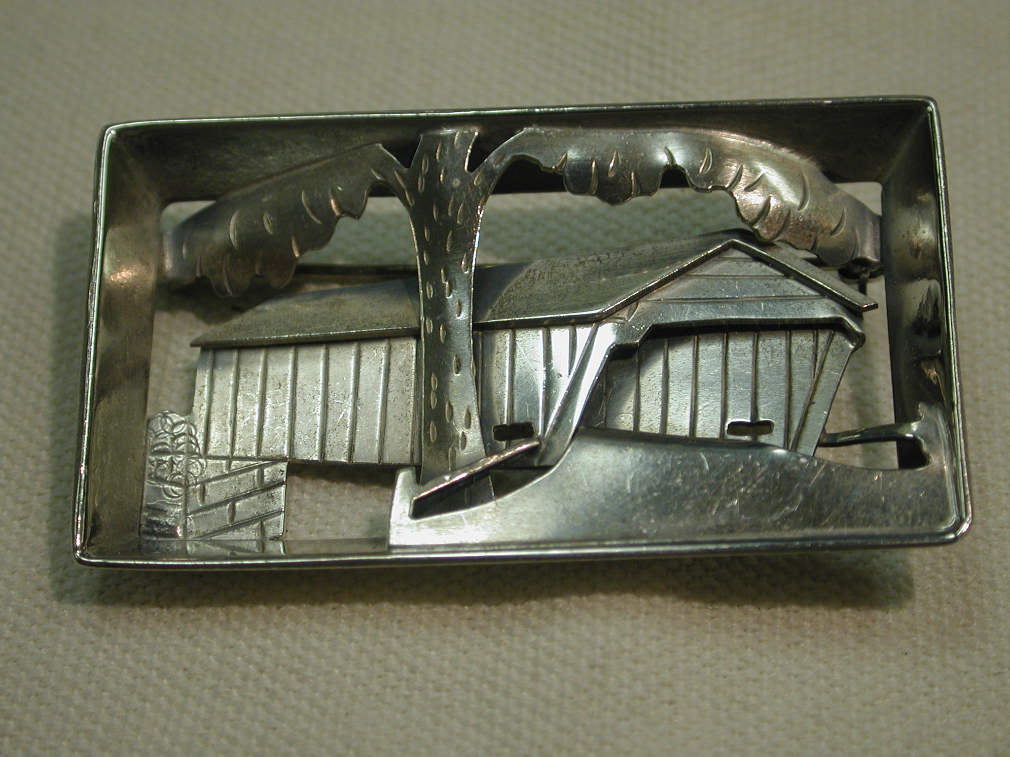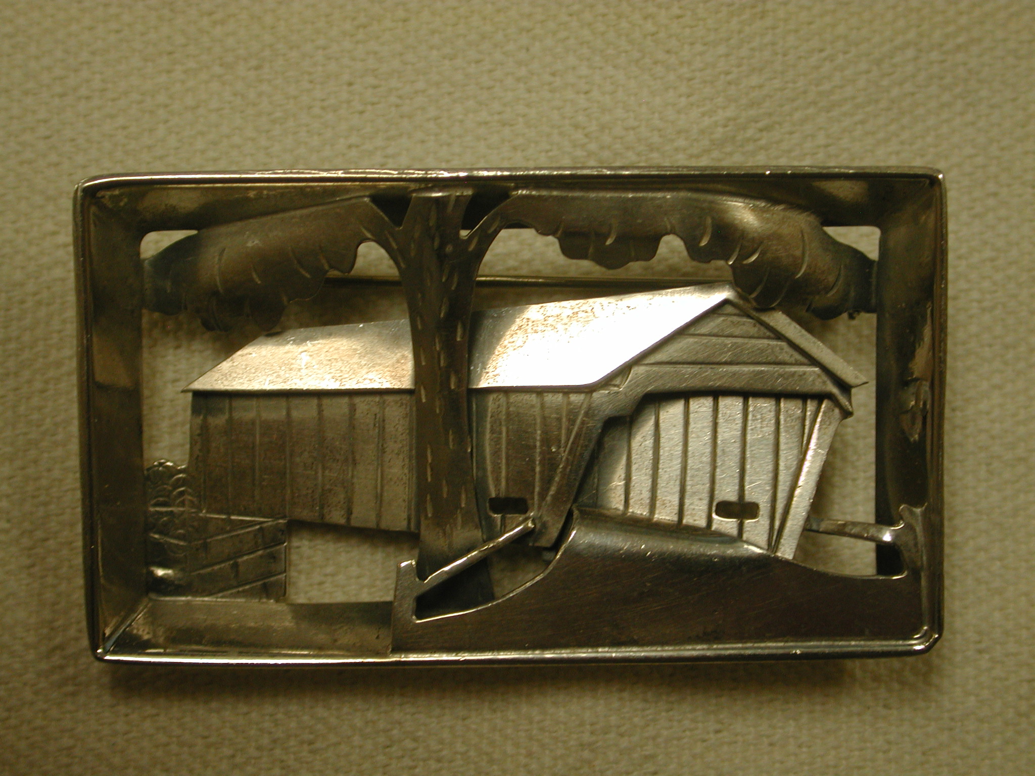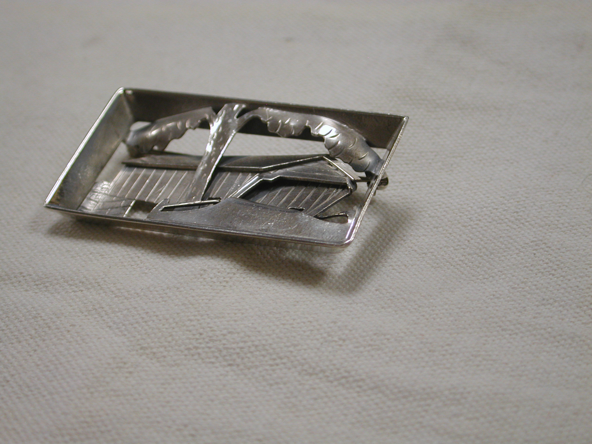 Sterling Modernist covered bridge 3D landscape framed brooch Signed AG – most unusual and handmade with exquisite details! Measures 2 1/4 x 1 1/4 rectangle and has a 6mm ‘frame’ around the three dimensional covered bridge scene. Hallmarked and tests sterling along with the artist’s hallmark of AG. No issues – the pin assembly is working as it should. Weighs 17.8 grams. A very distinctive creation!