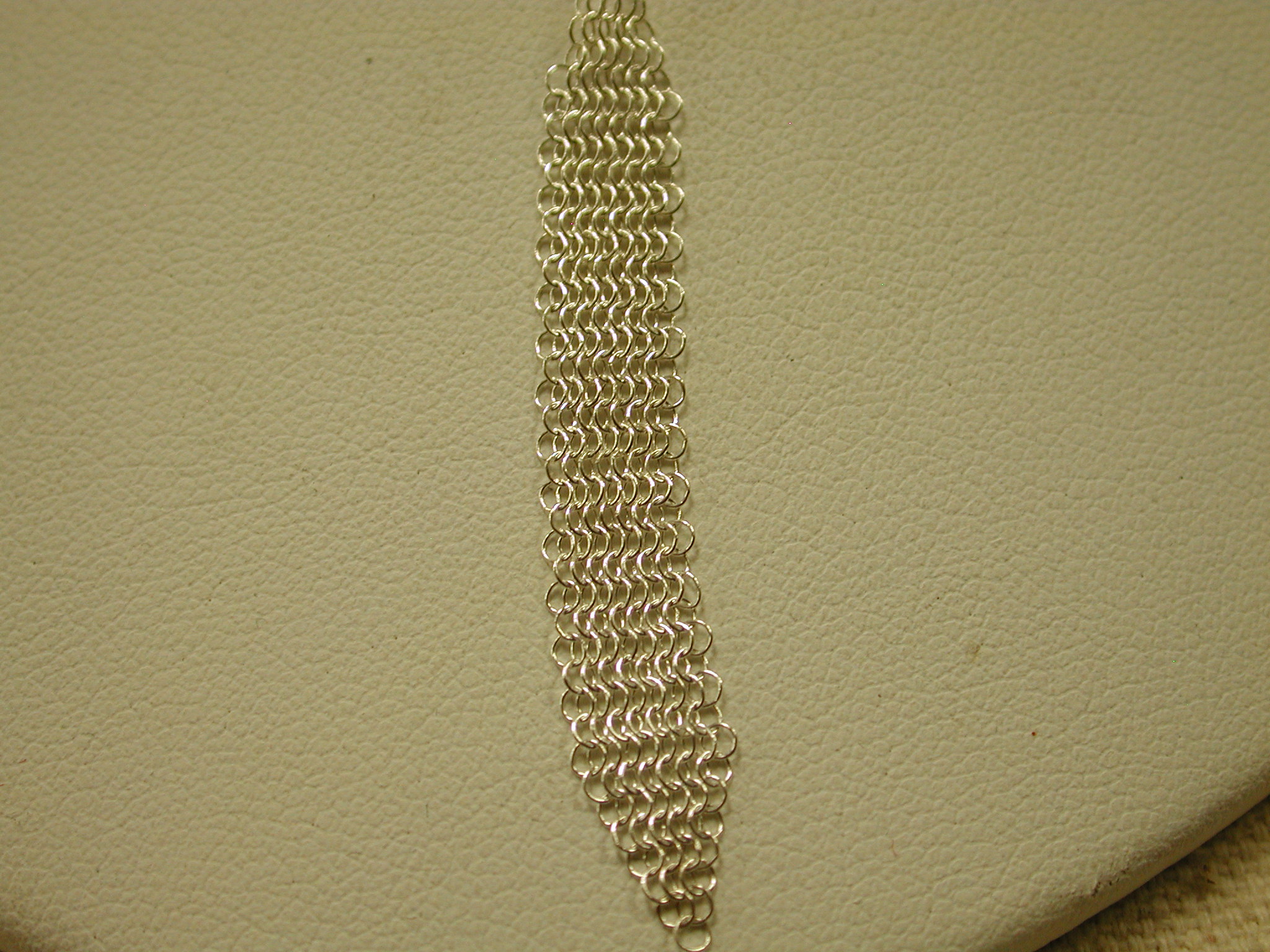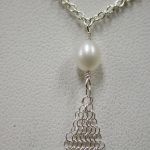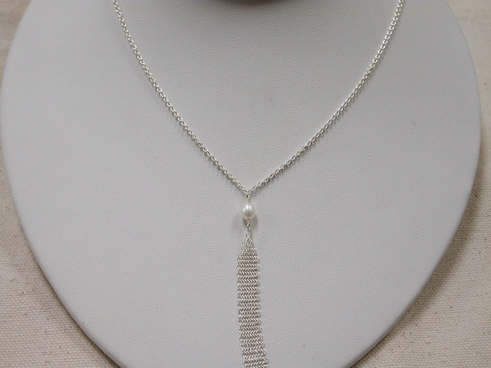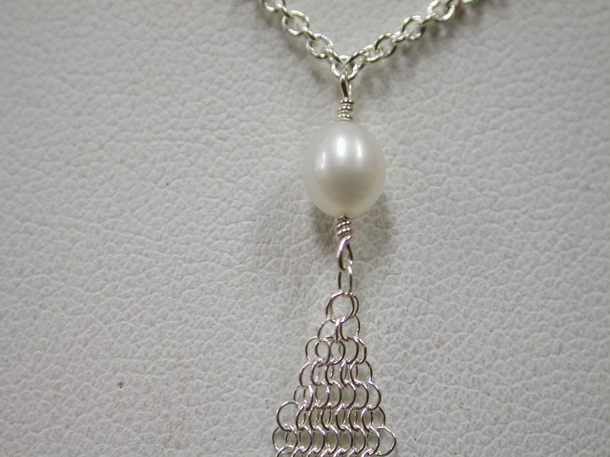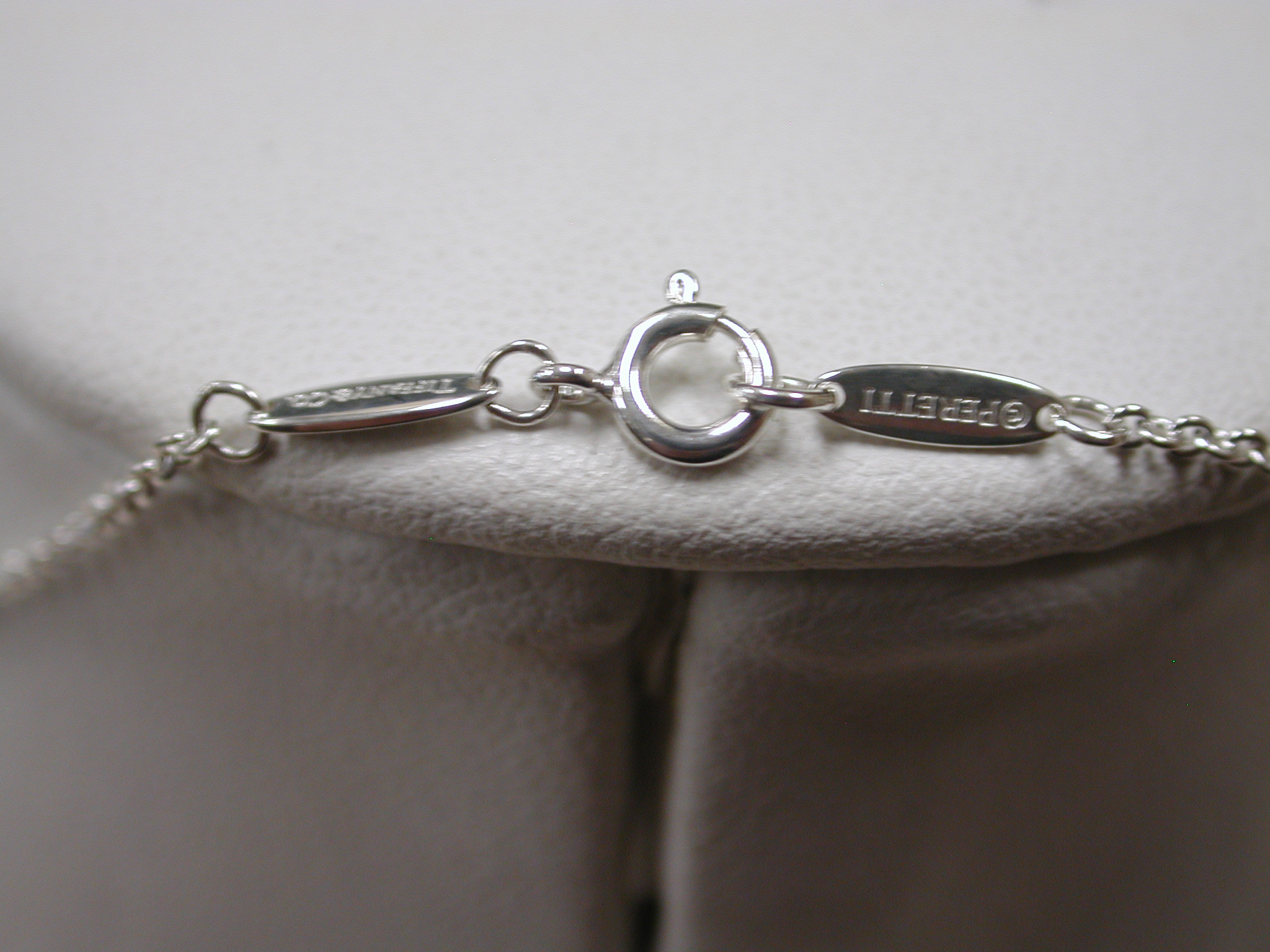 Tiffany & Co. Elsa Peretti mesh Necklace Sterling Silver – 16: long and the pearl and mesh dangle are 2 1/2 inches long. Hallmarked .925 Tiffany and Peretti. We have cleaned and polished and it will come in a Tiffany small pouch.