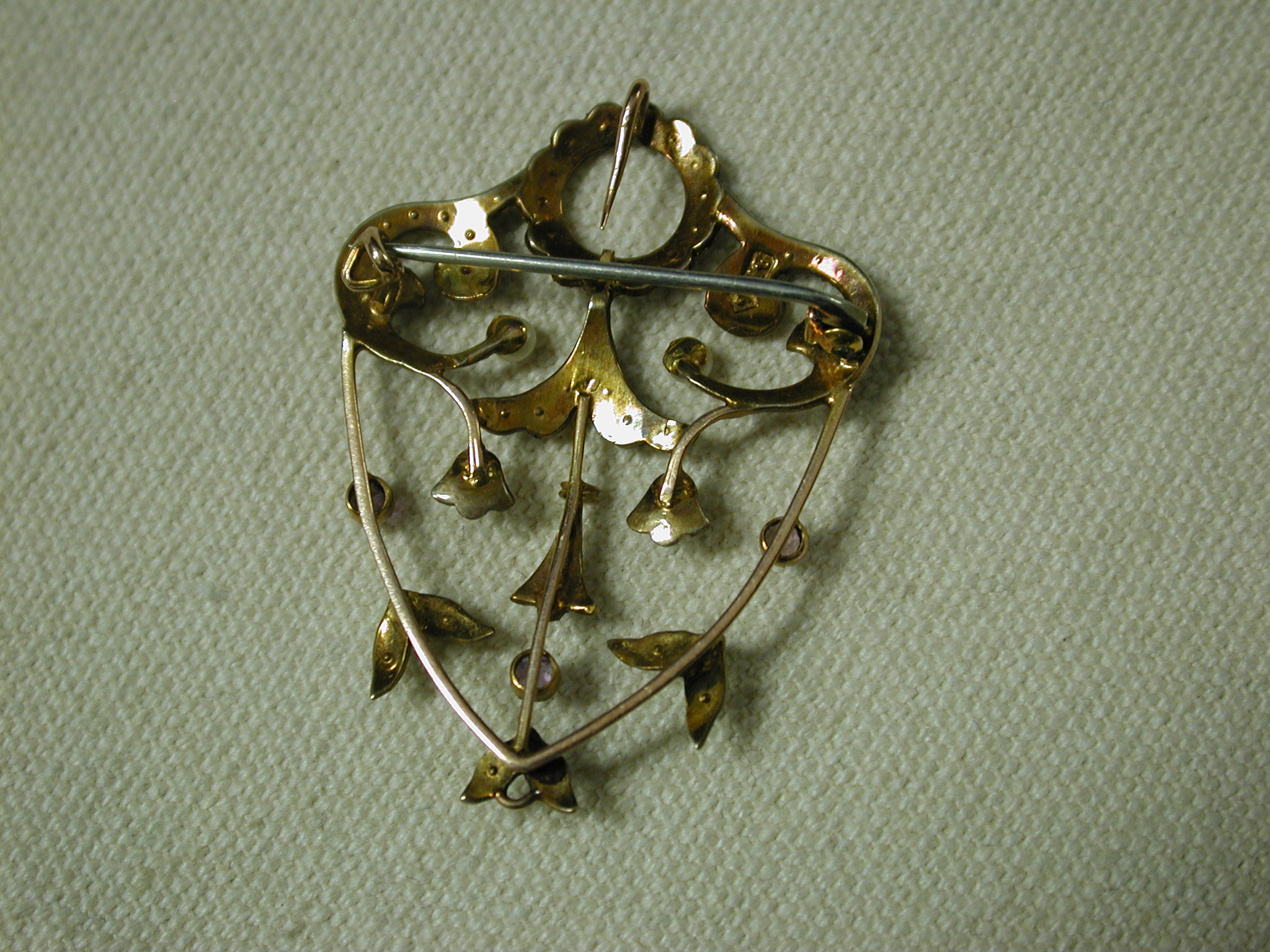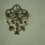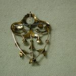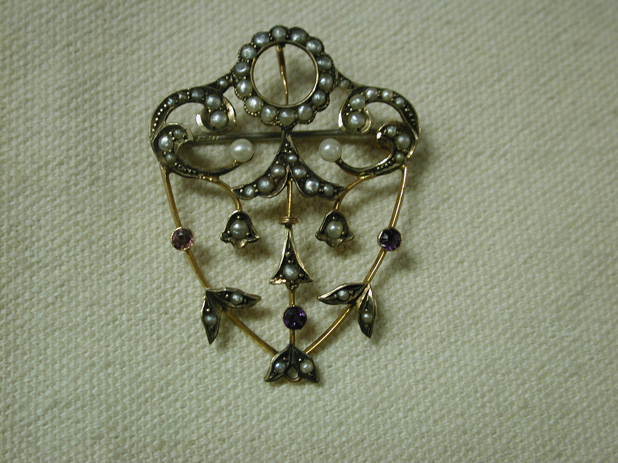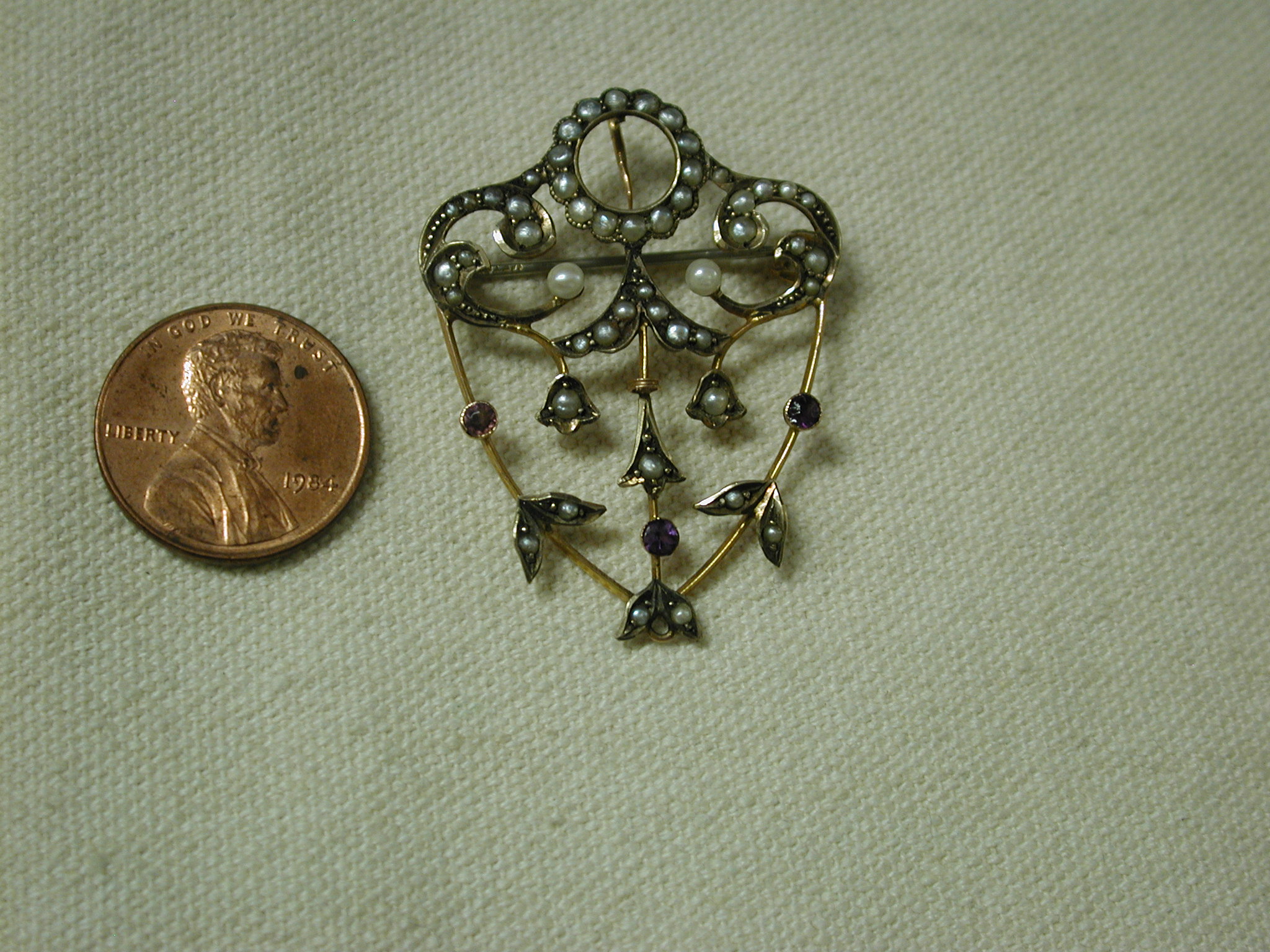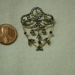 Very dainty and pretty – scrollwork filigree pin has seed pearls and round amethysts set in bezels. The piece is quite old and is hallmarked 9K – pin assembly is white metal (not gold) and is working as it should and the piece has a lavalier hanger to hang on pearls or a cord or chain. Measures 1 1/2 long by 1 1/4 inches wide. Weighs 3.34 grams. There is one very tiny seed pearl missing but you don’t notice it unless you are looking for it – the amethysts are original and do have some abrasions and chips. We have NOT cleaned or polished as to keep its original victorian patina.