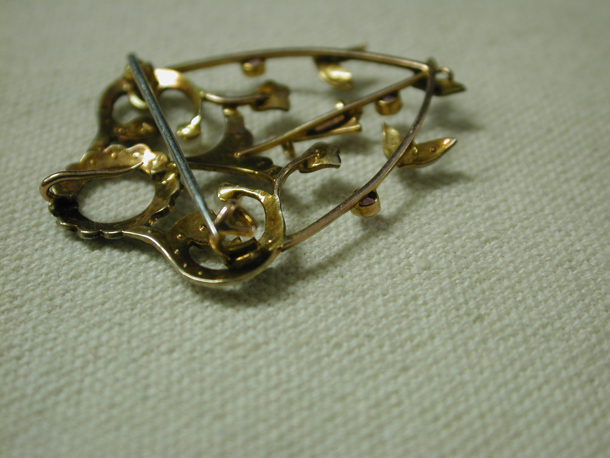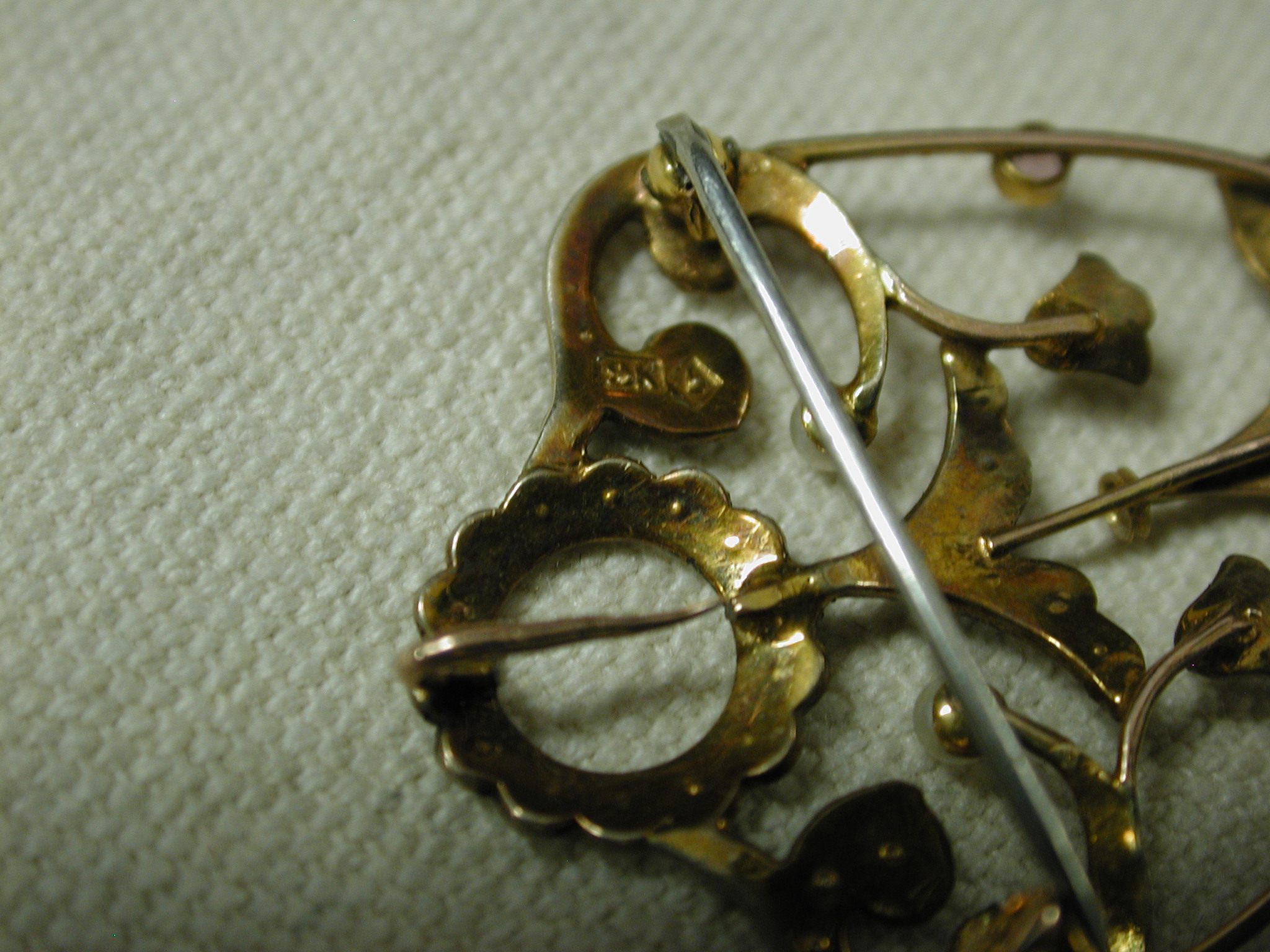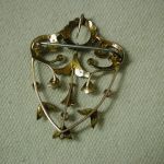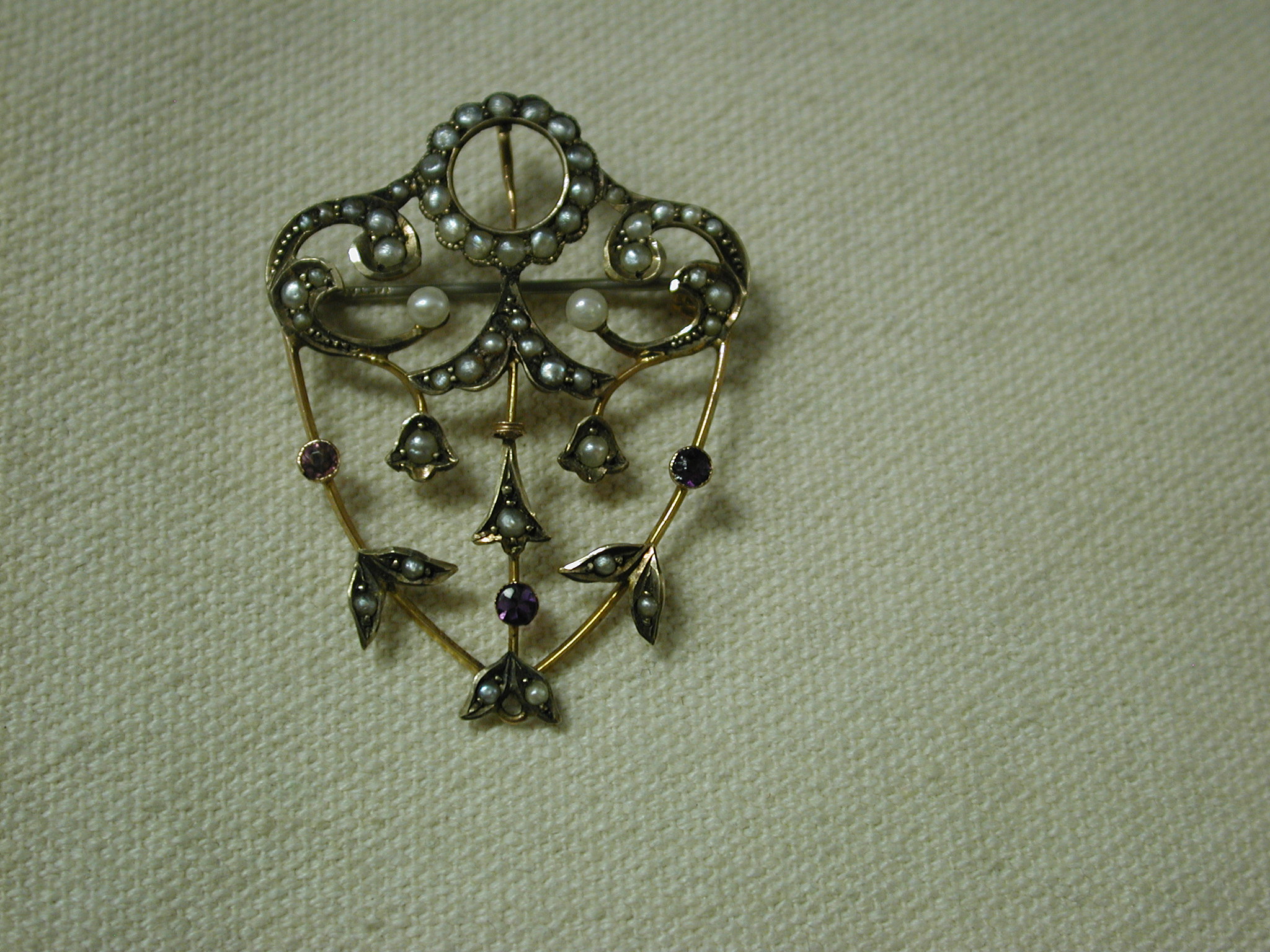 Very dainty and pretty – scrollwork filigree pin has seed pearls and round amethysts set in bezels. The piece is quite old and is hallmarked 9K – pin assembly is white metal (not gold) and is working as it should and the piece has a lavalier hanger to hang on pearls or a cord or chain. Measures 1 1/2 long by 1 1/4 inches wide. Weighs 3.34 grams. There is one very tiny seed pearl missing but you don’t notice it unless you are looking for it – the amethysts are original and do have some abrasions and chips. We have NOT cleaned or polished as to keep its original victorian patina.