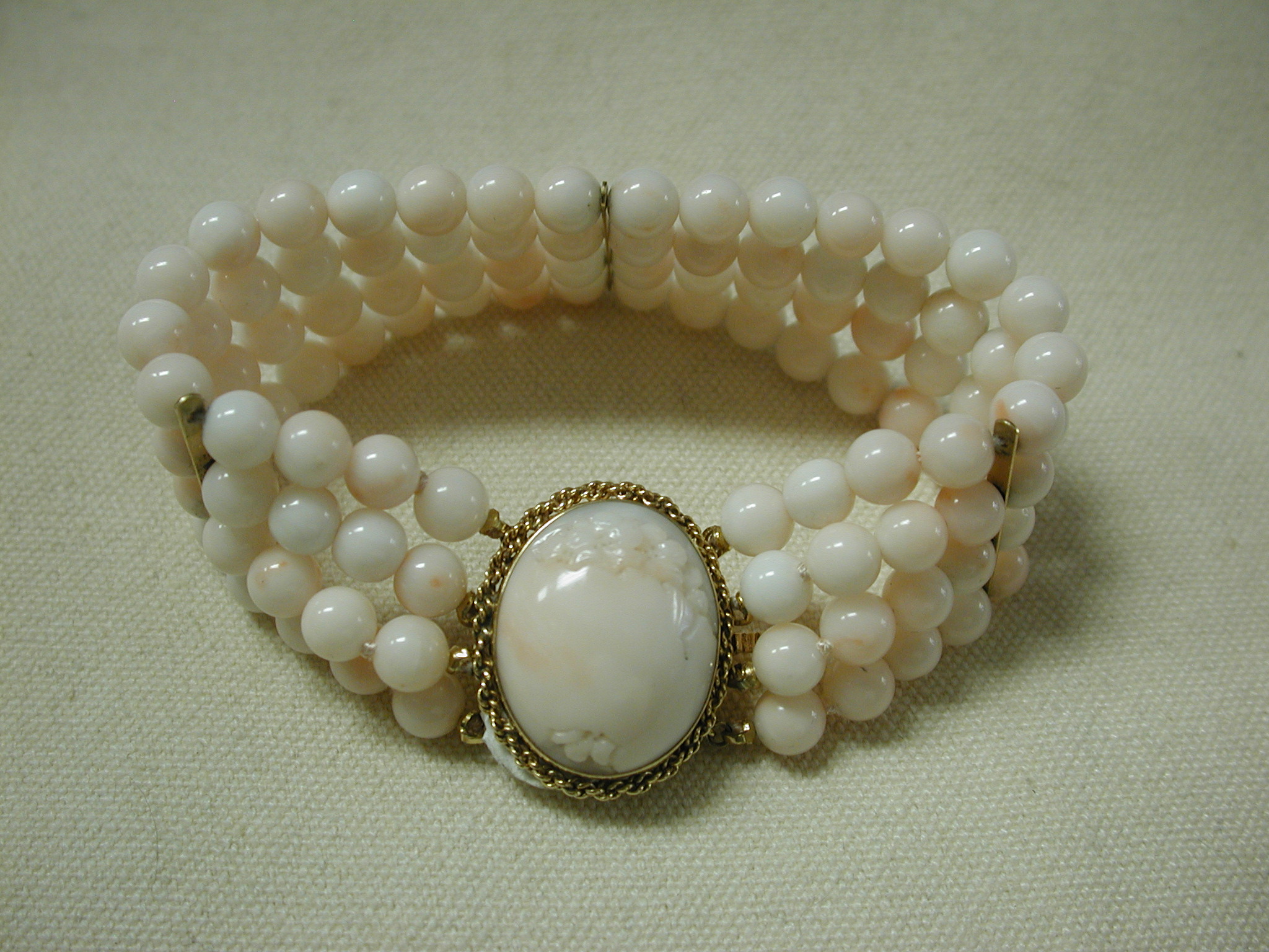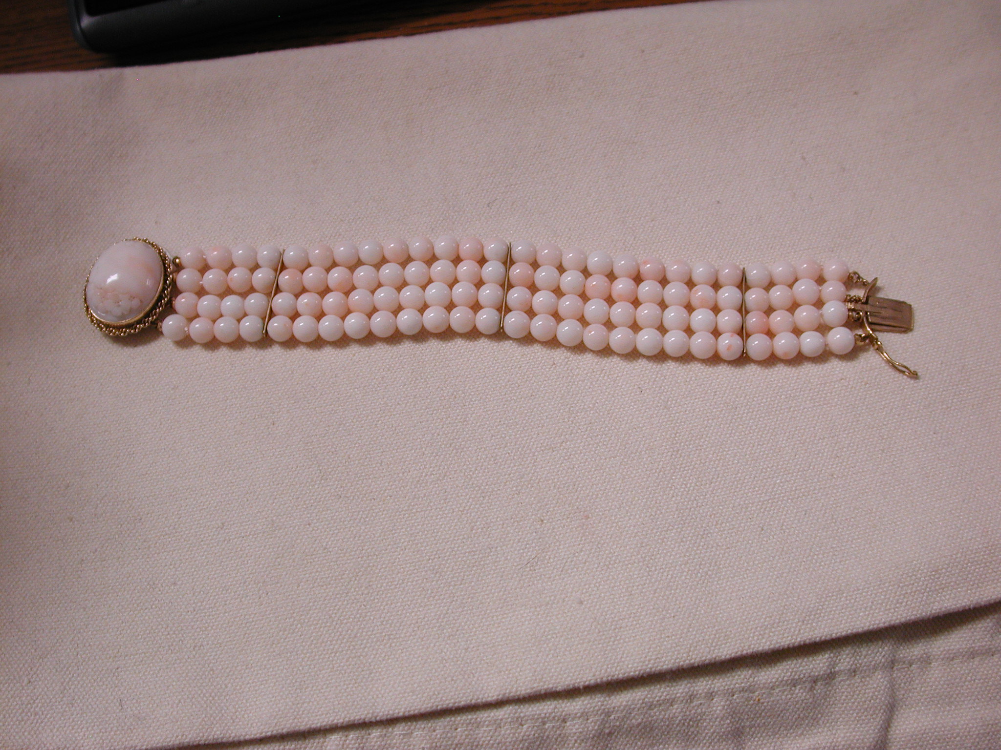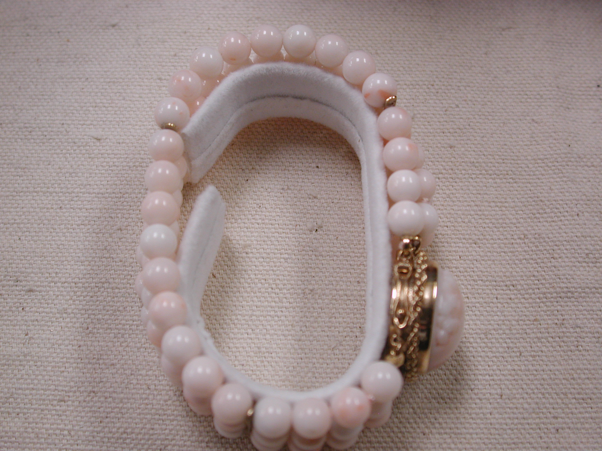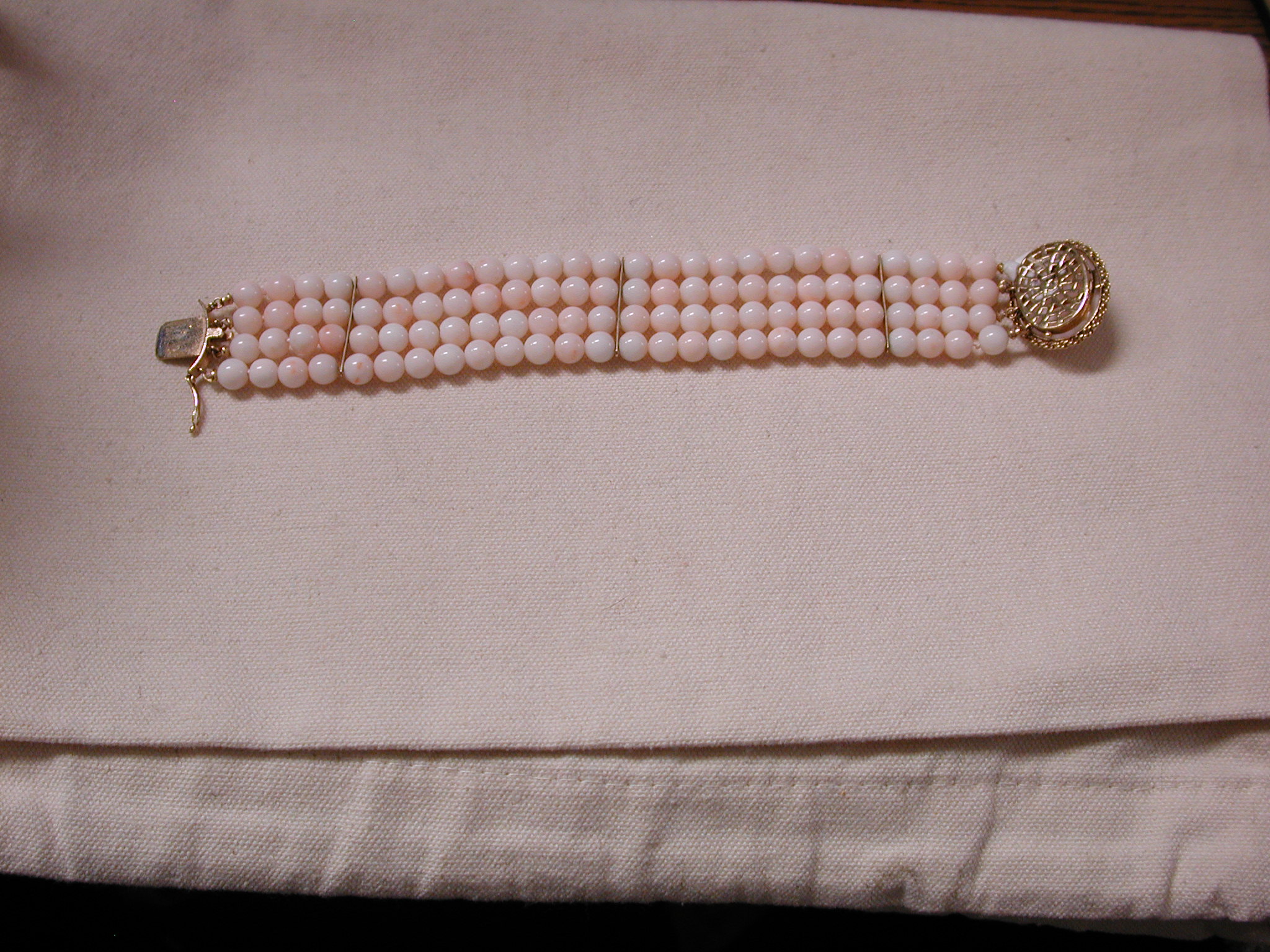 Pale white and peach coral beaded cuff bracelet with four rows of 6mm round beads. 14kt gold spacers to keep the bracelet like a cuff. Center oval coral piece has little carved flowers and is about 1 inch by 3/4 inch oval – the carving is not very orate Clasp has safety figure 8 and all is working fine.  this looks absolutely amazing on!