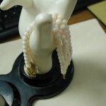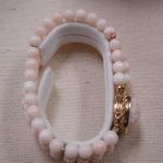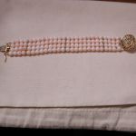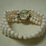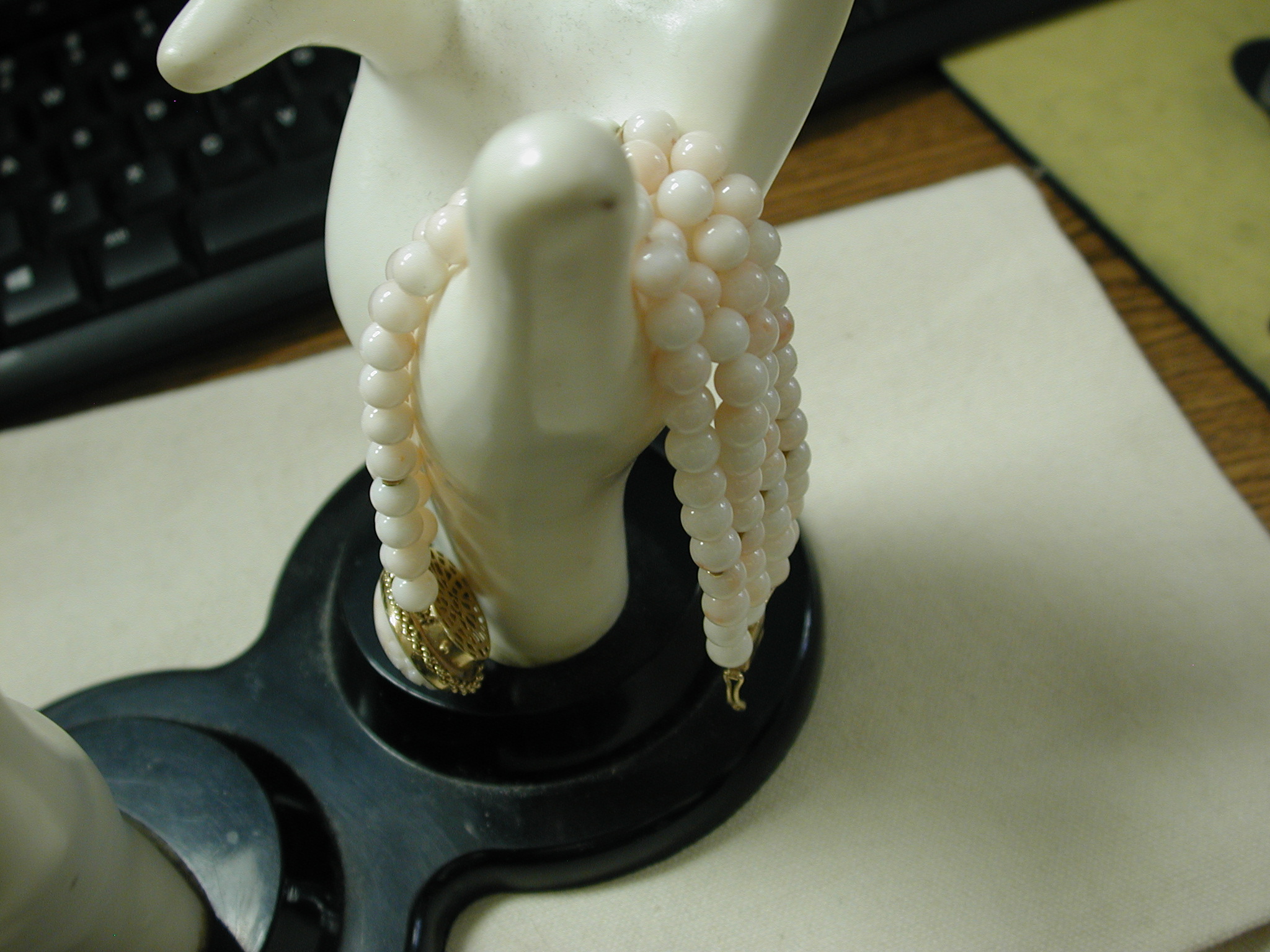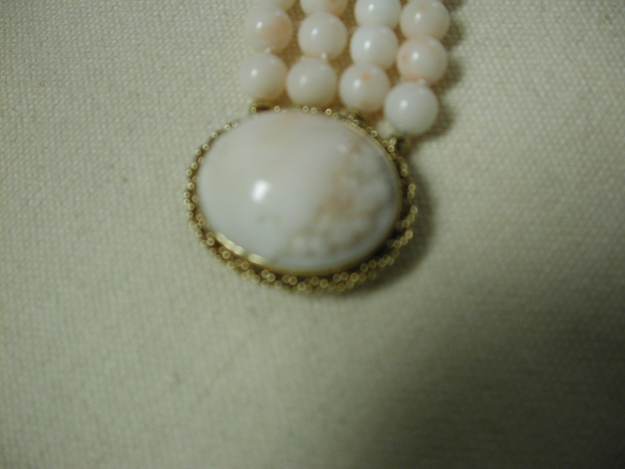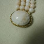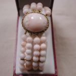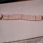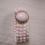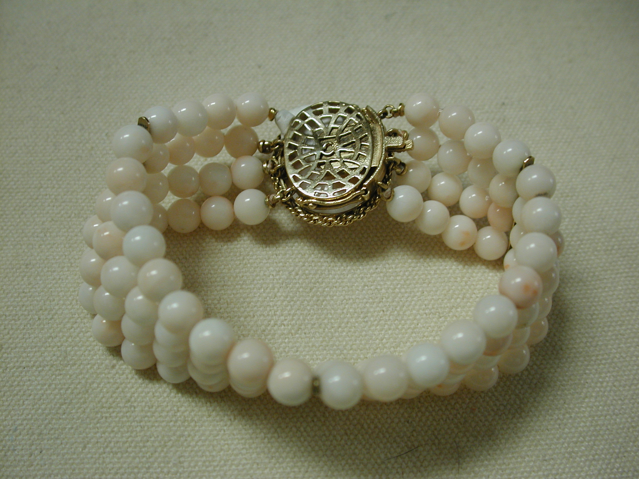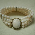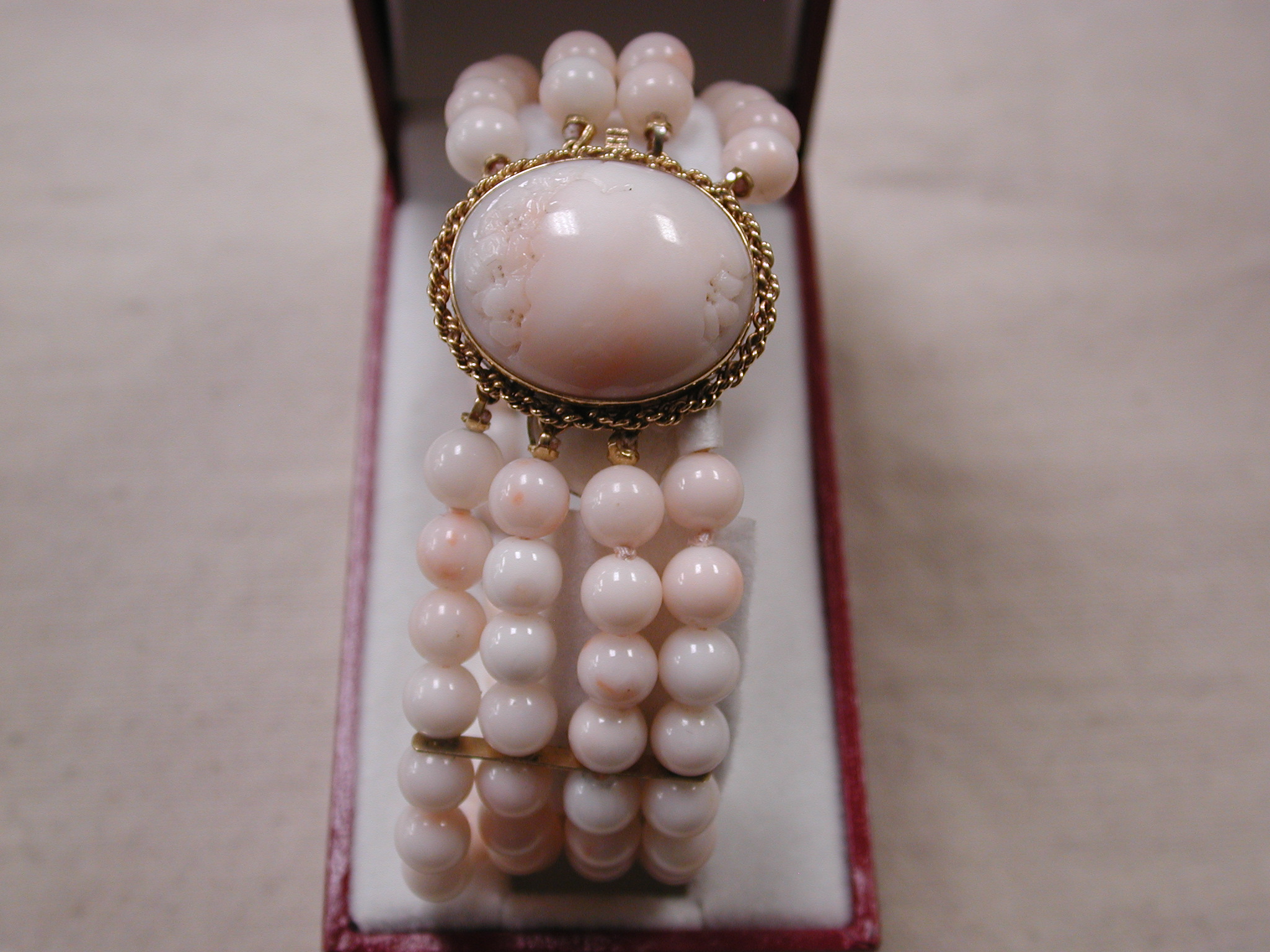 Pale white and peach coral beaded cuff bracelet with four rows of 6mm round beads. 14kt gold spacers to keep the bracelet like a cuff. Center oval coral piece has little carved flowers and is about 1 inch by 3/4 inch oval – the carving is not very orate Clasp has safety figure 8 and all is working fine.  this looks absolutely amazing on!