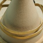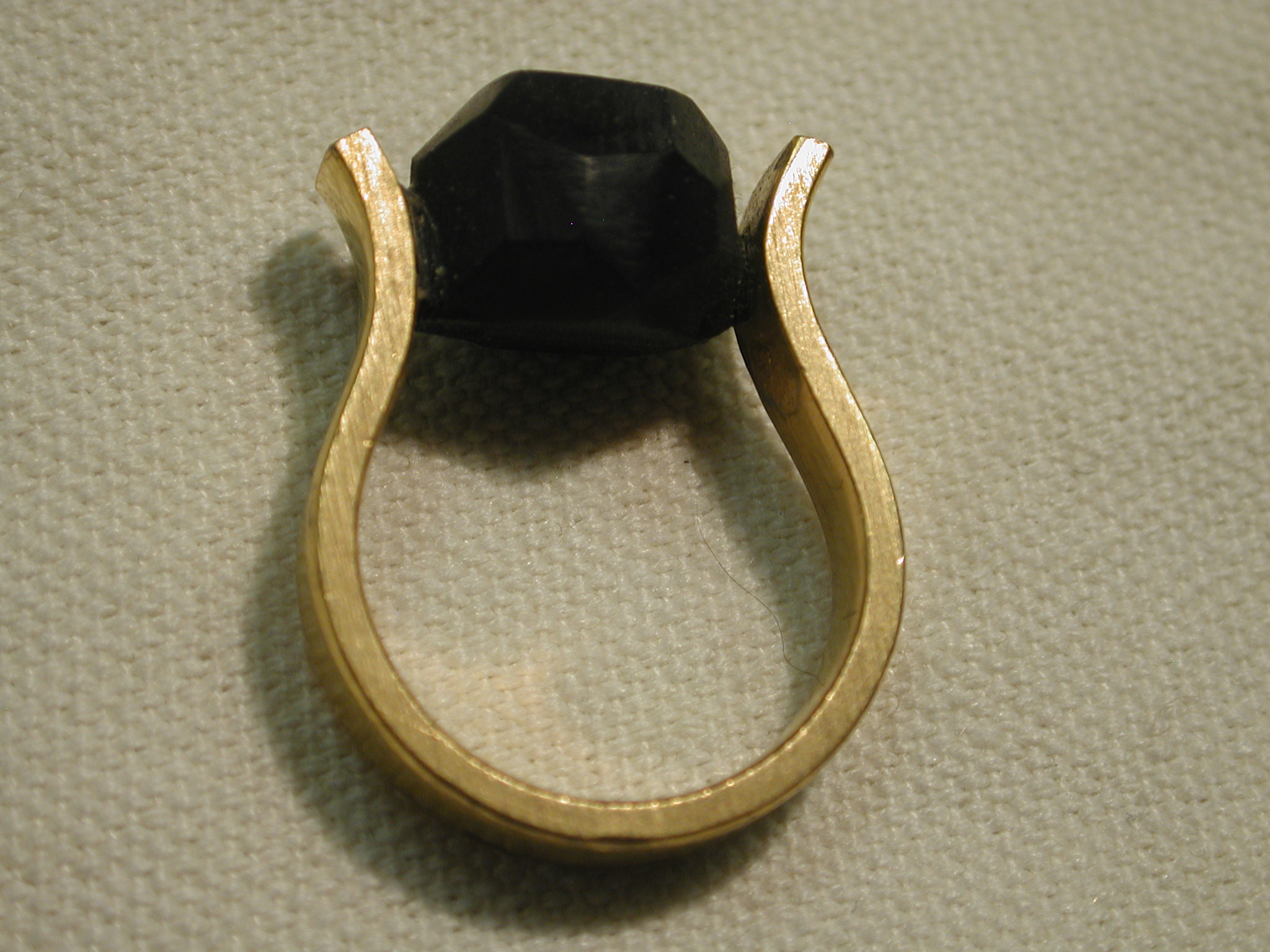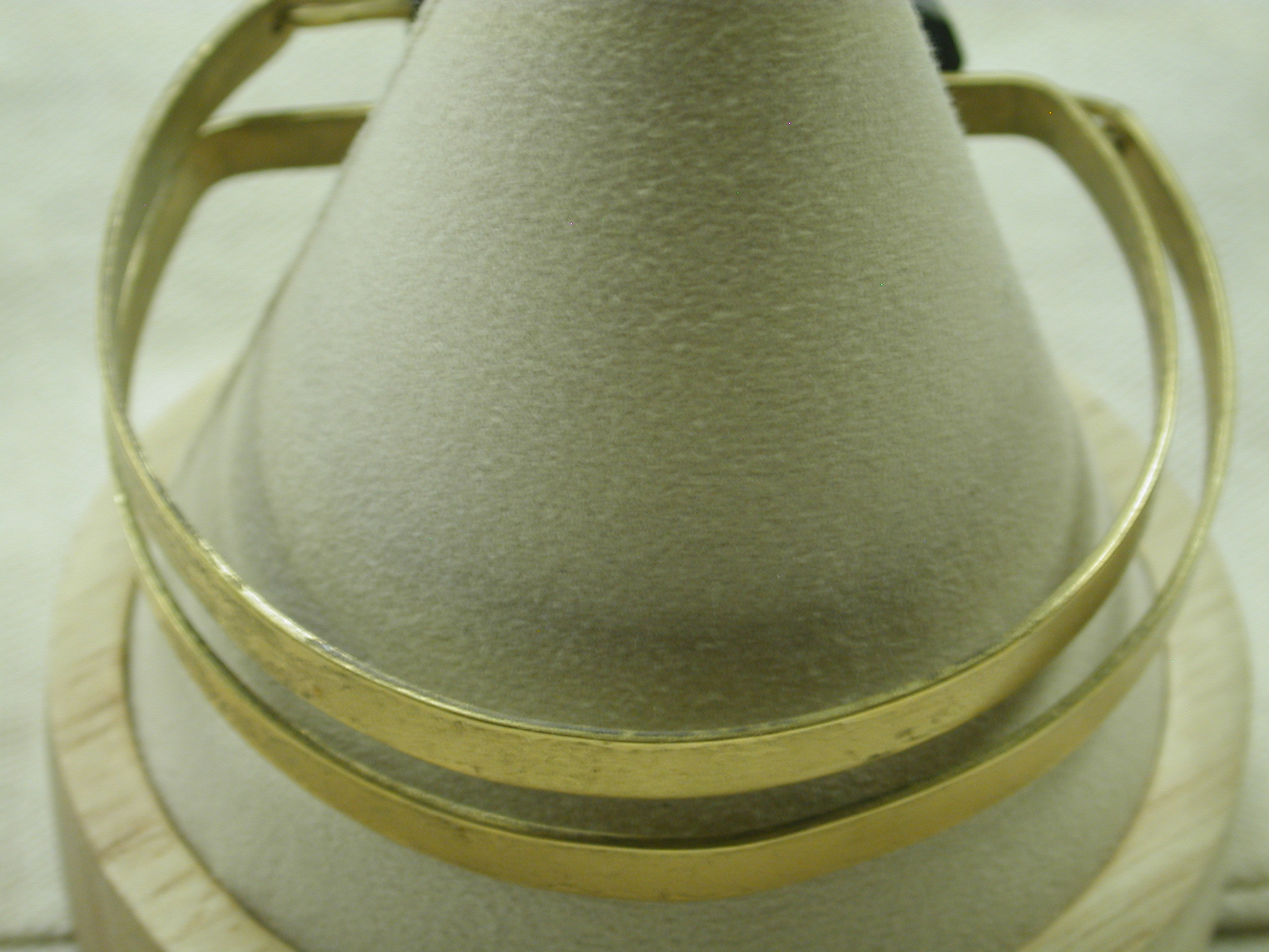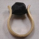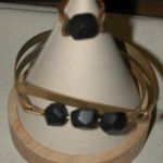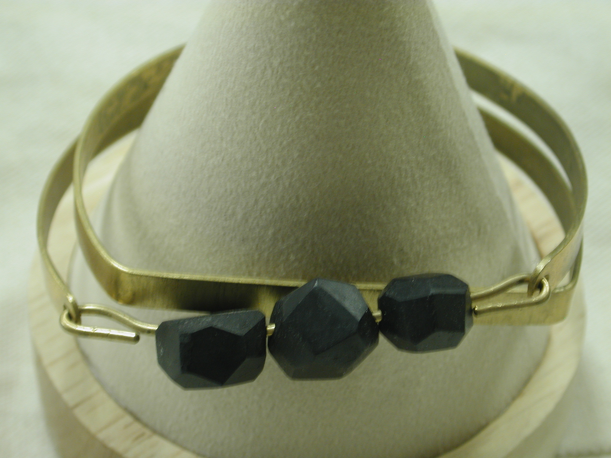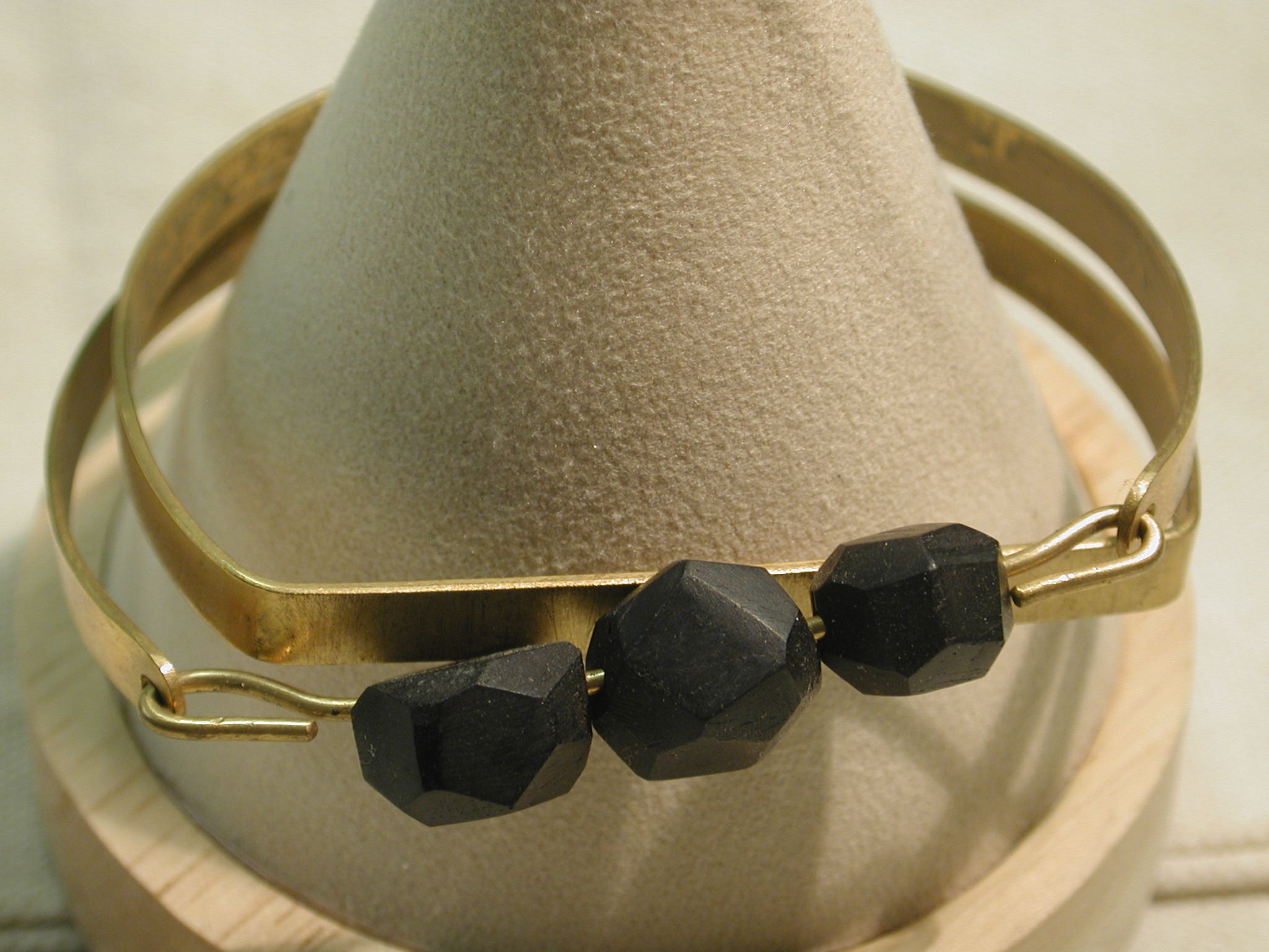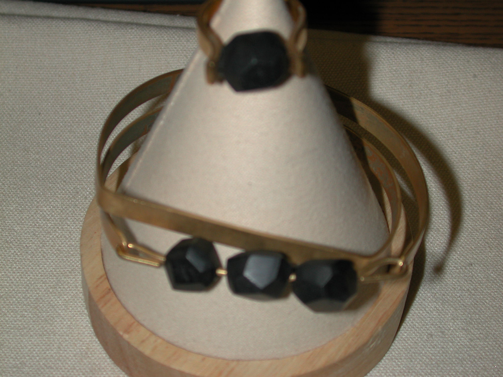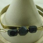 Modern – Gold Black hexagonal bead geometric bangle bracelet and floating ring set – unusual unsigned flexible metal bracelet with three assymetrically cut black beads (not plastic or a stone – appears to be wood I think) largest is 10mm and graduates to 8mm. Slip on bangle for a petite wrist (will not fit a large wrist). Gold plated brass I believe. Matching ring is a size 9 1/2 so if you have a petite wrist this ring is for your thumb or larger fingers.  Some minor abrasions from wear.