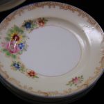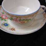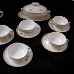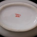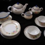 Vintage Tea Set Japan set of 23 pcs plates-serving pieces like new – this is a 23 piece set with 6 teacups 2 1/4 inches with 3 3/4 inch saucers, 6 – 4 1/4″ plates, one teapot 6 inches, sugar and creamer, 5 1/2 inch covered oval serving dish on a 6 inch oval platter, and a 4 1/2 inch syrup bowl. I do not see any issues except one teacup has a slight internal hairline crack. Some pieces are stamped made in Japan in red ink and most don’t have any markings. An adorable set for a child or as a demitasse set for adults.