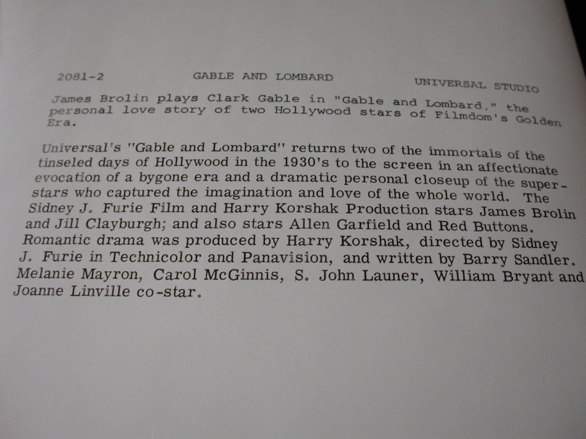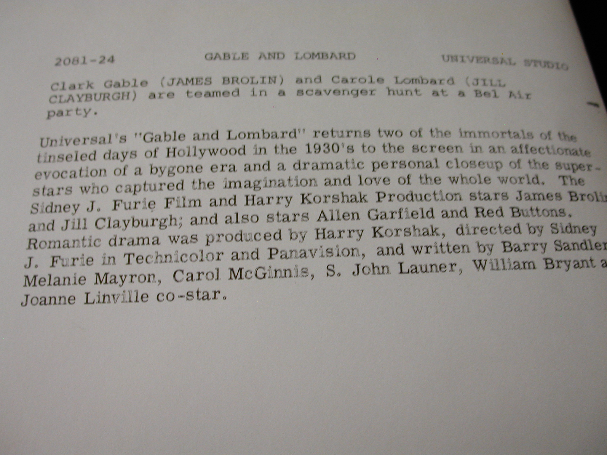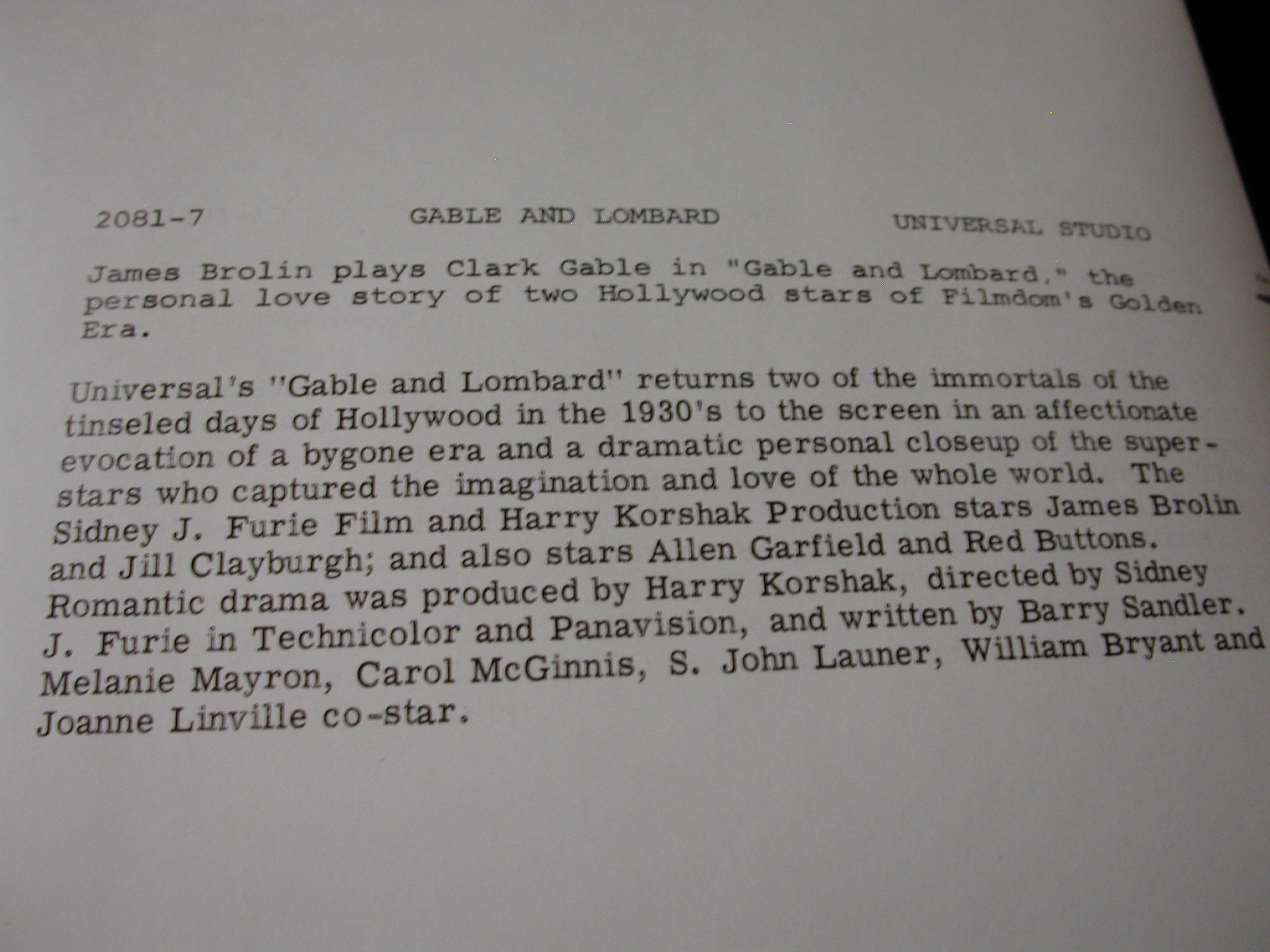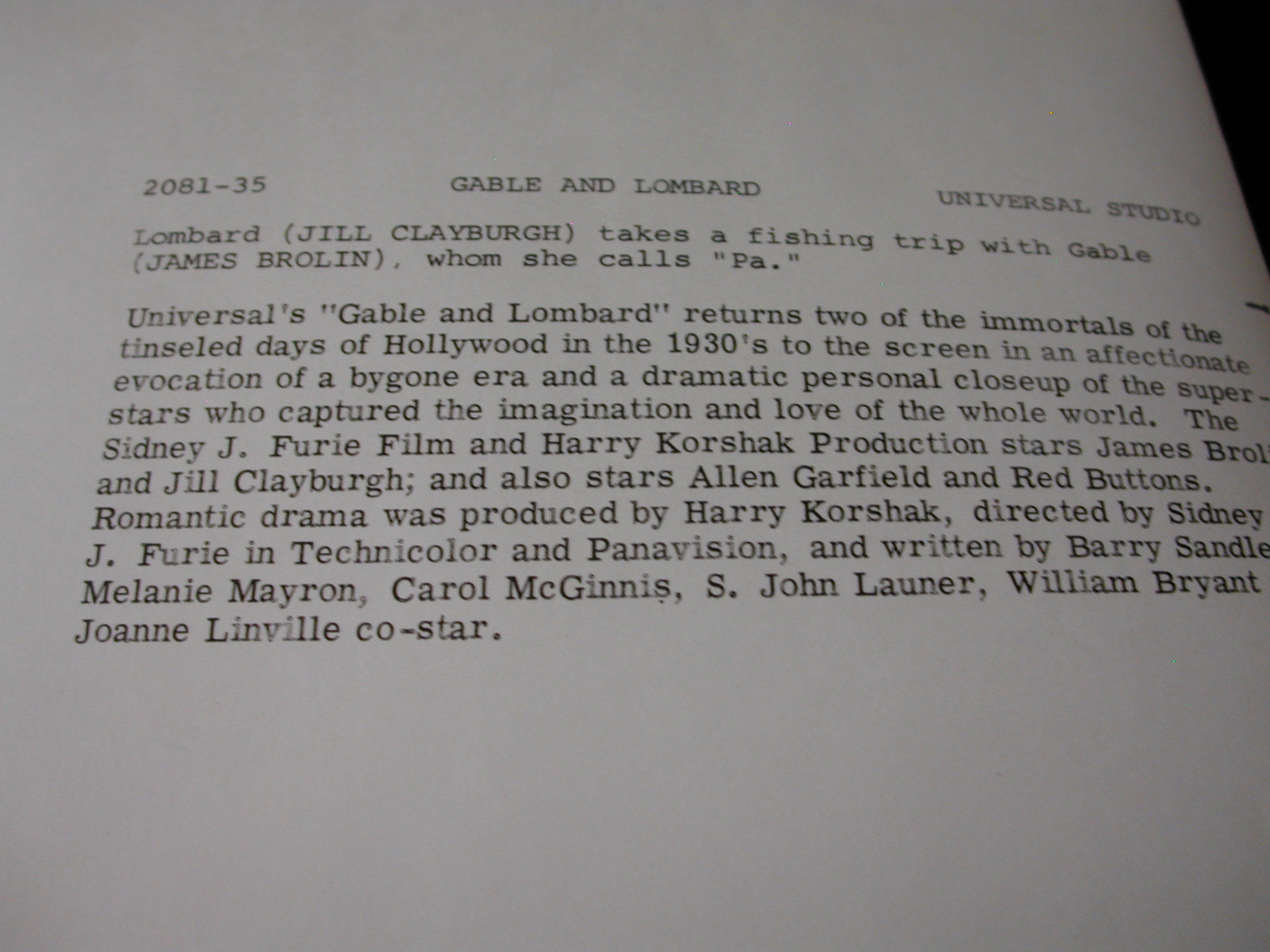 James Brolin Jill Claryburgh “Gable + Lombard” Photos Lot of 10 – Universal Pictures copyright from 1976 – each photo has a description on the back
