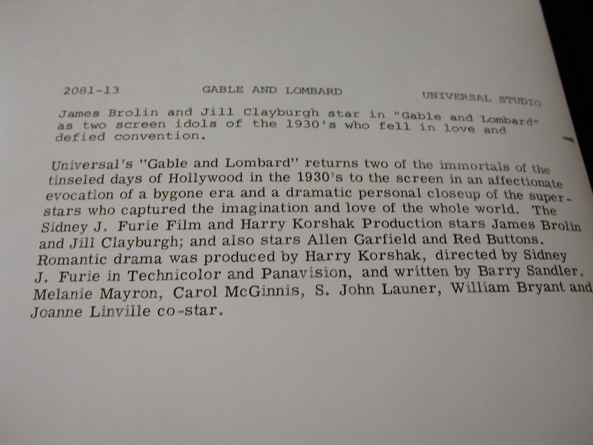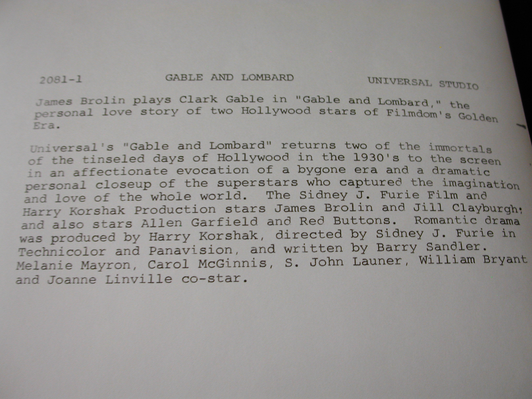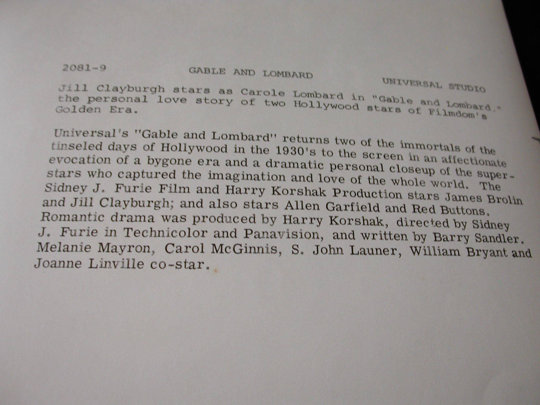 James Brolin Jill Claryburgh “Gable + Lombard” Photos Lot of 10 – Universal Pictures copyright from 1976 – each photo has a description on the back