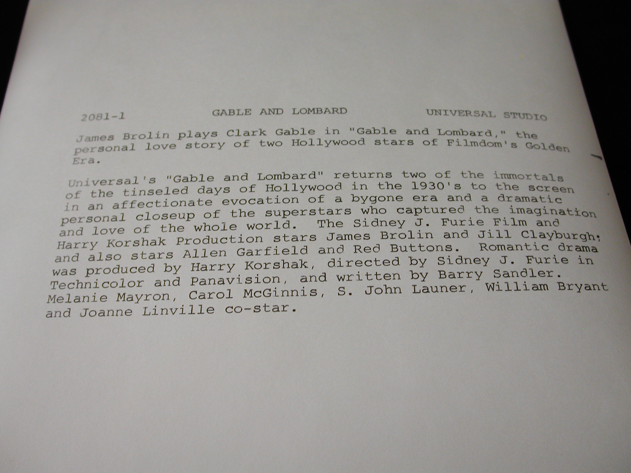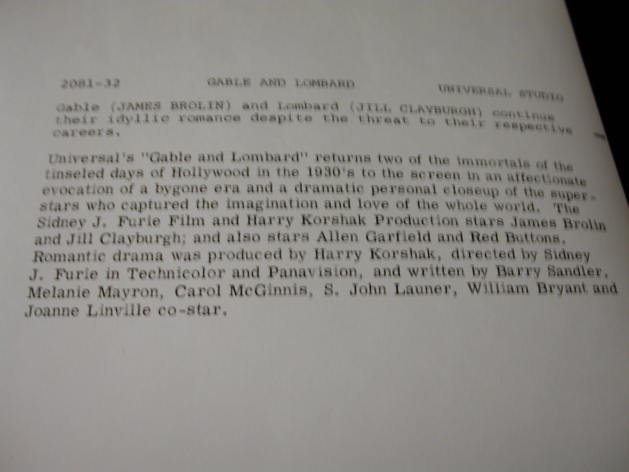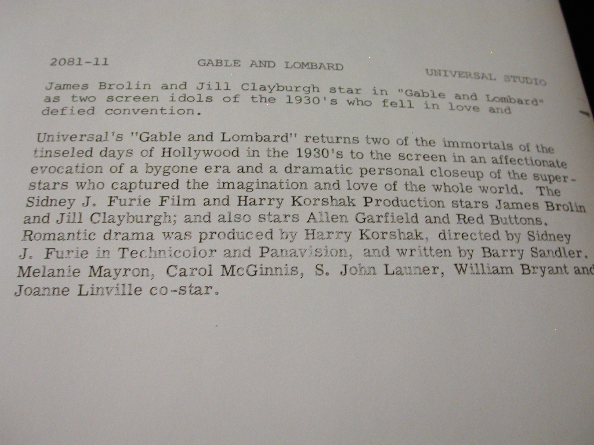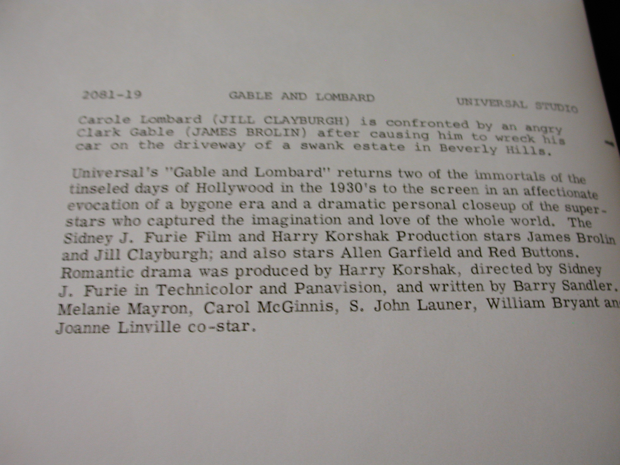 James Brolin Jill Claryburgh “Gable + Lombard” Photos Lot of 10 – Universal Pictures copyright from 1976 – each photo has a description on the back