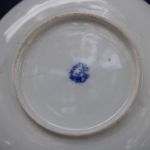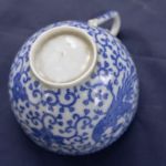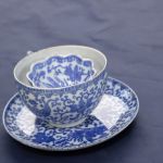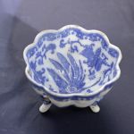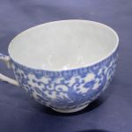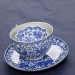 Teacup Set of 3 Asian Blue & White Dish, Plate, Cup – all three have tiny hairlines but not cracked. The cup and dish are in very good condition. The footed dish has rough rim edges and a few sharp pimples from the forming process that were not finished well.