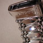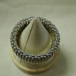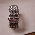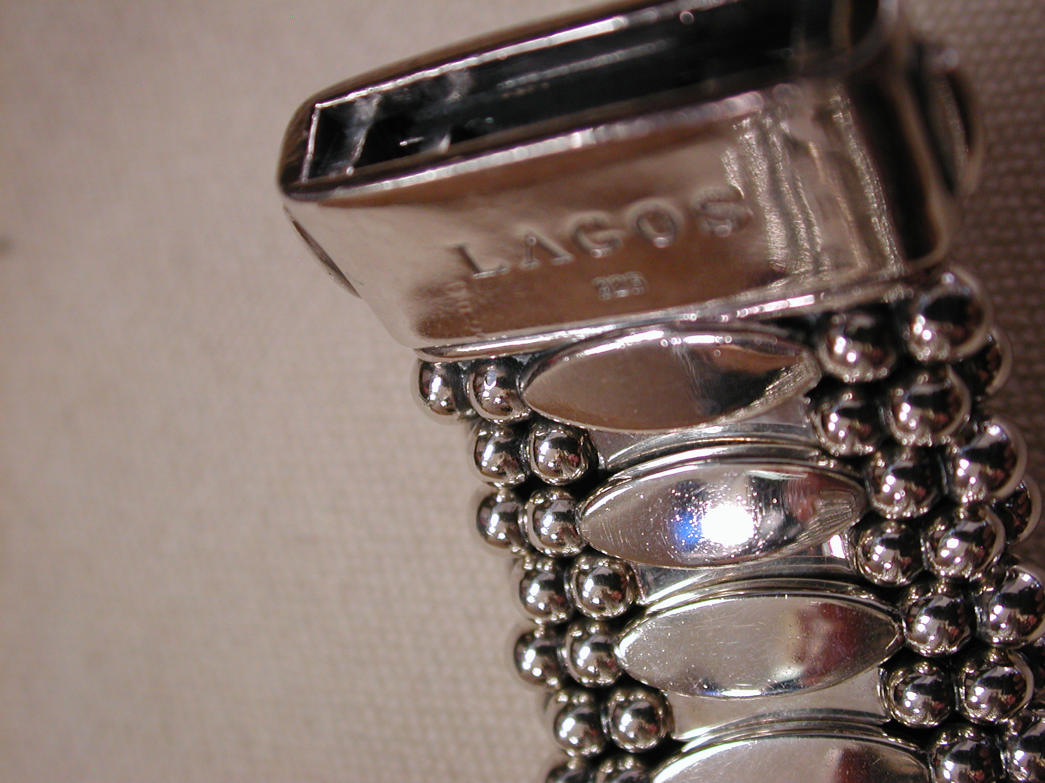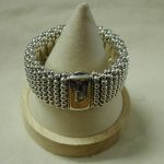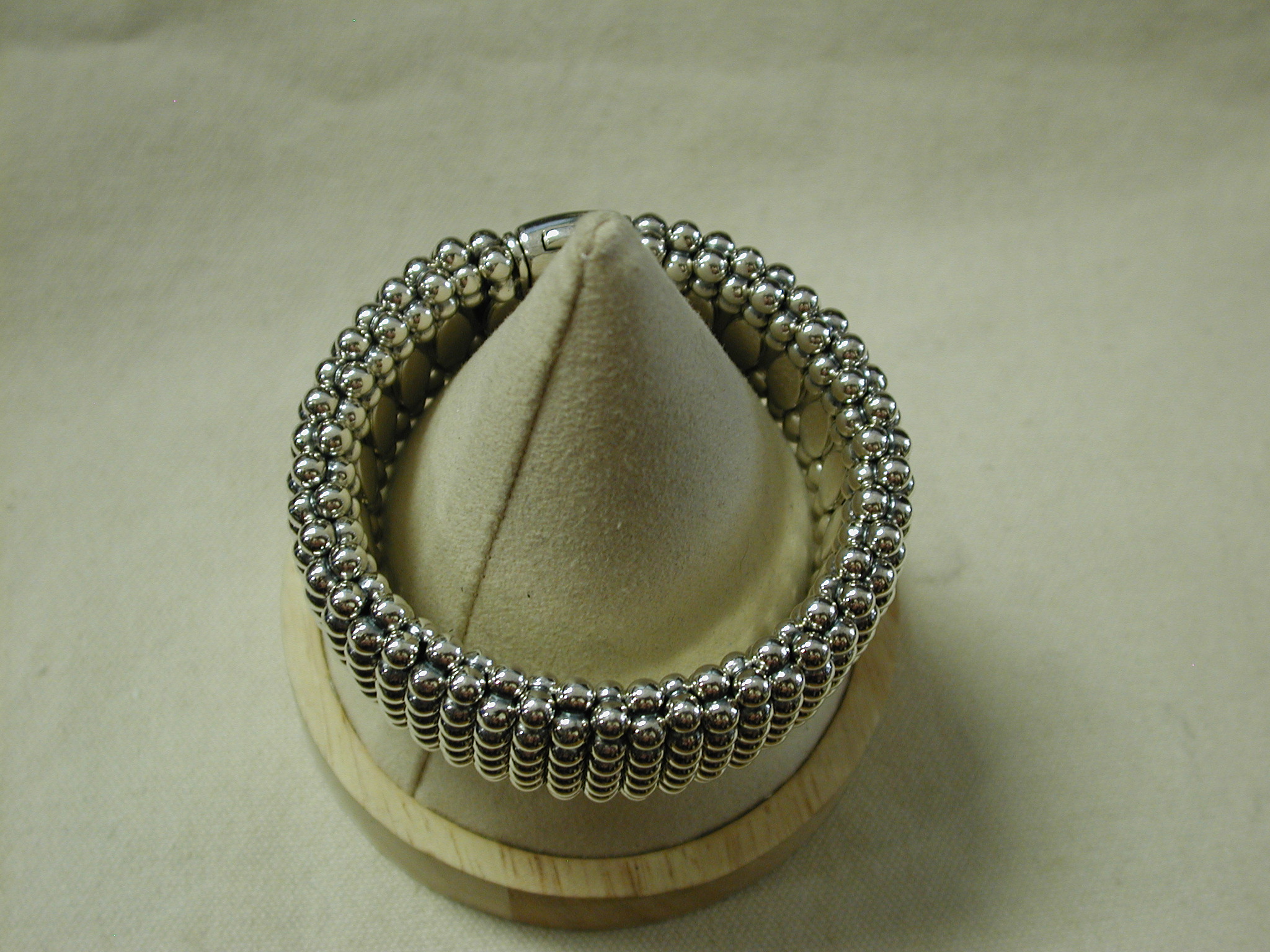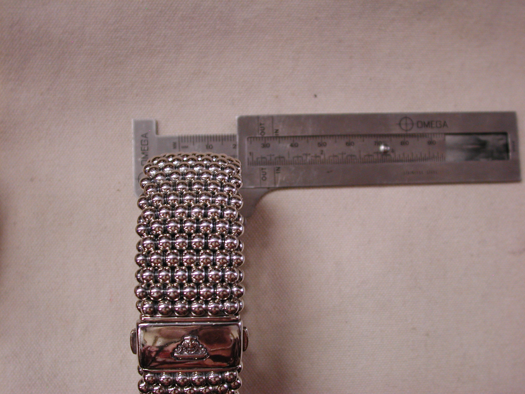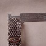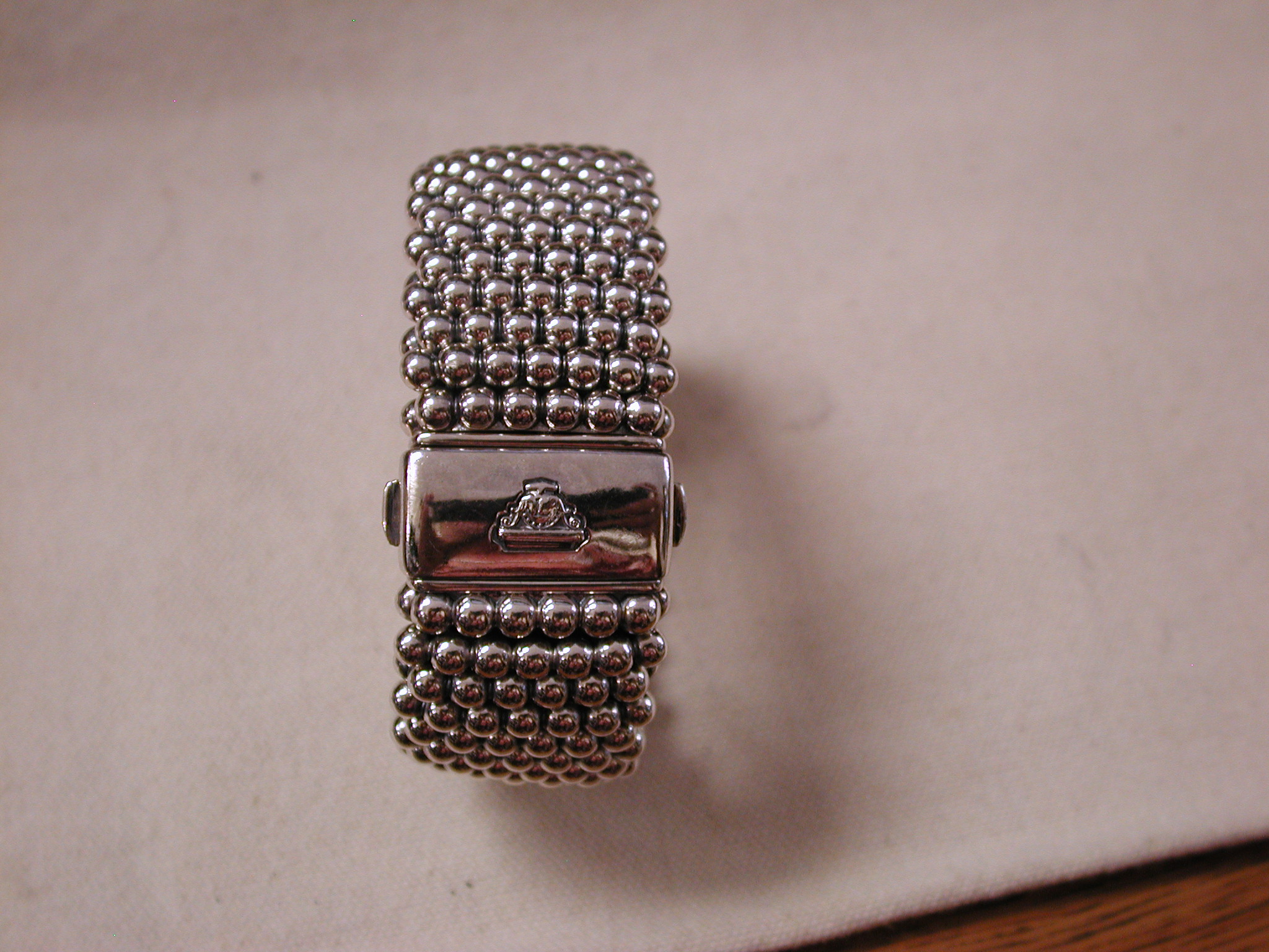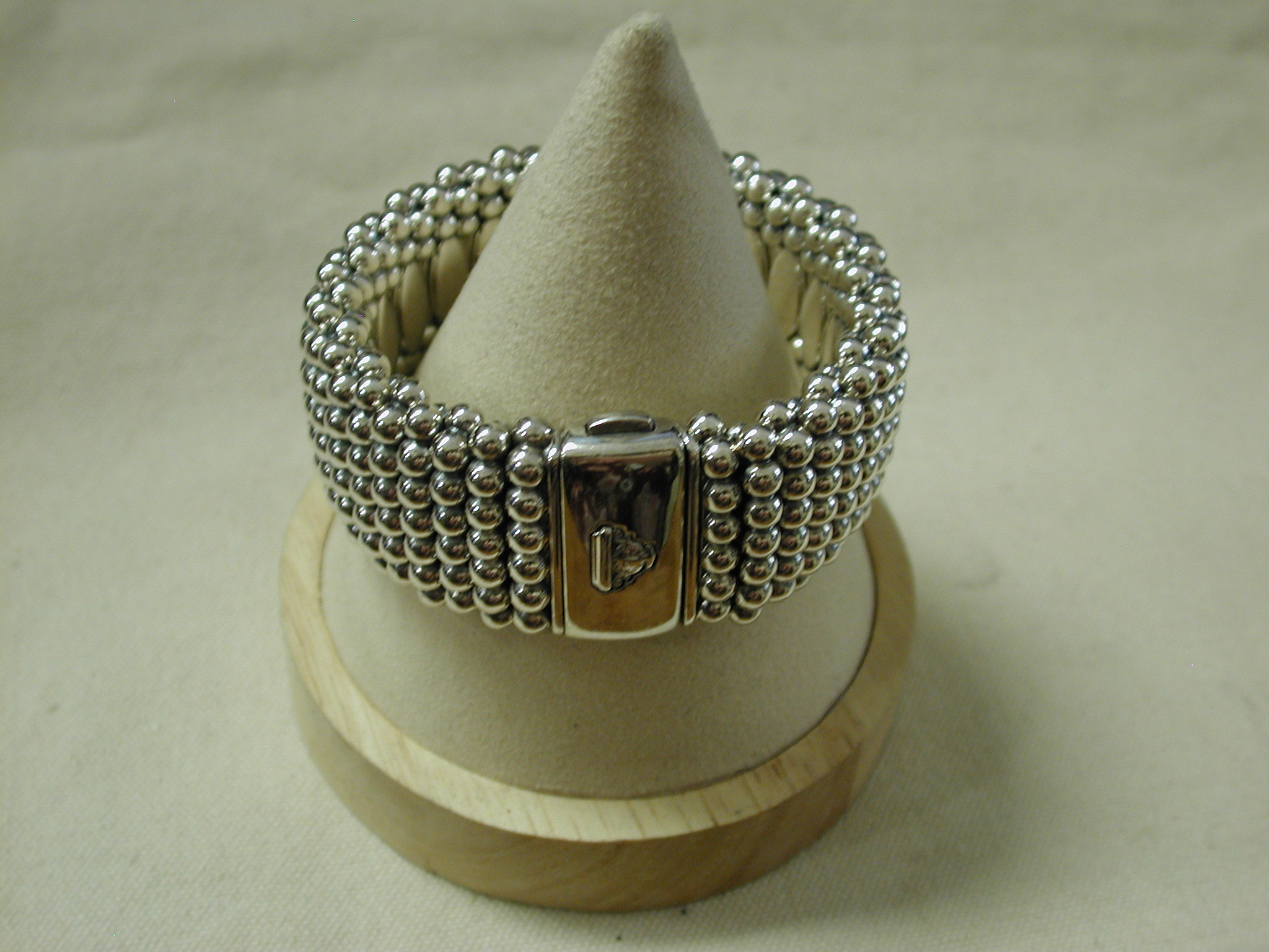 Sterling silver wide caviar beaded bracelet. Pre-owned we have cleaned and polished. This particular width is no longer made – it is 30mm so just over 1 1/8 inch wide. It would fit a standard women’s 7 inch wrist. It has the double press lock still used on the new bracelets. I note that the logo on the front now is 18KT yellow gold but this vintage model is all silver. Solidly made it weighs a whopping 171 grams. Hallmarked. Sorry No box or papers or pouch. this was purchased (we have the customer invoice from a Lagos authorized seller in 2013). A stunning cuff!
