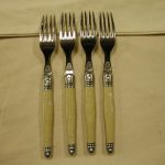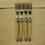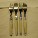 Laguiole Flatware Ivory Lot of 4 ABS Handle Stainless – 8 1/4 inches long – some wear from use – a few have enamel wear on the little dots aong the handles