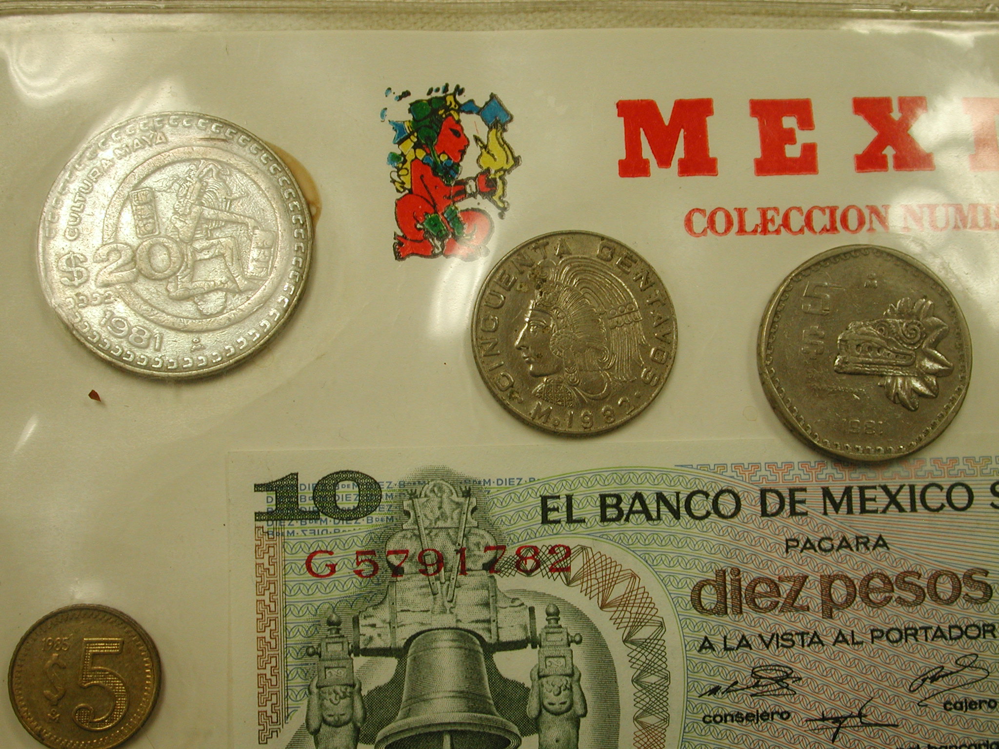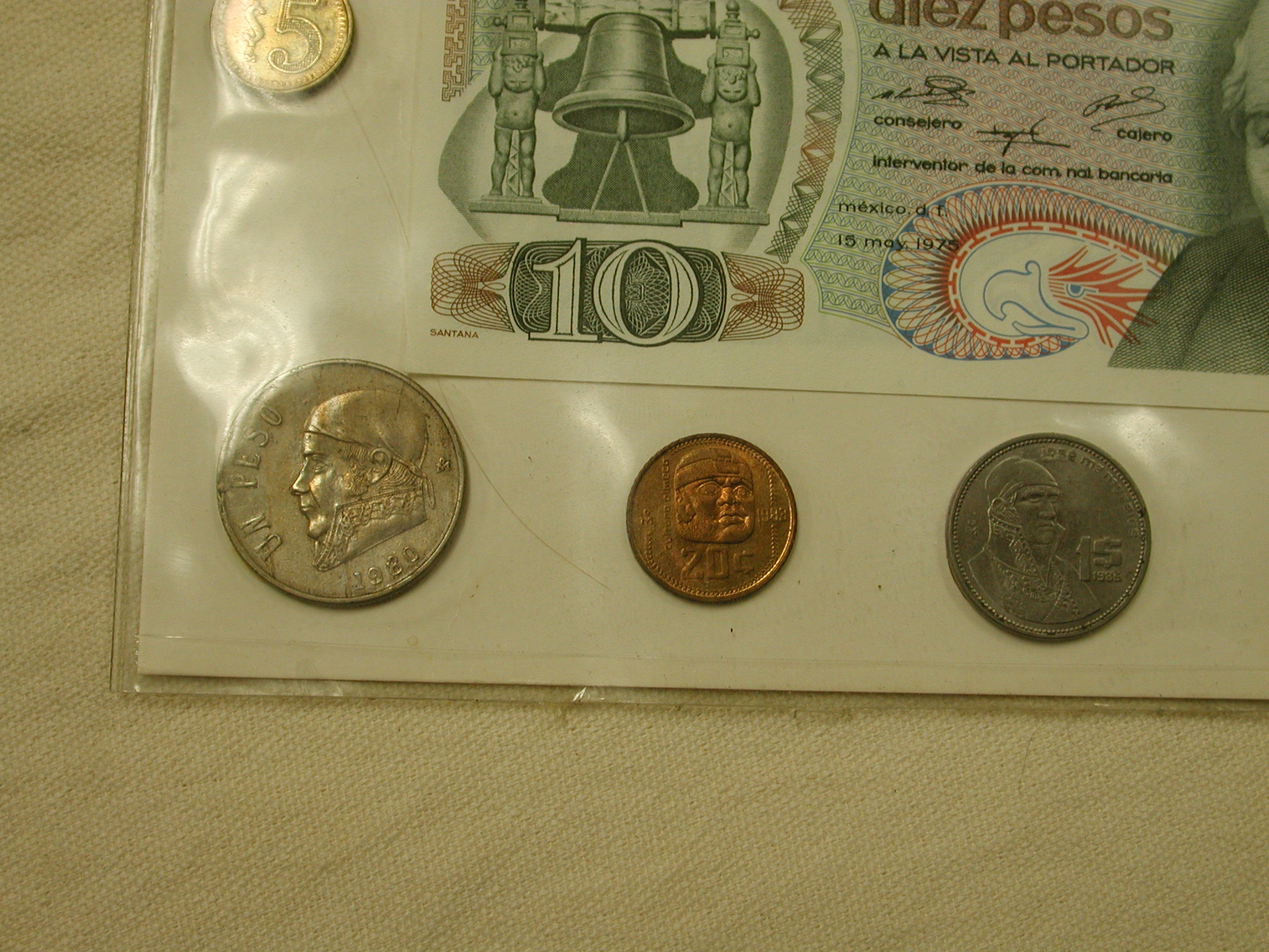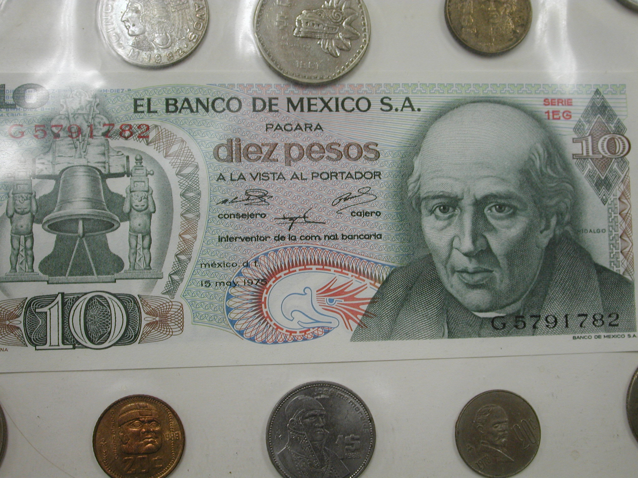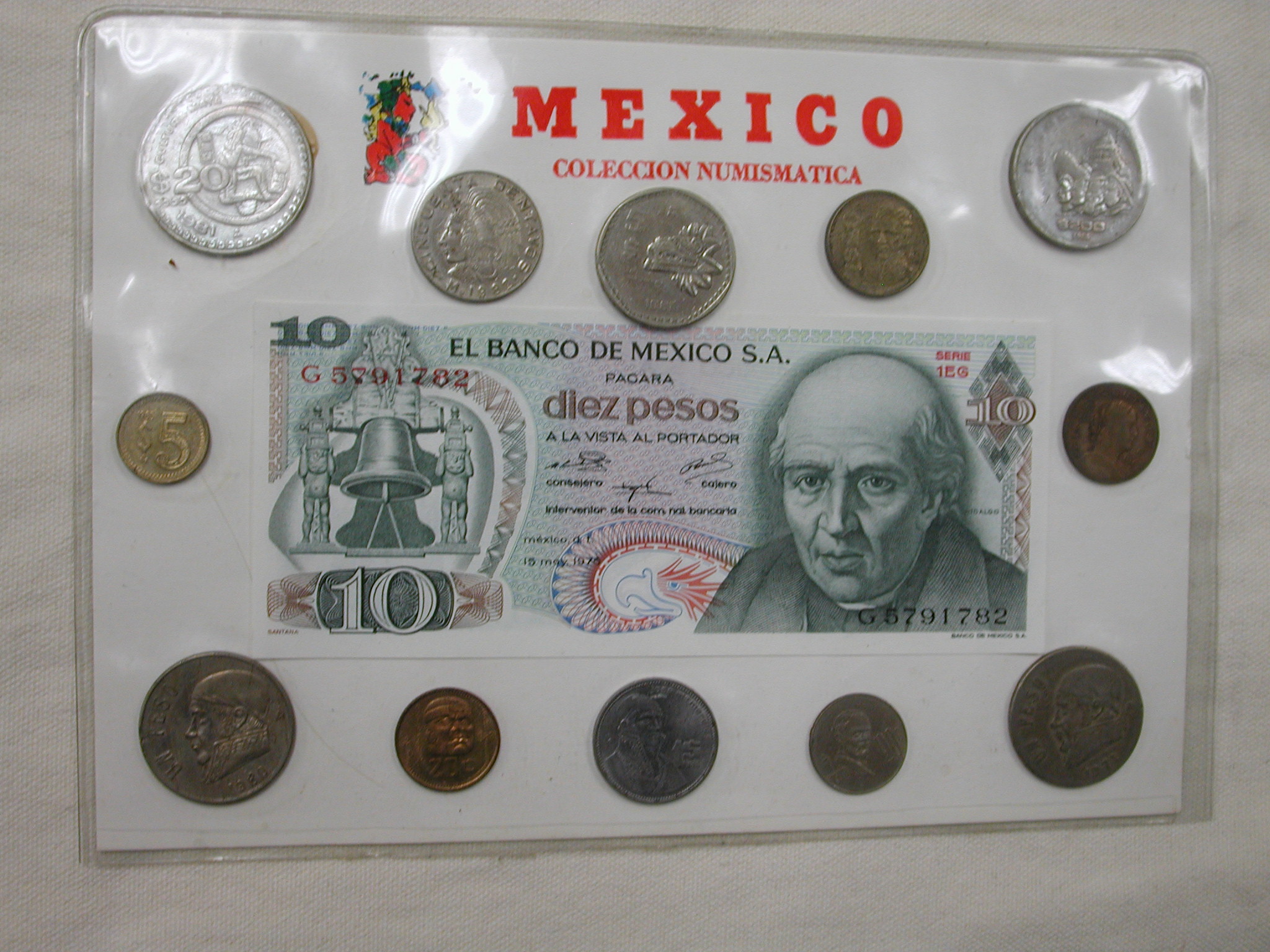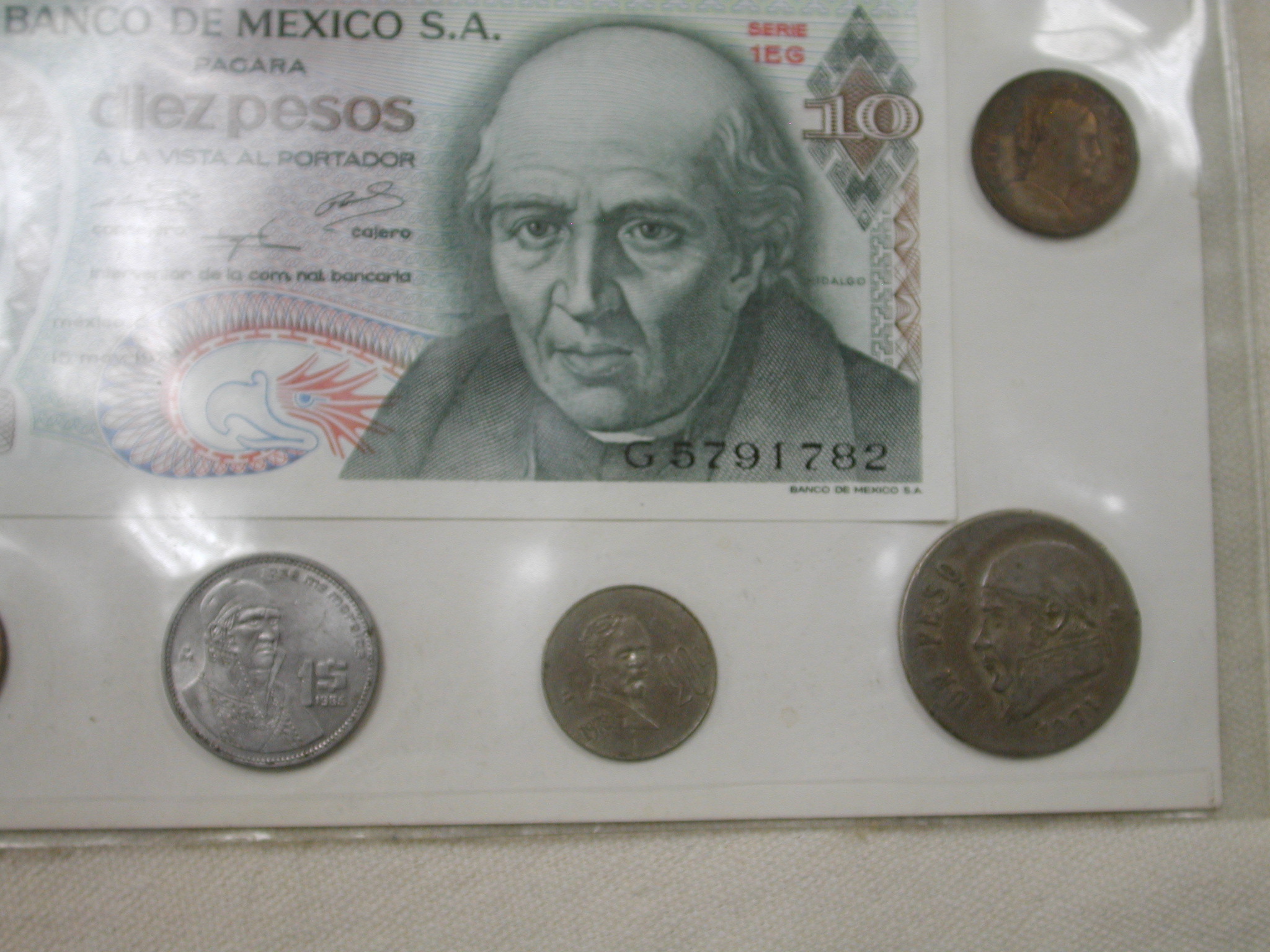 Mexico Collection Numismatics Lot of 12 coins and Currency Note – the currency is uncirculated and the coins are mostly circs. Presented well it could be framed as a gift.