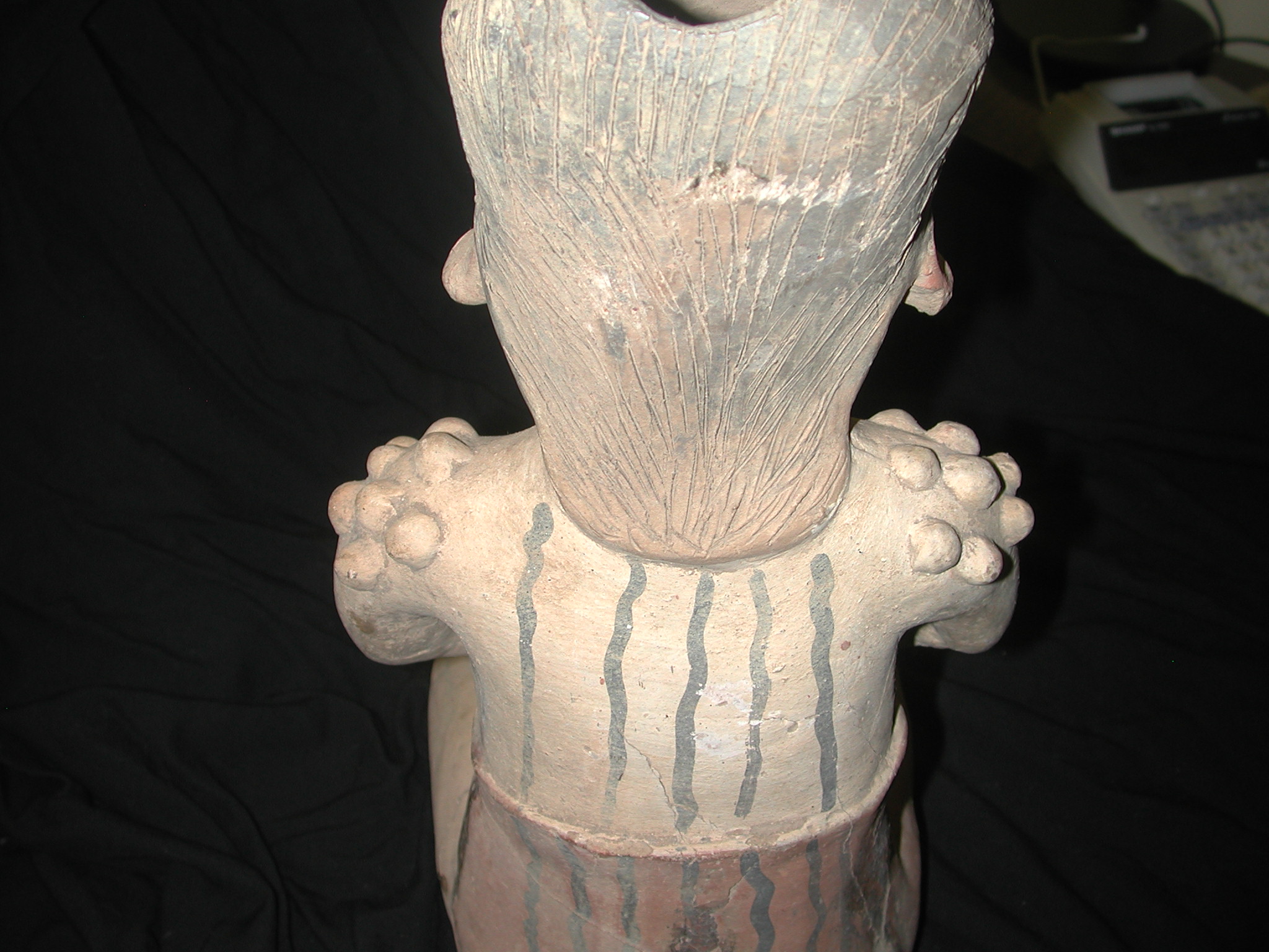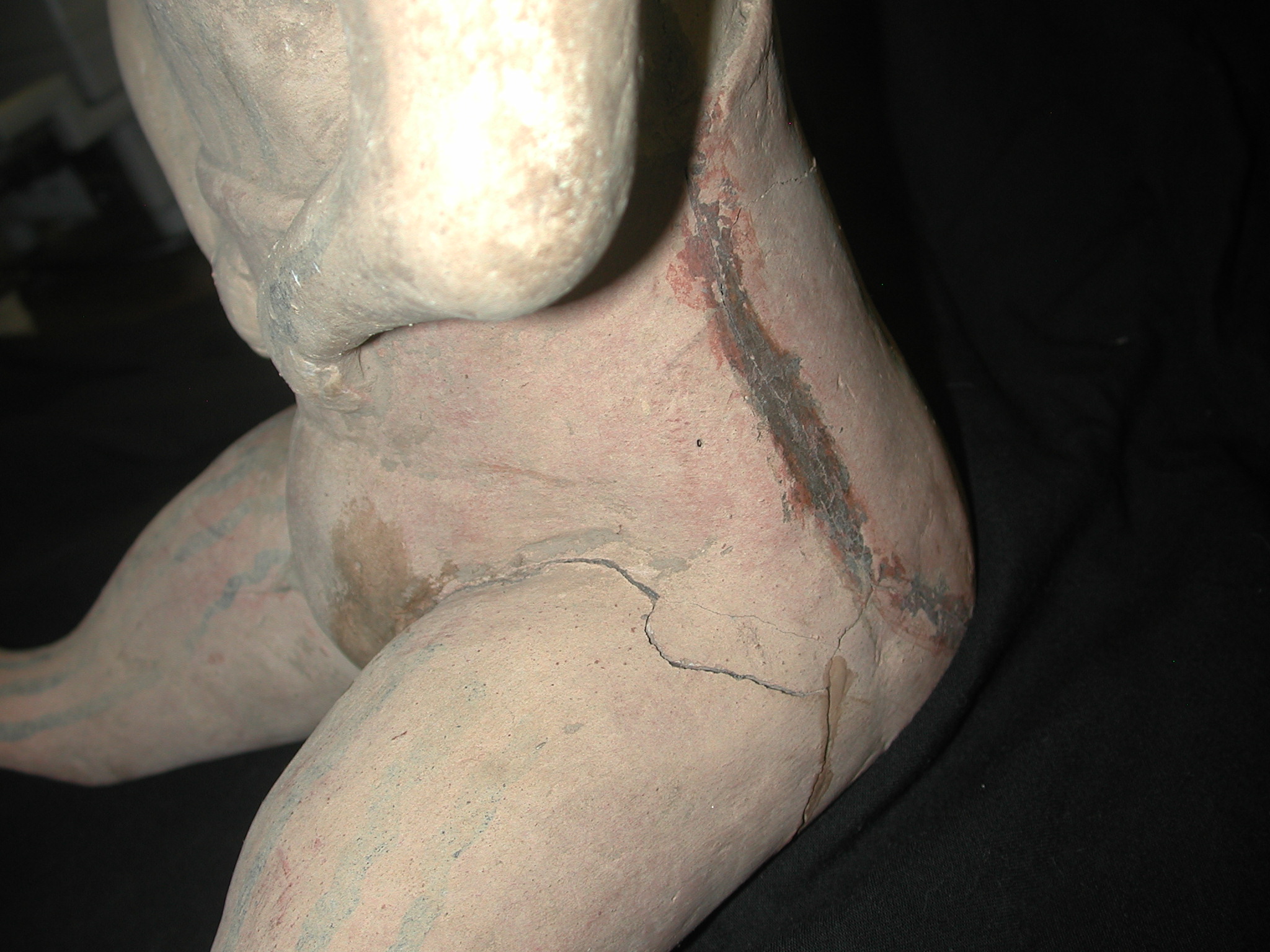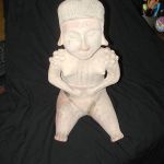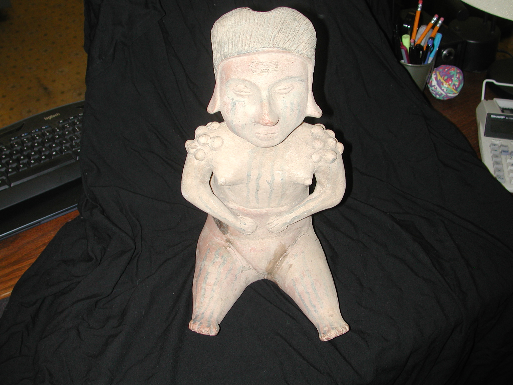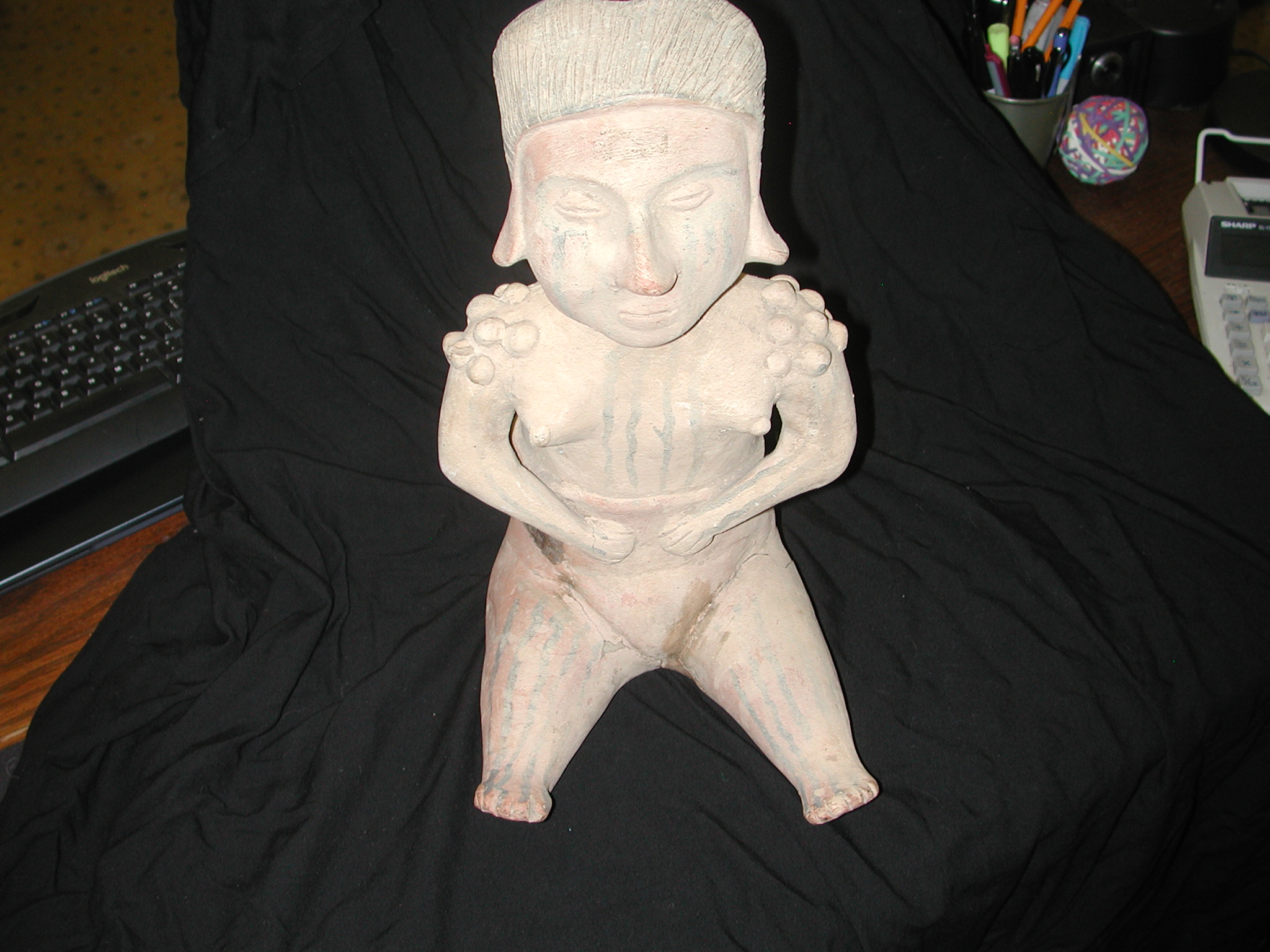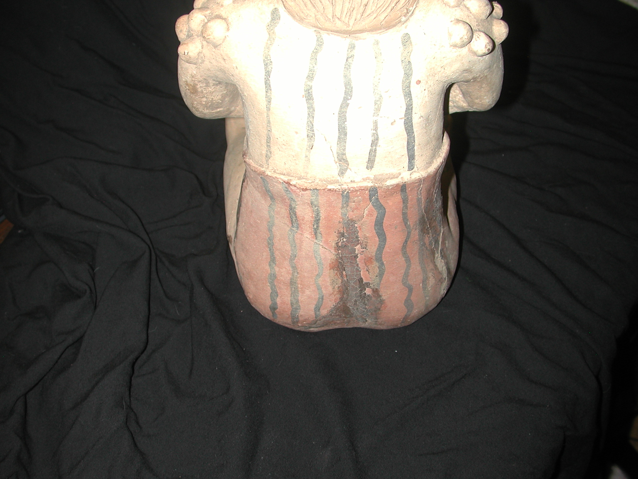 Pre-Columbian Female Jalisco Terracotta with tattoo figure – NOT experts so feel free to send your opinions…we have had this in our shop for 40 years it came out of a NYC estate where most of the items went to auction – the heirs kept some of the smaller items and we bought the whole lot back in 1985. She is 15 inches tall by 8 inches wide – numerous cracks and chips as the photos show and clearly pieced back together. Weighs 7.5 pounds.