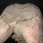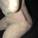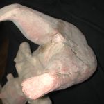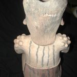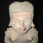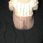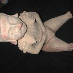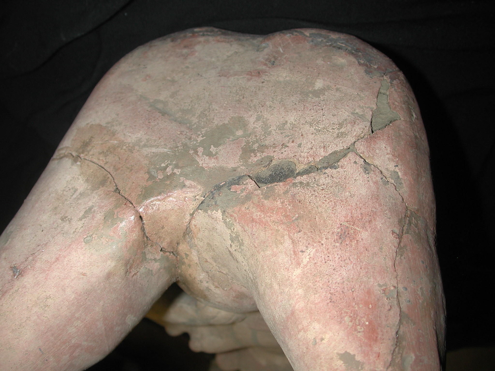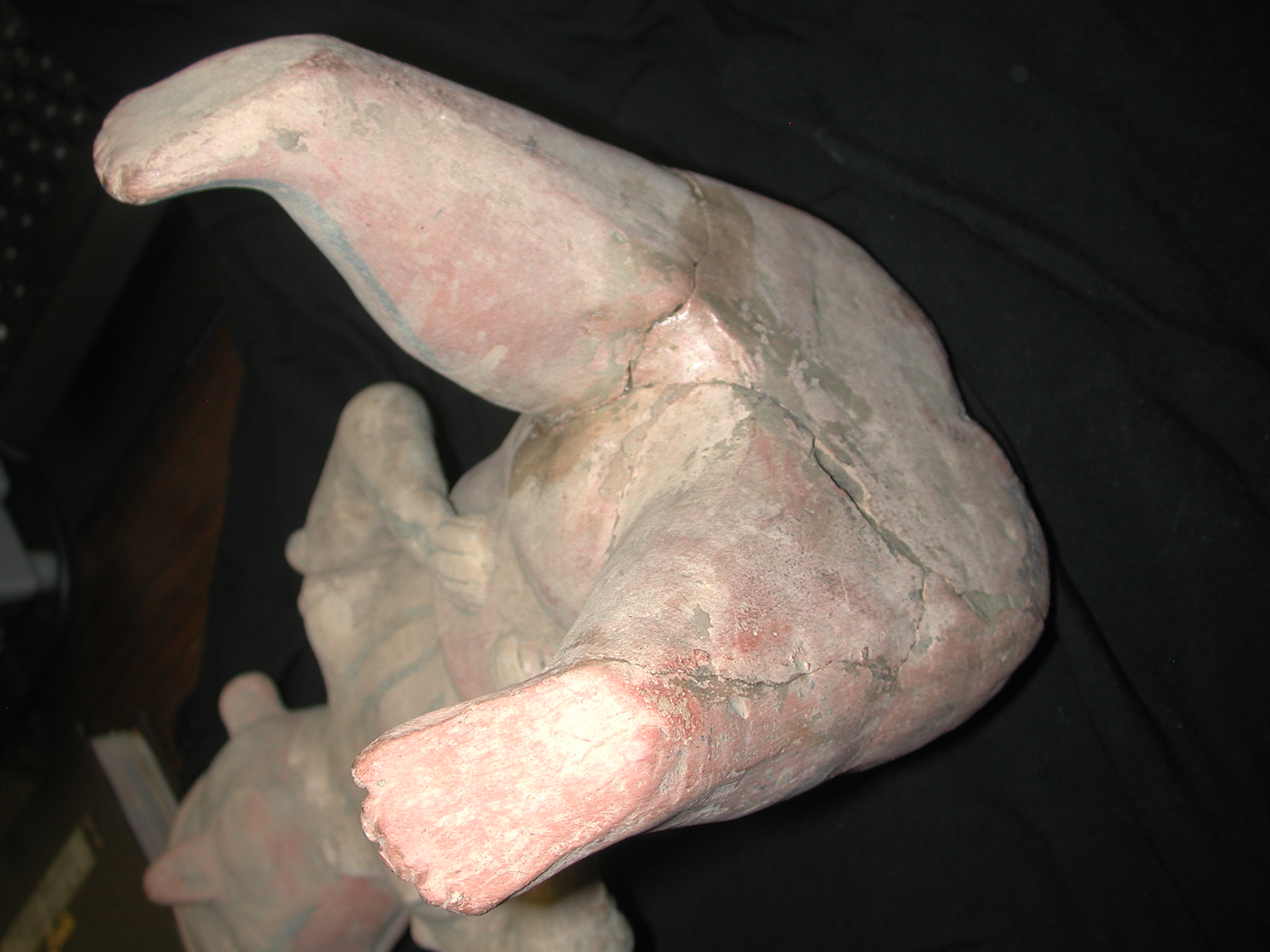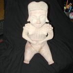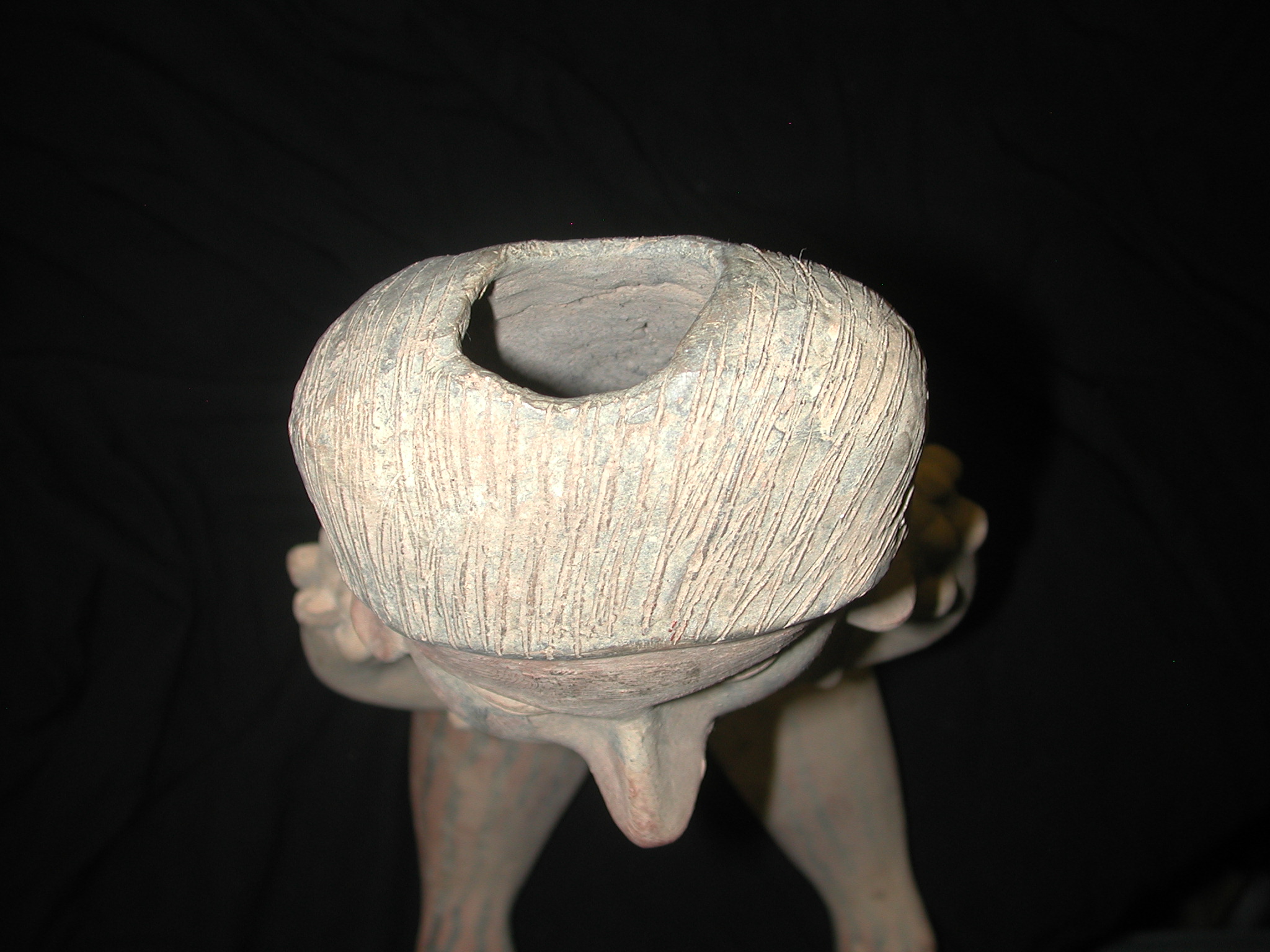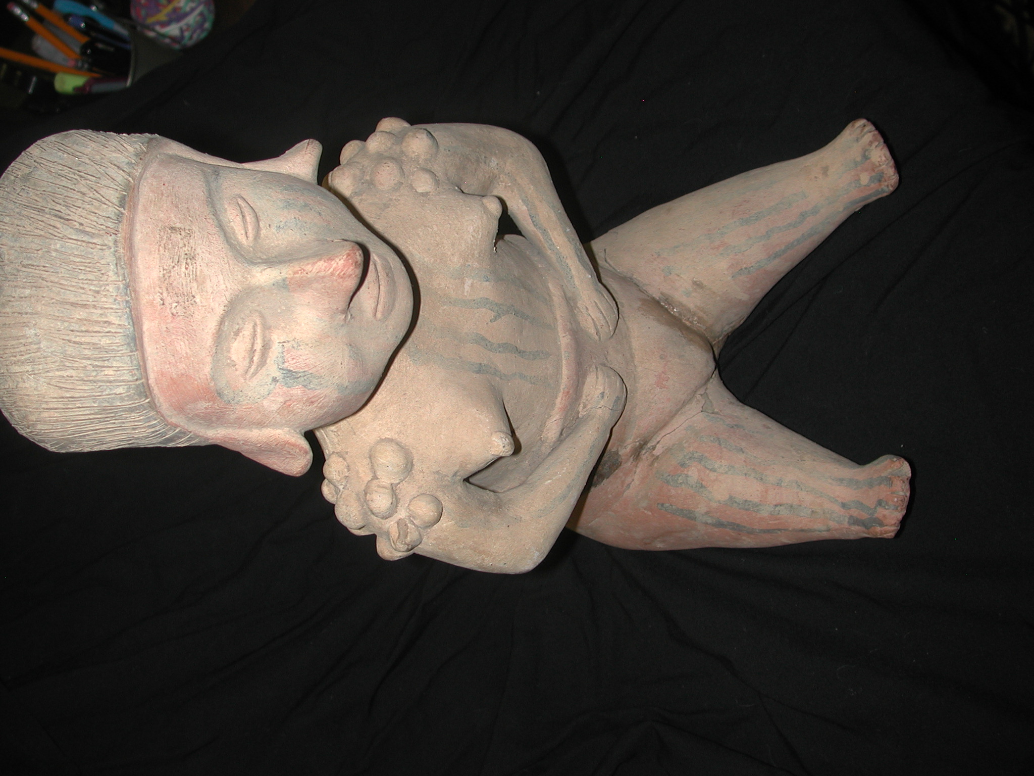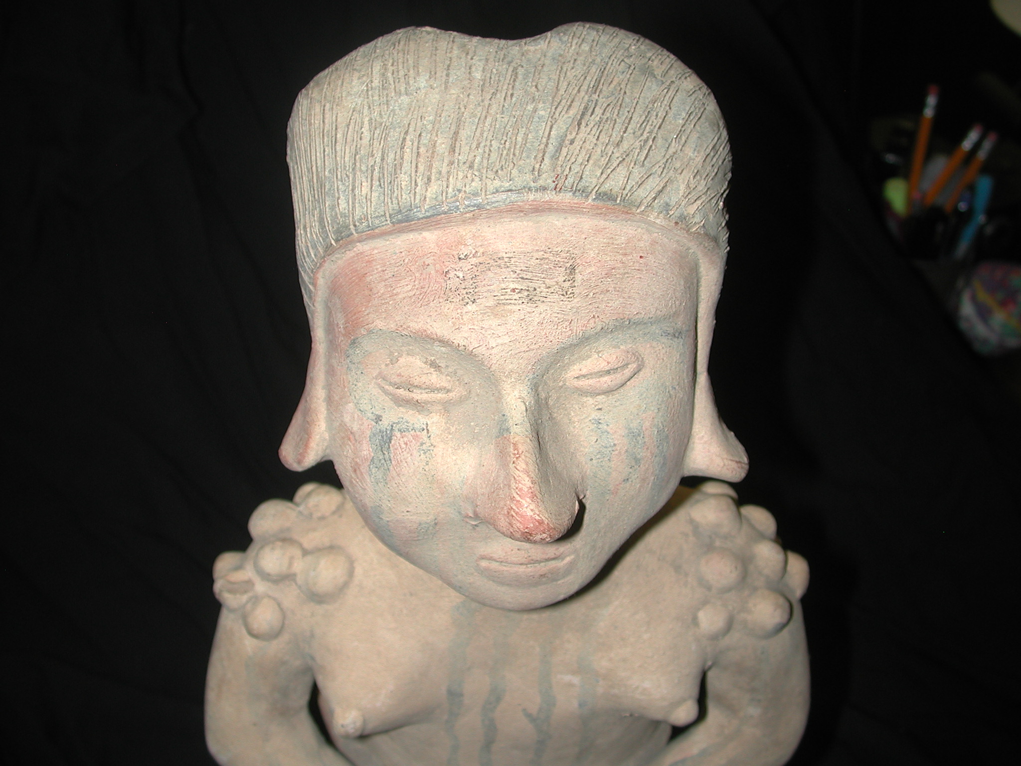Pre-Columbian Female Jalisco Terracotta with tattoo figure – NOT experts so feel free to send your opinions…we have had this in our shop for 40 years it came out of a NYC estate where most of the items went to auction – the heirs kept some of the smaller items and we bought the whole lot back in 1985. She is 15 inches tall by 8 inches wide – numerous cracks and chips as the photos show and clearly pieced back together. Weighs 7.5 pounds.