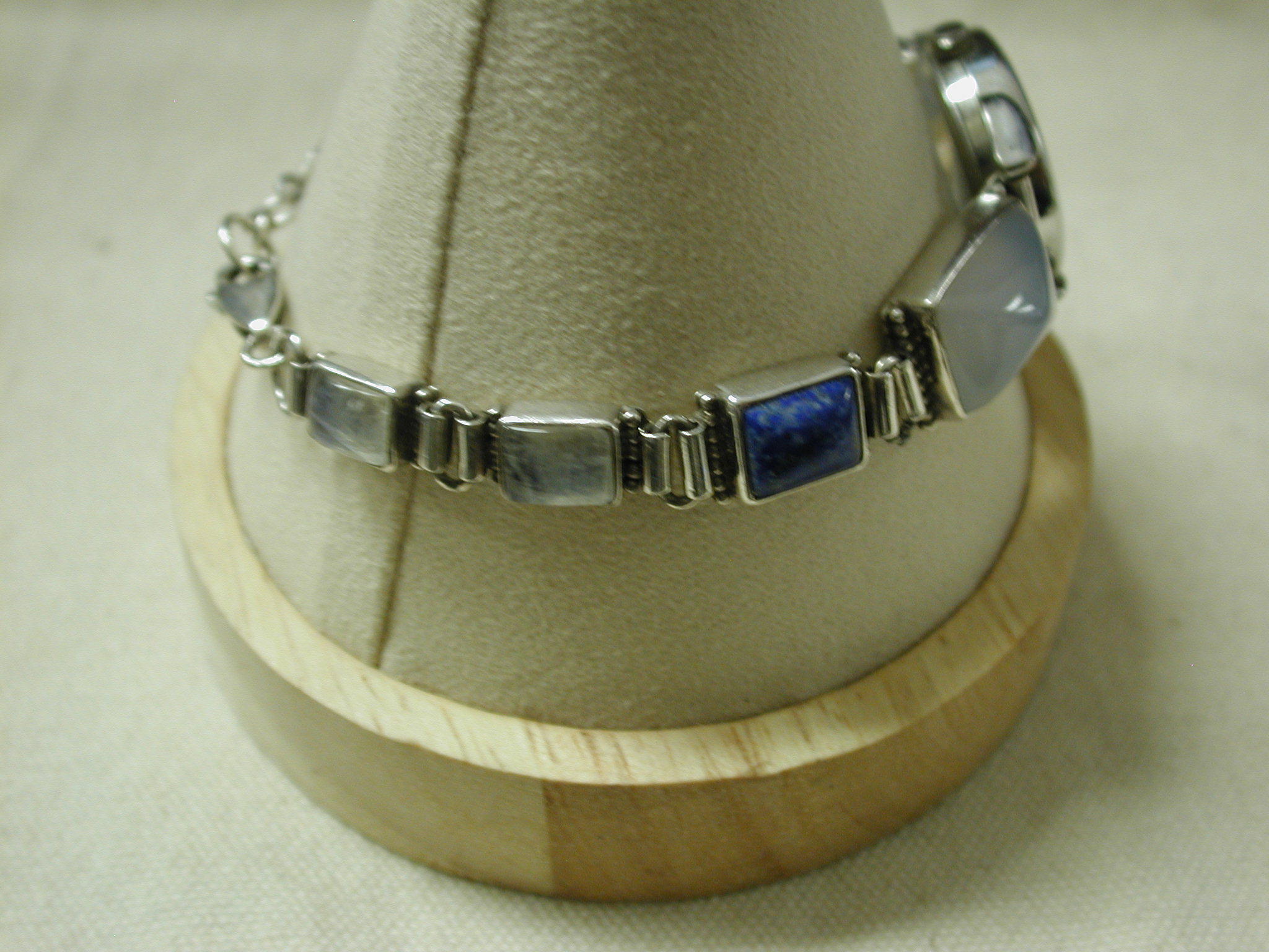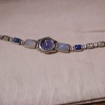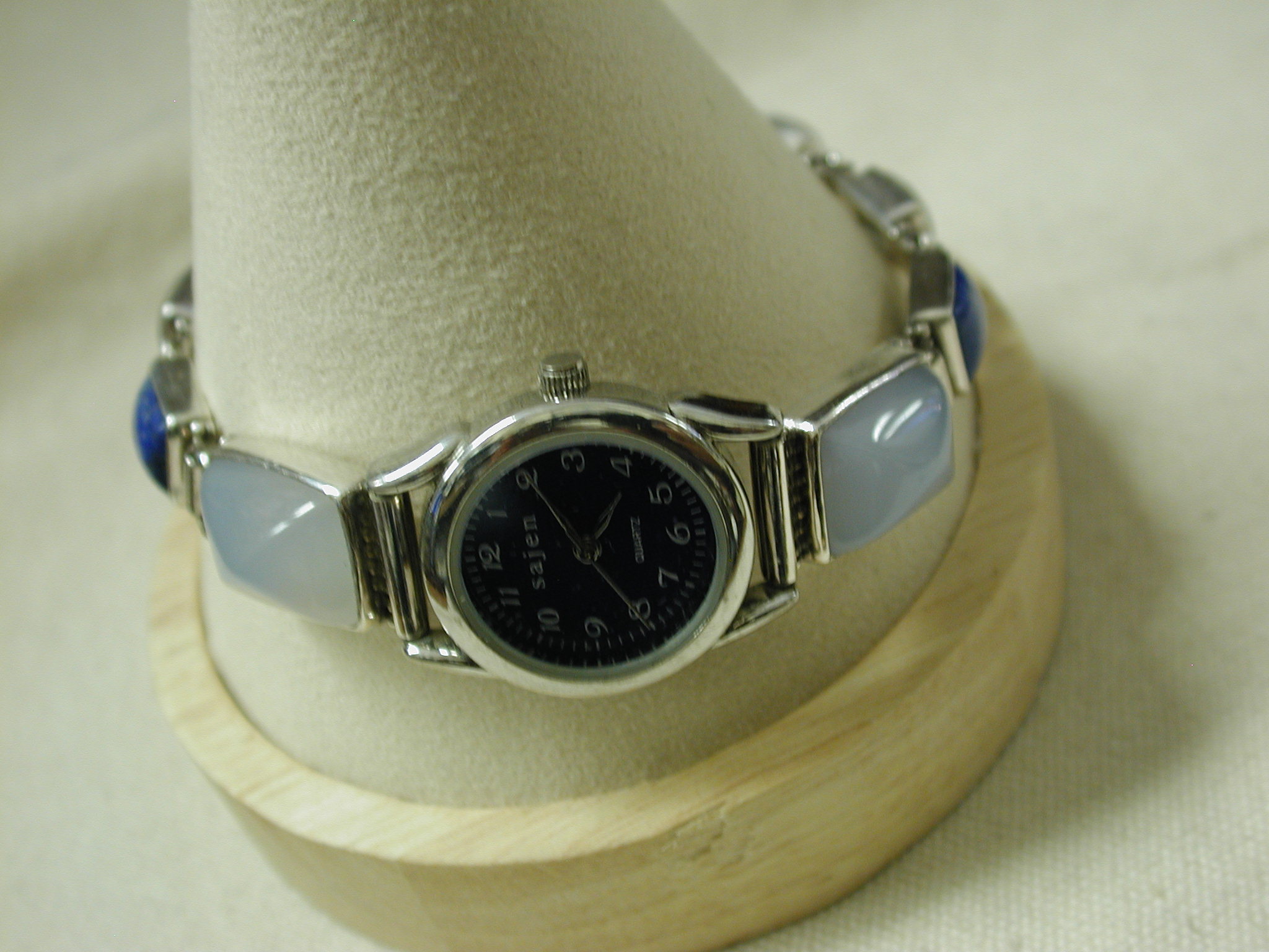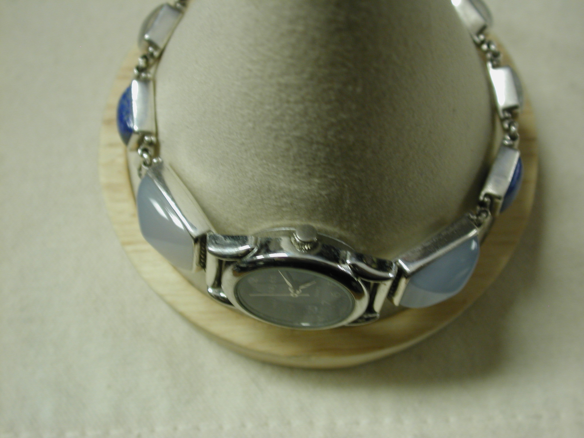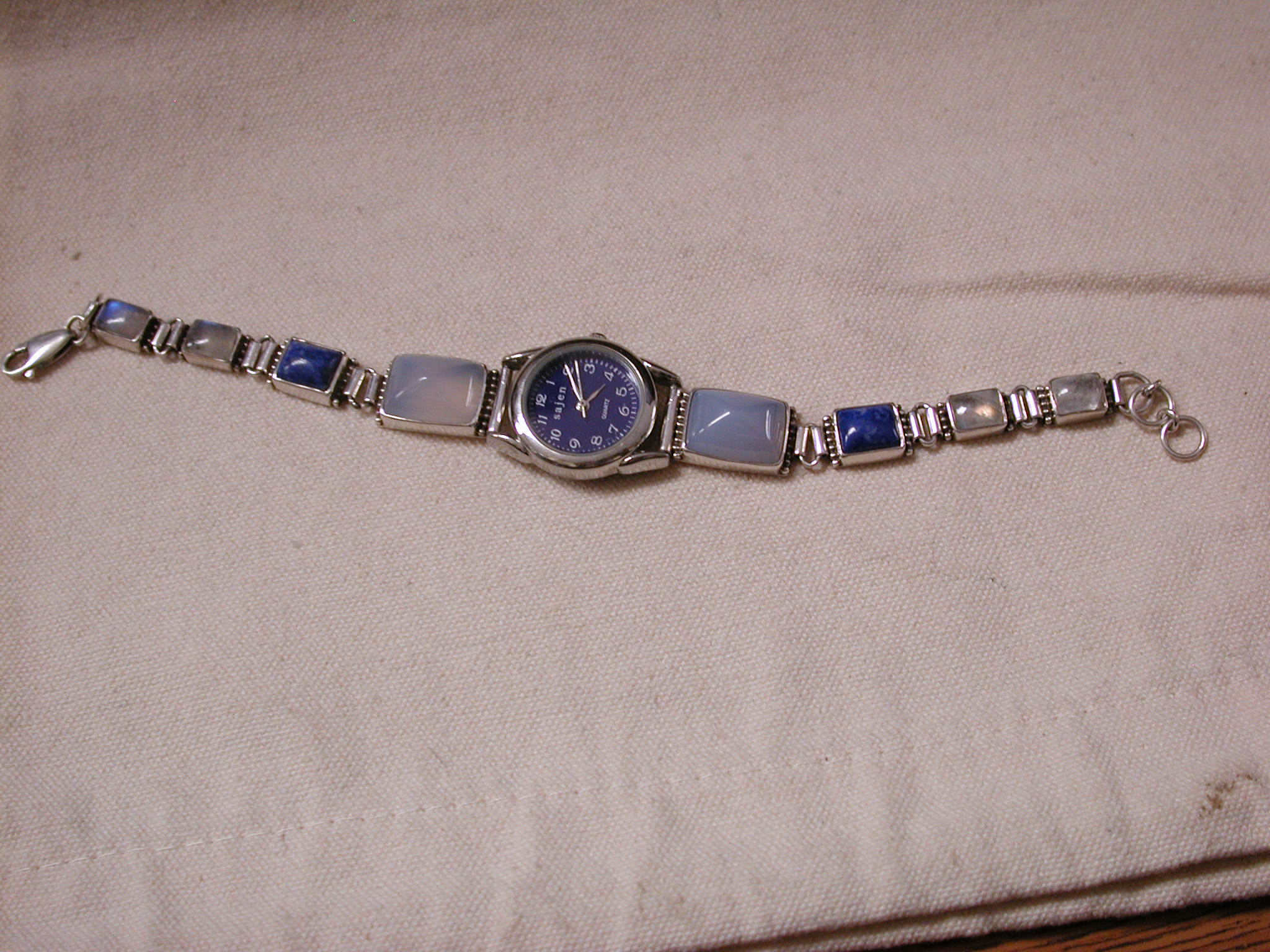 SAJEN 925 STERLING SILVER Blue Face Blue stone bracelet watch – measures 8 inches end to end and the dial is 24mm round and the bracelet graduates from 12mm to 7mm rectangle. The stones are lavender blue moonstone looking stones and blue lapis looking stones – not sure if real but they look great. If you are into color coordinating this watch will look great with denim! New Battery and watch is running well.
