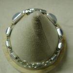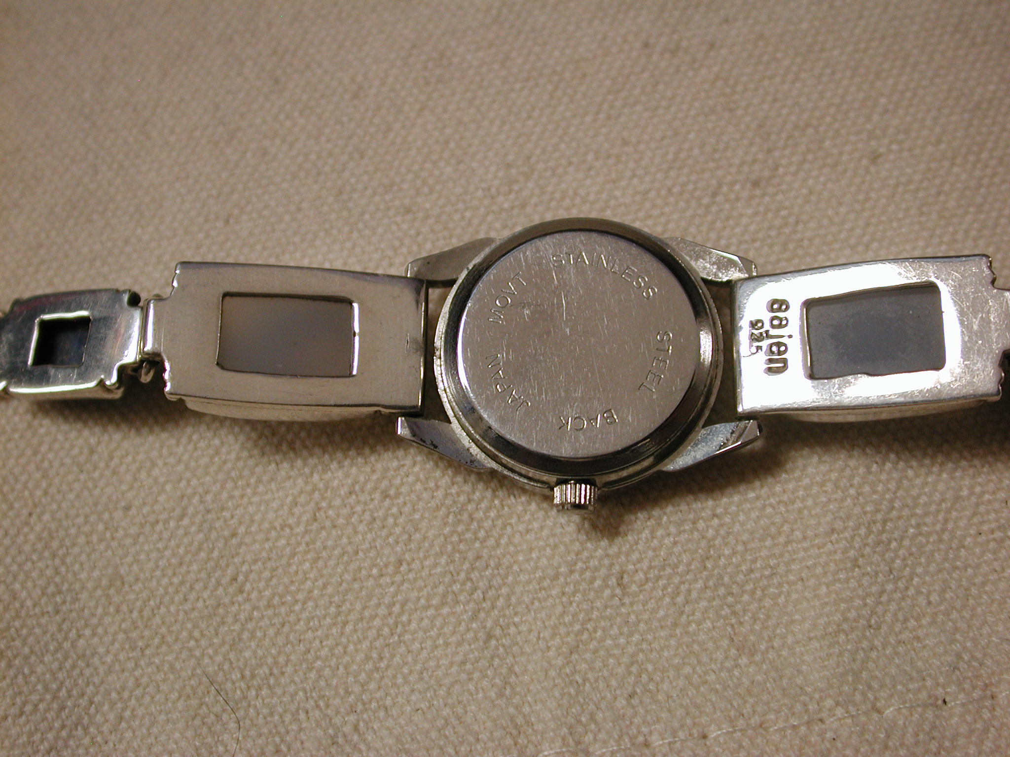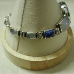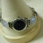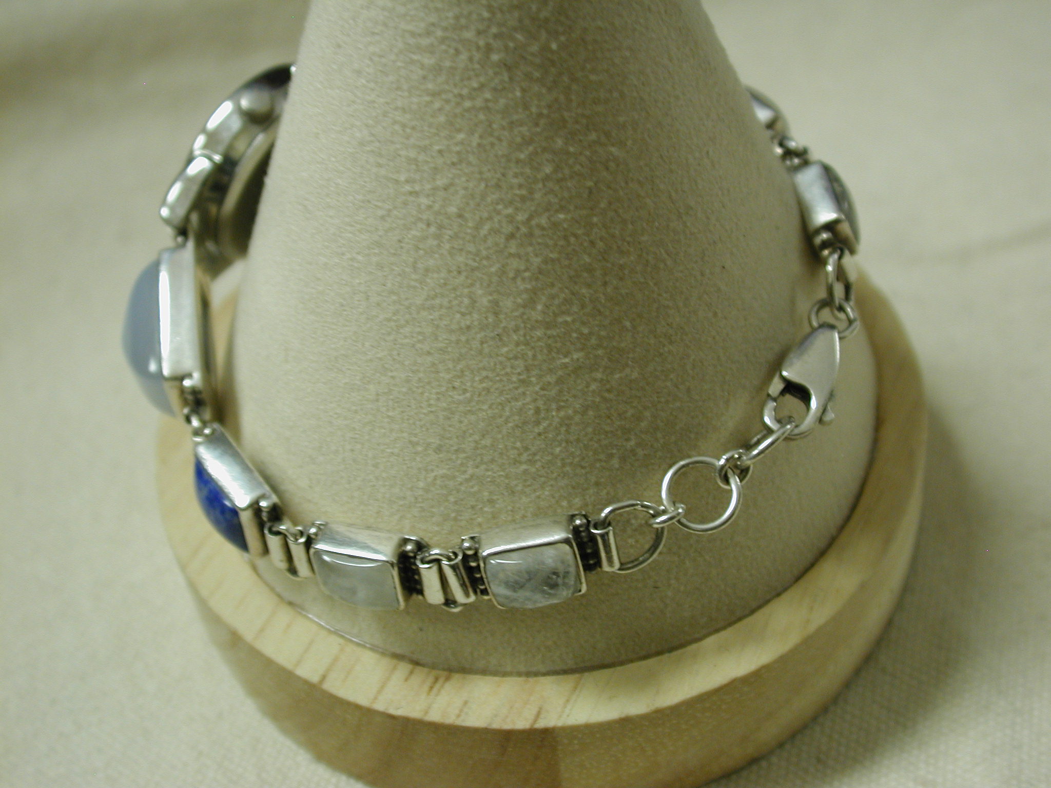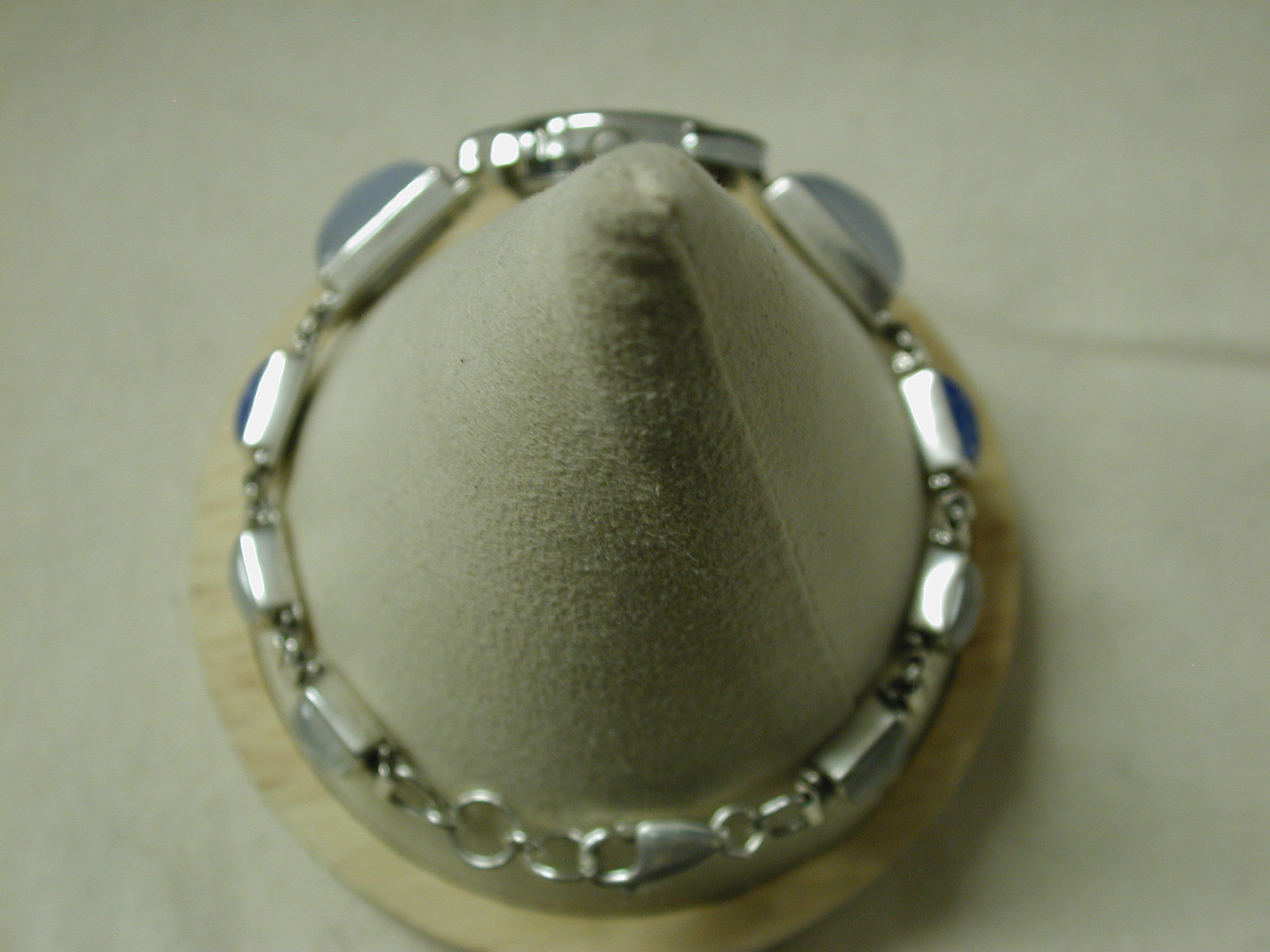 SAJEN 925 STERLING SILVER Blue Face Blue stone bracelet watch – measures 8 inches end to end and the dial is 24mm round and the bracelet graduates from 12mm to 7mm rectangle. The stones are lavender blue moonstone looking stones and blue lapis looking stones – not sure if real but they look great. If you are into color coordinating this watch will look great with denim! New Battery and watch is running well.