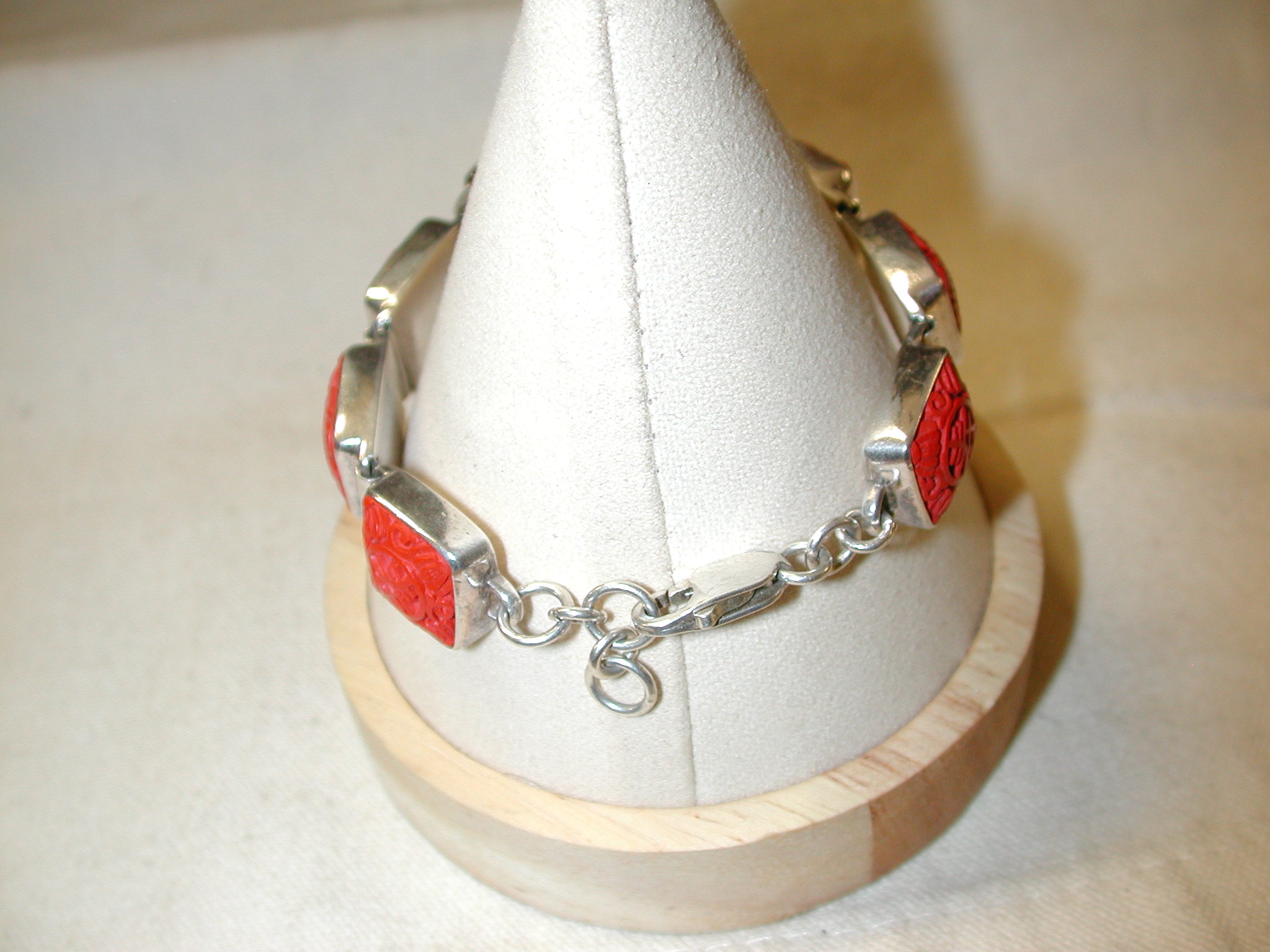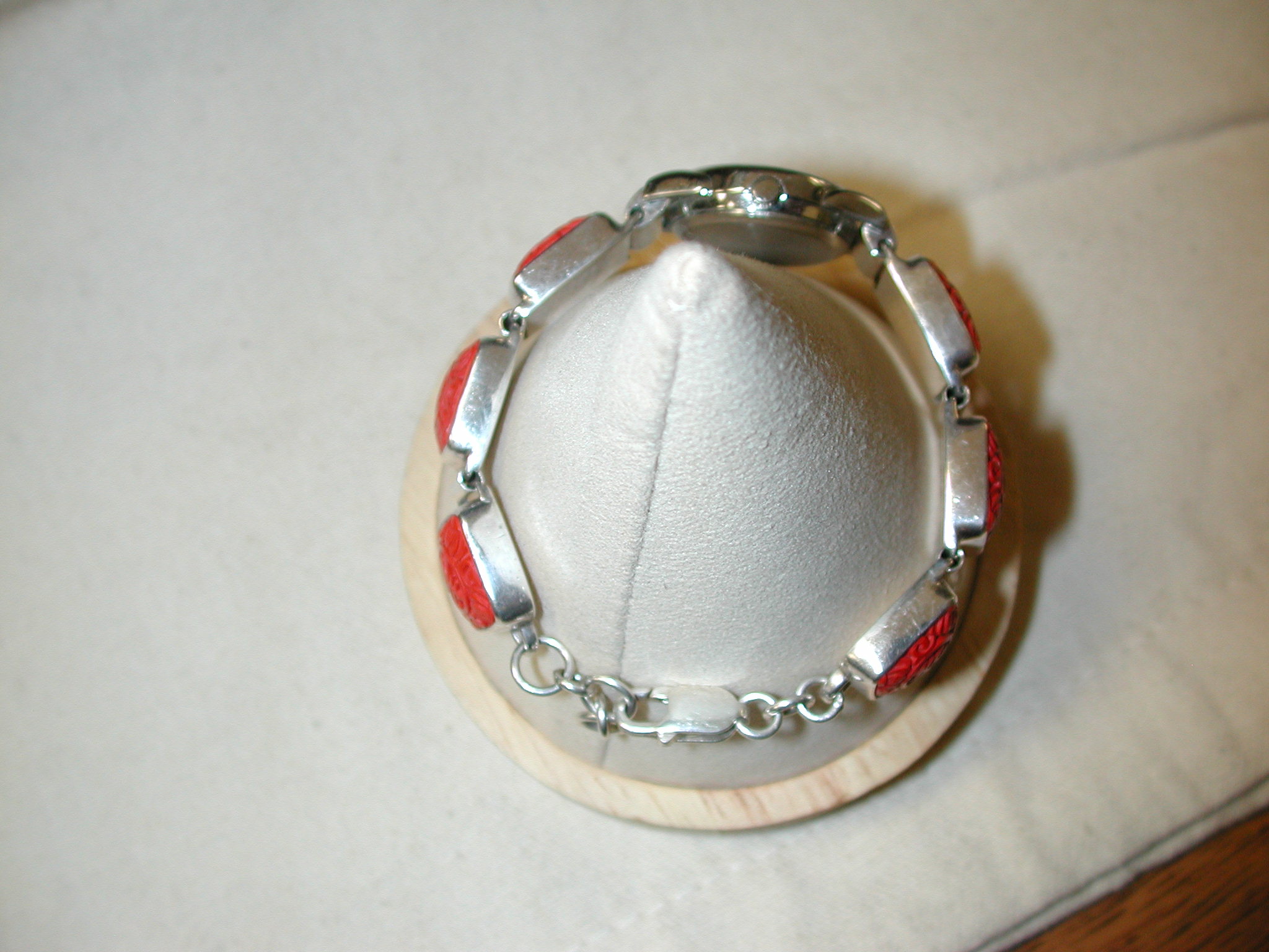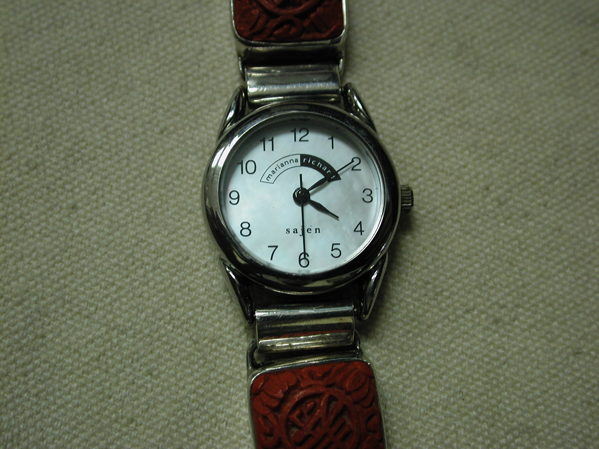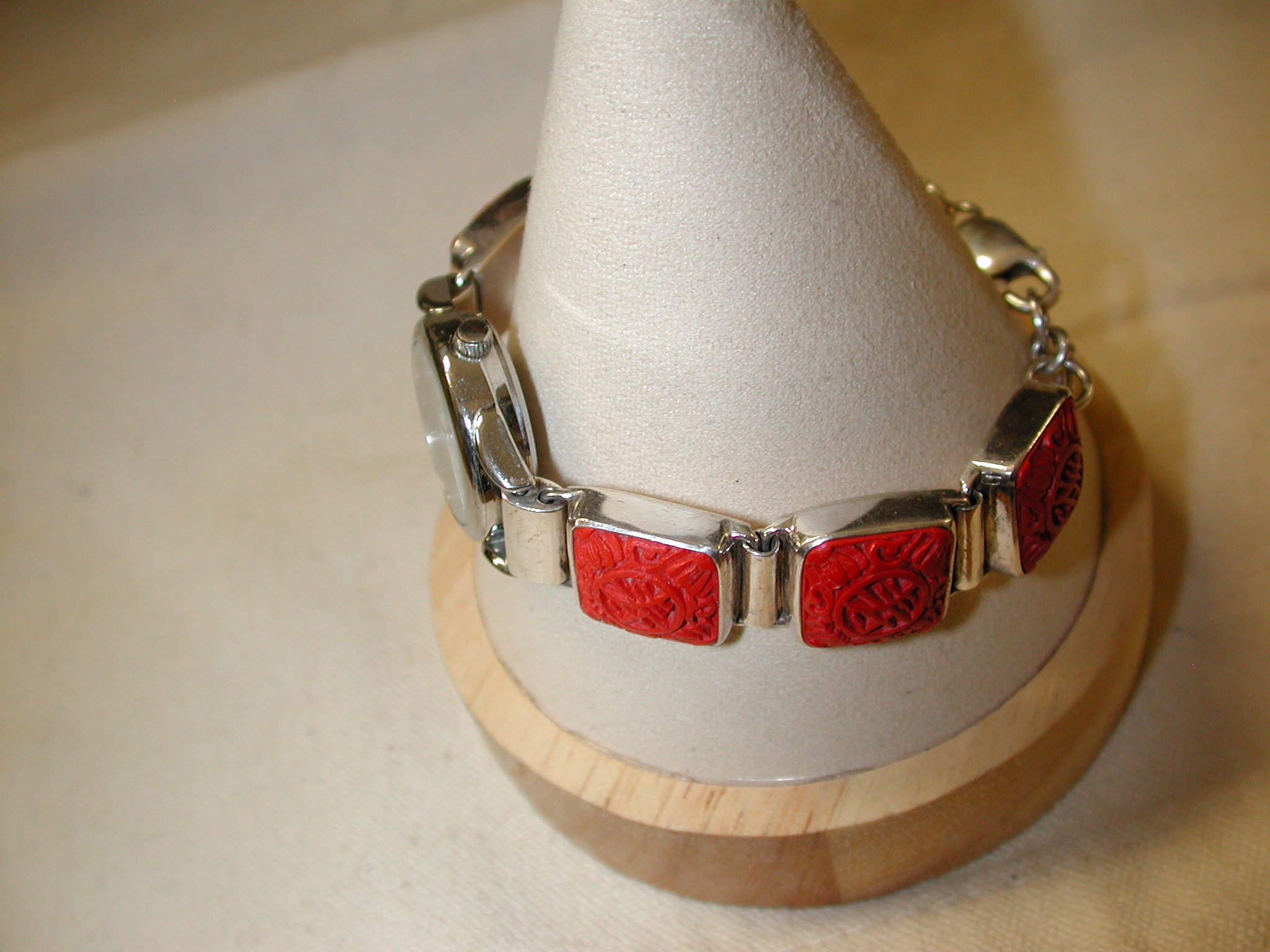 SAJEN MARIANNA & RICHARD 925 STERLING SILVER CINNABAR Bracelet Watch – replaced battery running well – distinctive red color – watch is 23mm round and the bracelet is 15mm square – measures 7.5 inches
