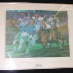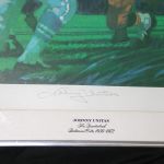 DescriptionOriginal 1974 Sports Illustrated Johnny Unitas Autographed Living Legends Lithograph, personally signed by Johnny Unitas, numbered 693/1500 . This limited edition lithograph is still in the original frame that it came in. This lithograph is from a limited series of lithos designed by Bob Peak for Sports Illustrated magazine & is unique in that it is signed by both the artist and the subject. The frame measures 25 & 3/4″ x 21 “. The picture in the frame measures 20 & 1/2″ x 16 & 5/8”. Frame is bit dusty and lithograph has faded edges from age. Hard to find.