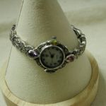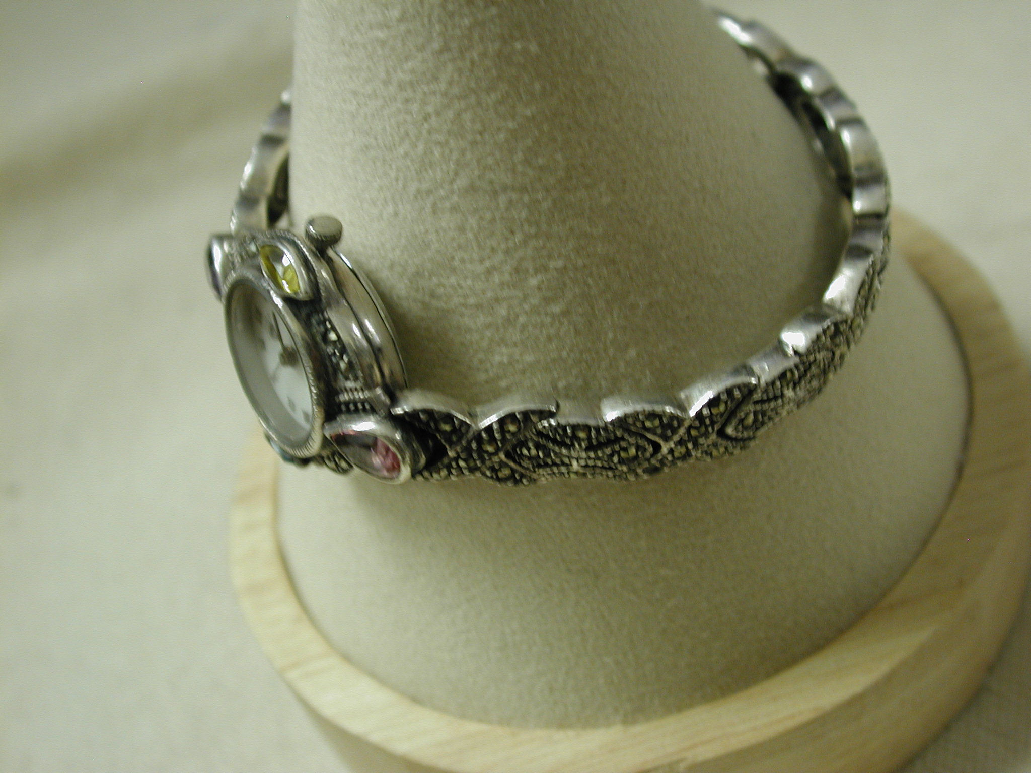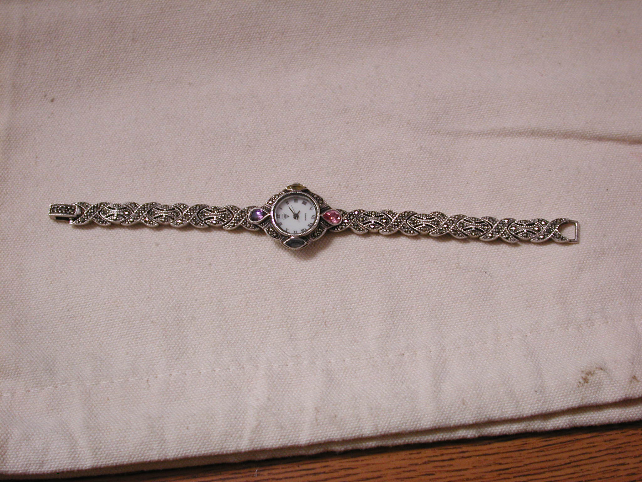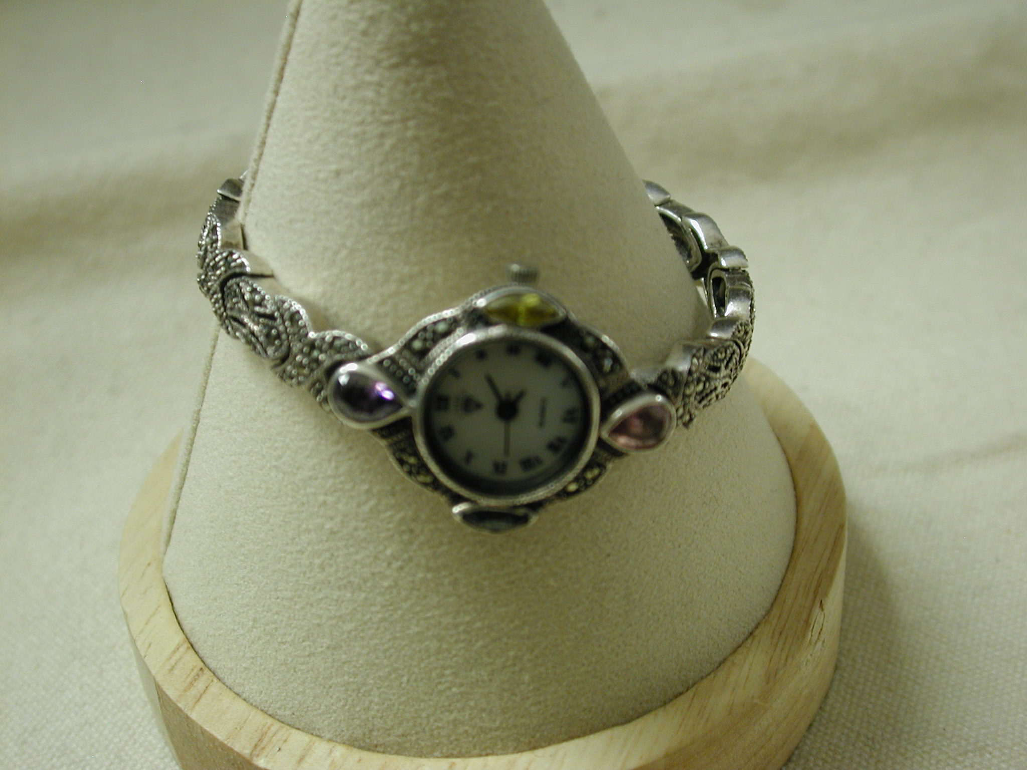 Sterling Marcasite Watch Gemstone Pink Purple Yellow Blue Quartz – measures 7 inches – 23mm face and bracelet is 8mm – tear drop pink and purple stones at 12 and 6 and marquise blue and yellow at 3 and 9. Very pretty watch. We put a new battery and watch is working well.