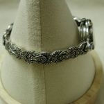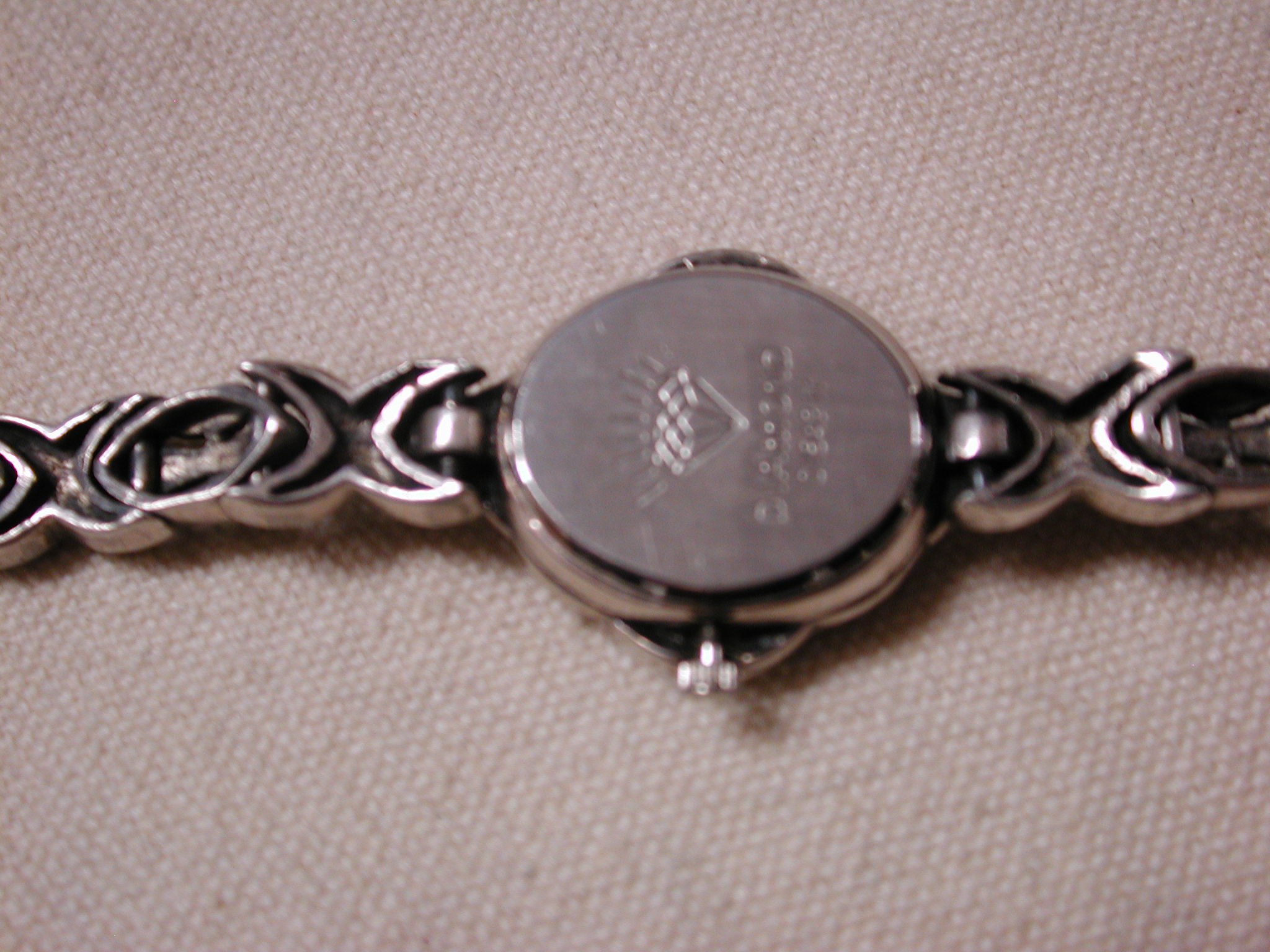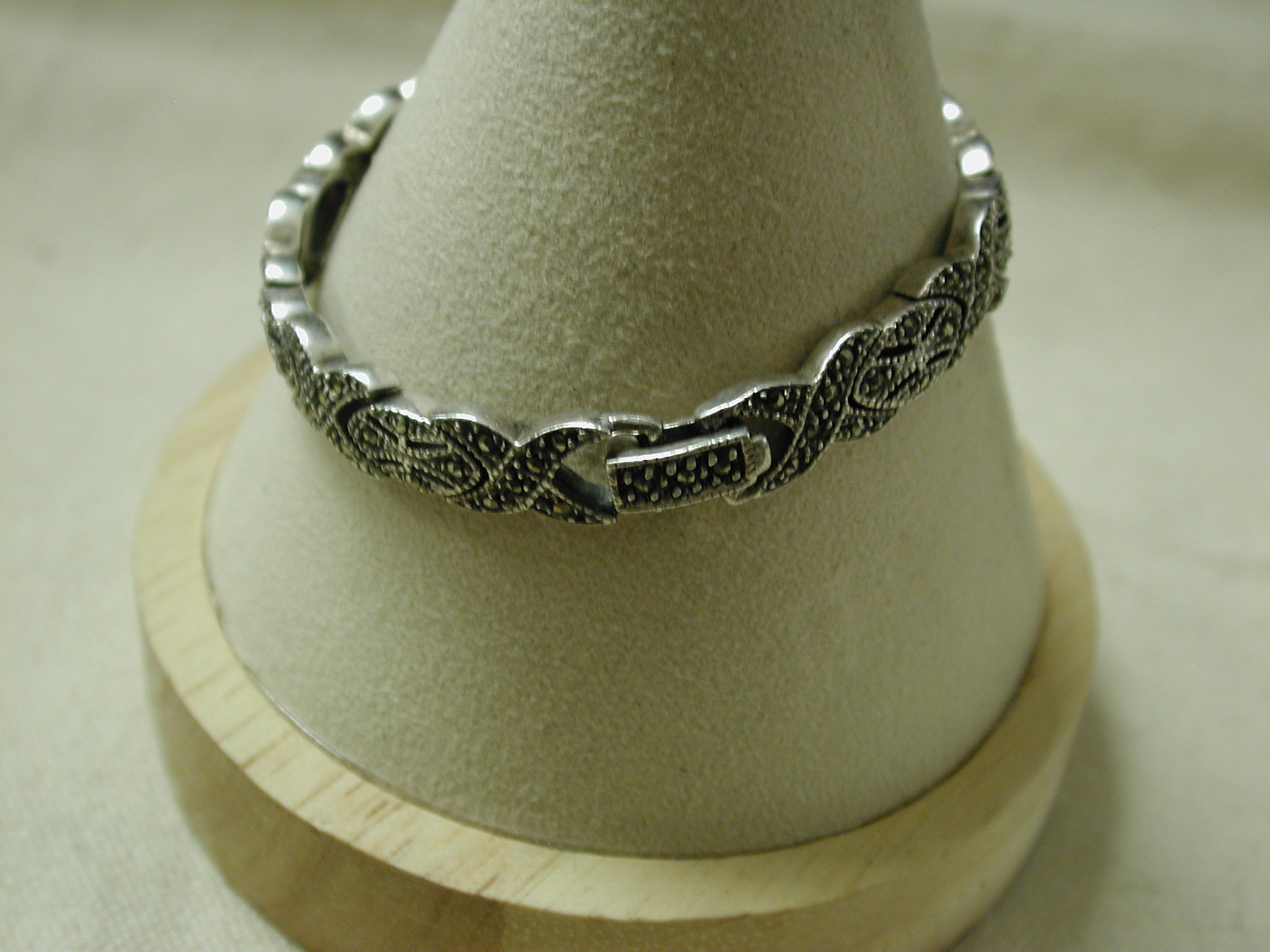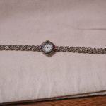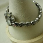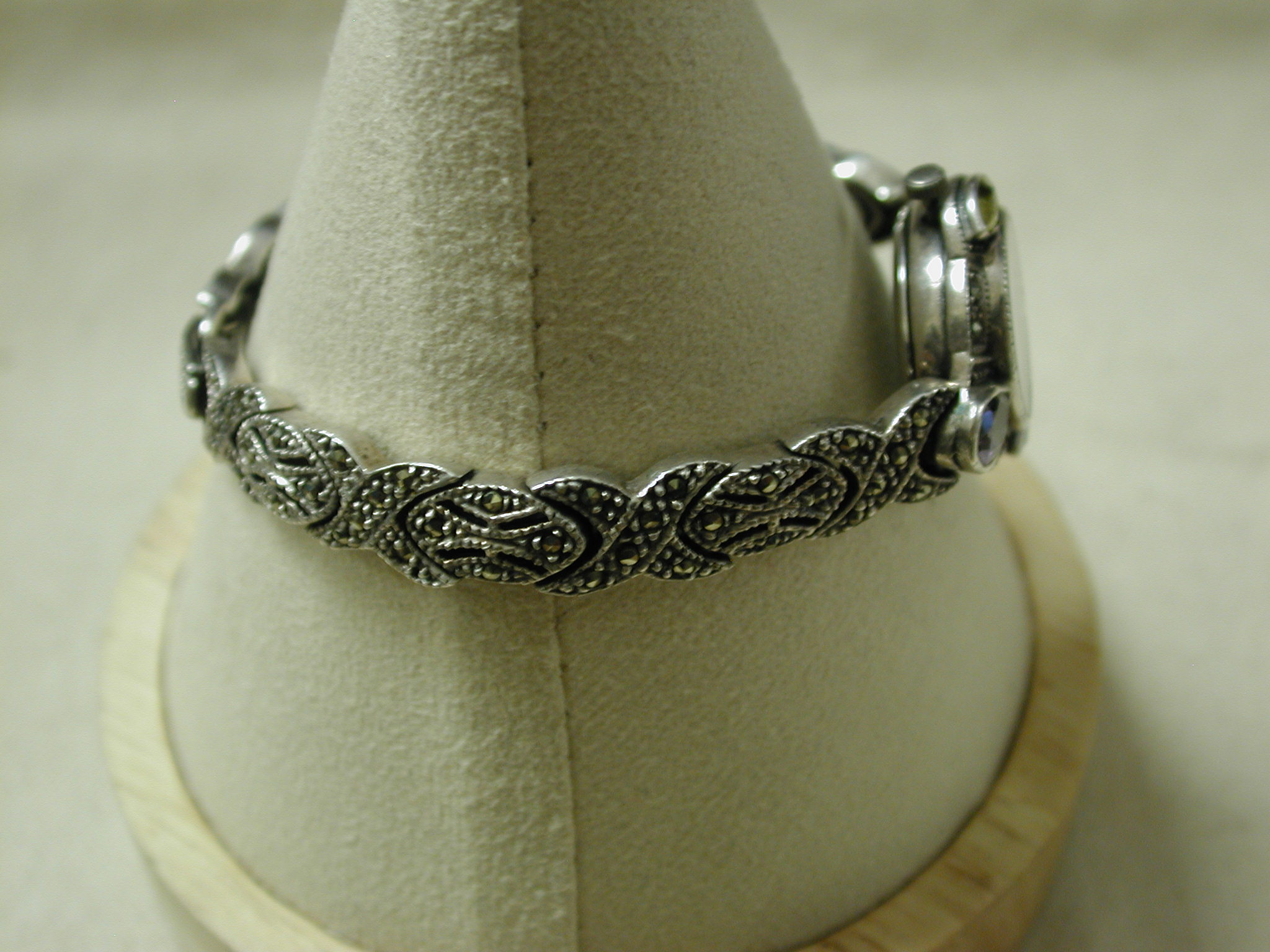 Sterling Marcasite Watch Gemstone Pink Purple Yellow Blue Quartz – measures 7 inches – 23mm face and bracelet is 8mm – tear drop pink and purple stones at 12 and 6 and marquise blue and yellow at 3 and 9. Very pretty watch. We put a new battery and watch is working well.