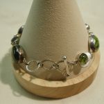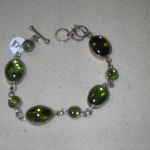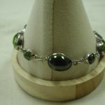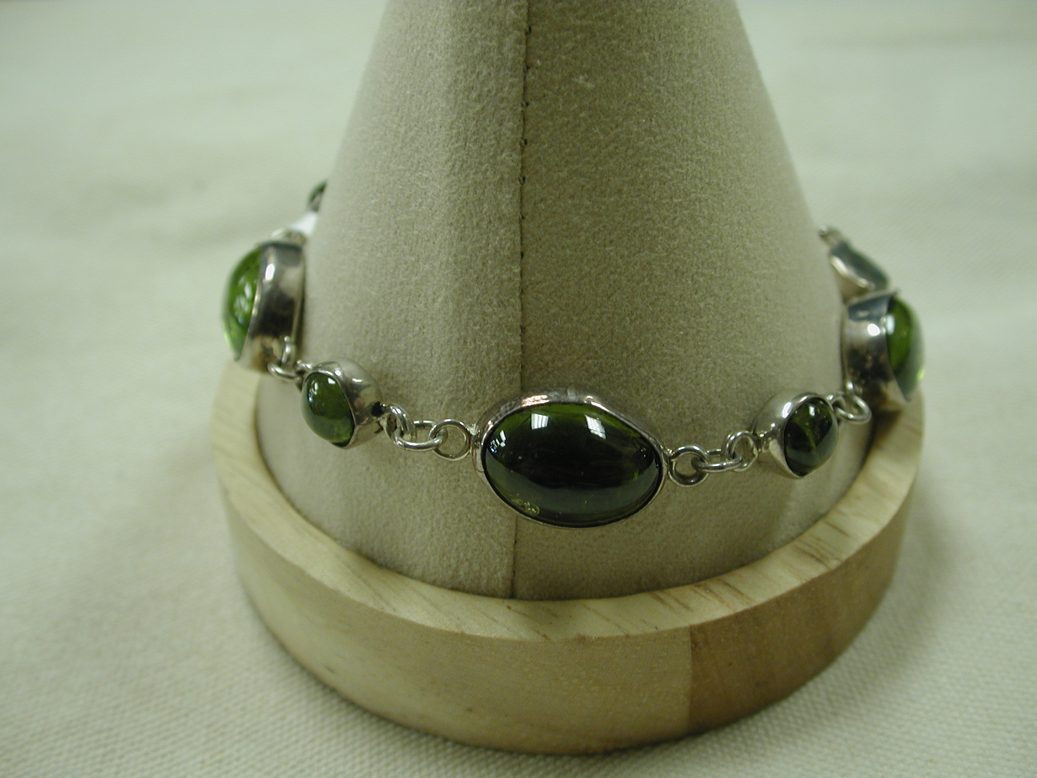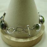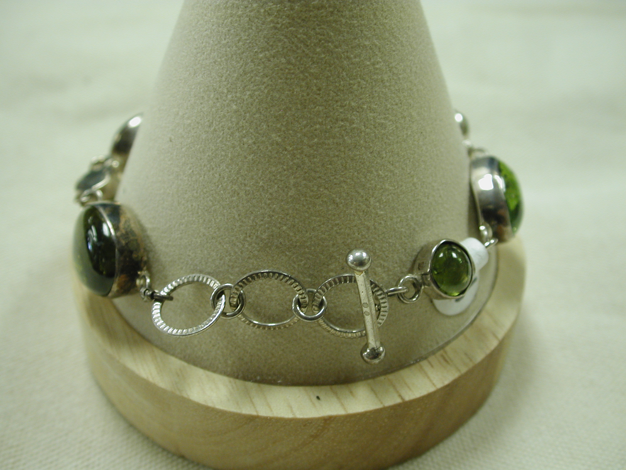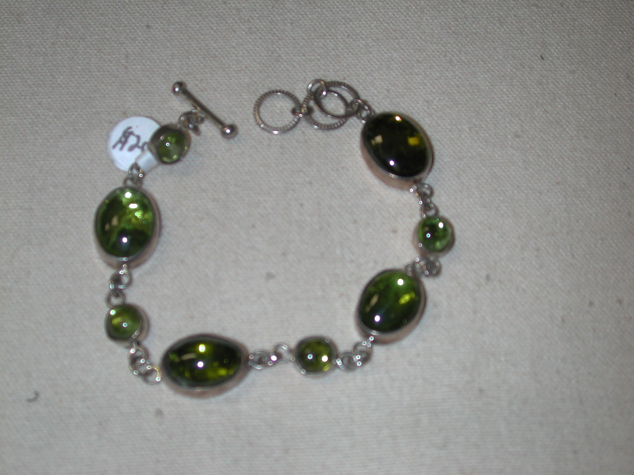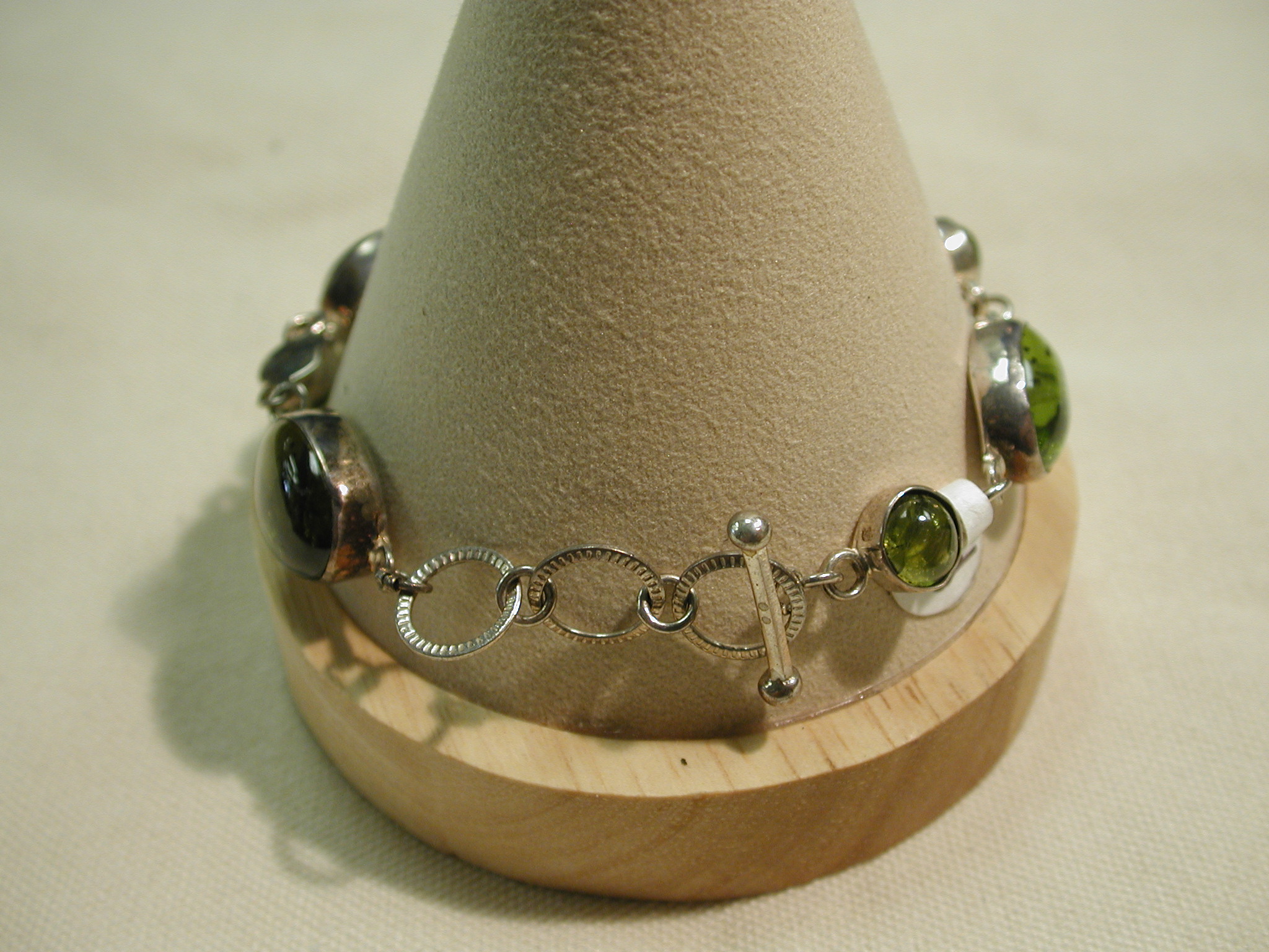 Sterling Silver Green Amber Oval bezel Toggle Bracelet 7-9 inches – well made weighing in at 26.4 grams the green stones are round and oval and quite large – the bracelet will fit a large wrist.