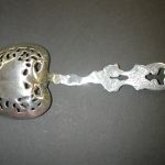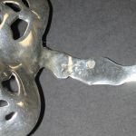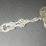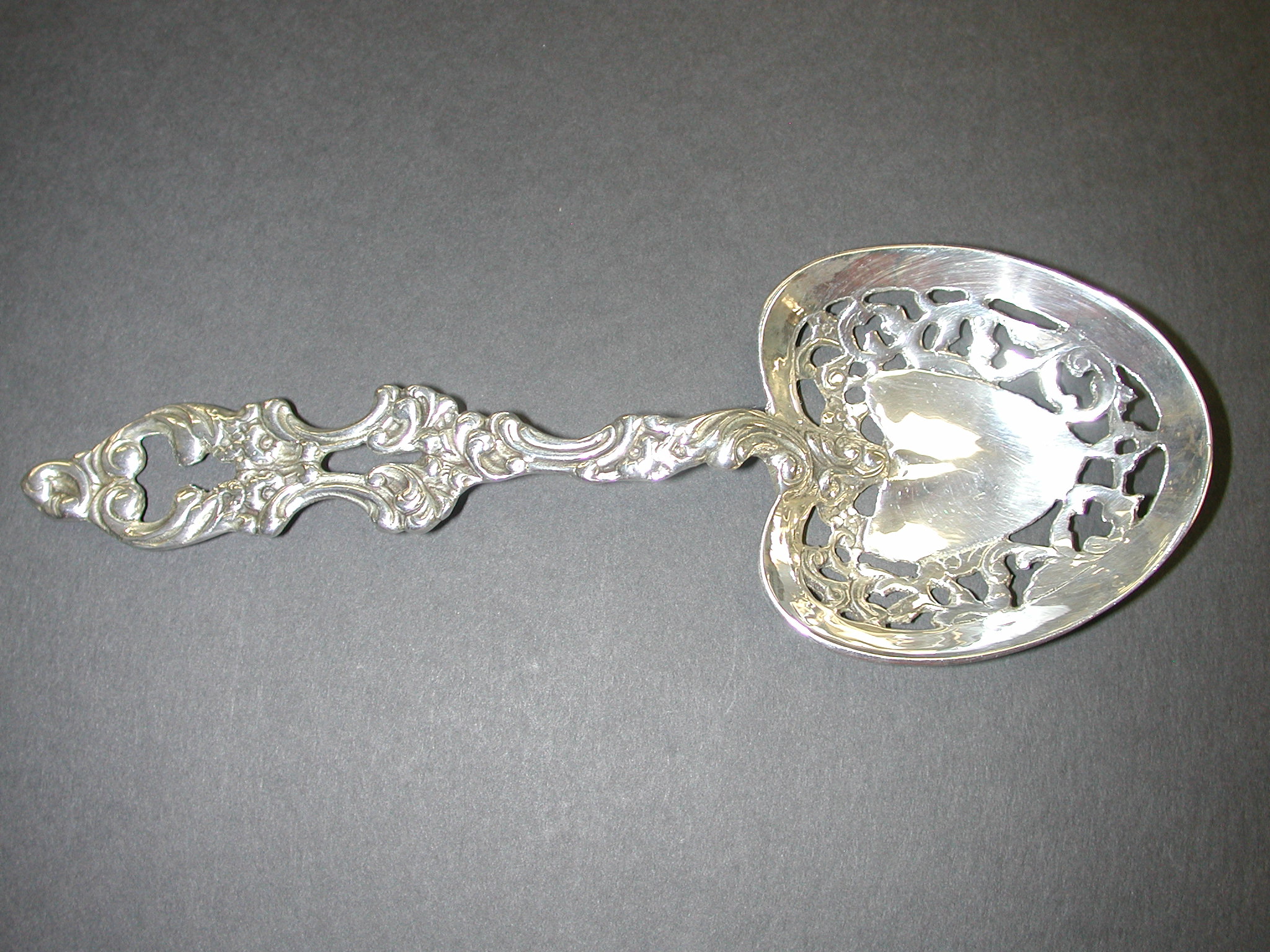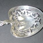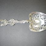 Sterling Repousse Pierced Heart Bowl serving spoon 8″ unknown mark – very heavy and solidly made. Beautiful heart shape spoon. the hallmark is an oval made up of tiny dots and the inside I can not make out.