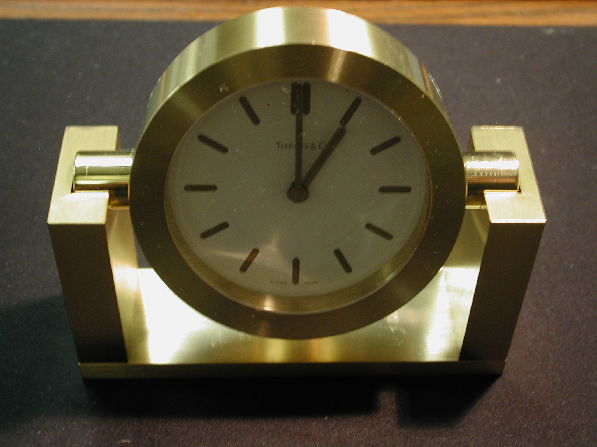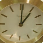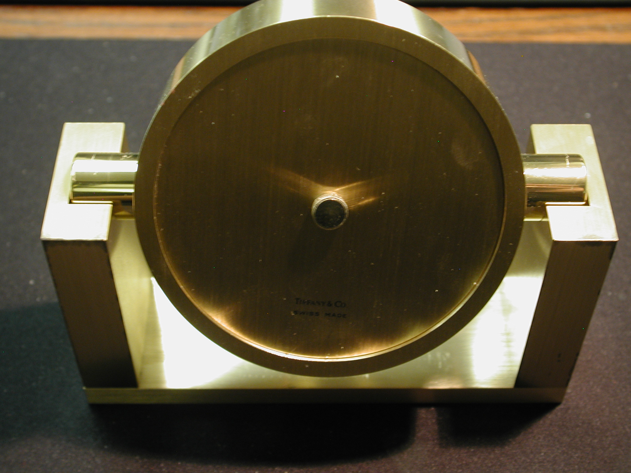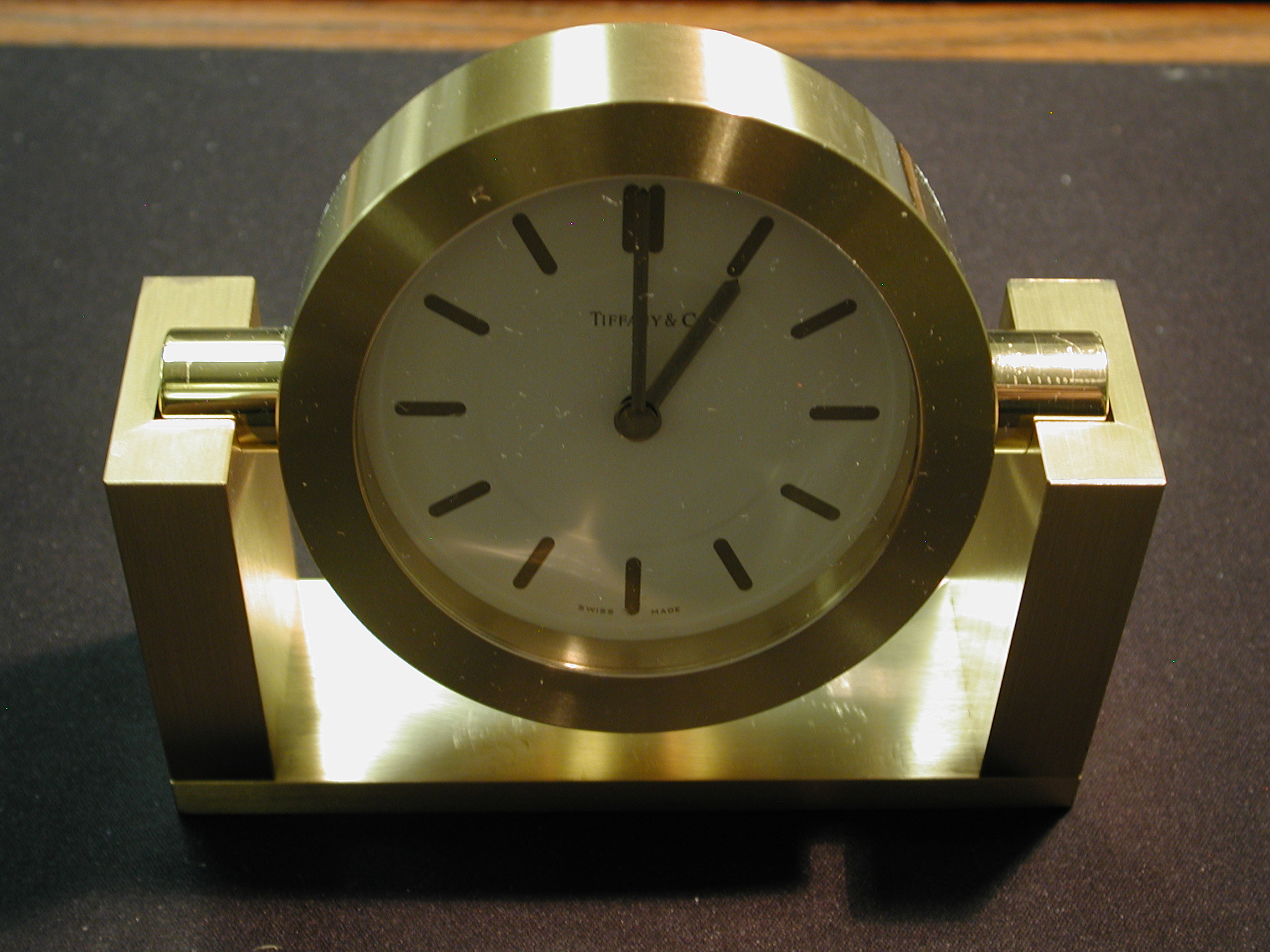 Tiffany & Co. Bronze Swiss Quartz Clock working with box and pouch and instructions – clock is heavy so it won’t topple over on a nightstand – measures 5 inches wide by 4 1/2 inches tall by 1 1/2 inches in depth. Clock portion can be removed from the base and the round dial portion can swivel. We have changed the battery and it is working just fine. I note some minor scratches and some oxidation spotting on the edges of the base. I would think those oxidation areas would polish off with a bronze cleaner. Outer packaging box Tiffany blue box has multiple scuffs and creases. Heavy! it weighs over 3 pounds.