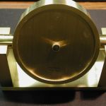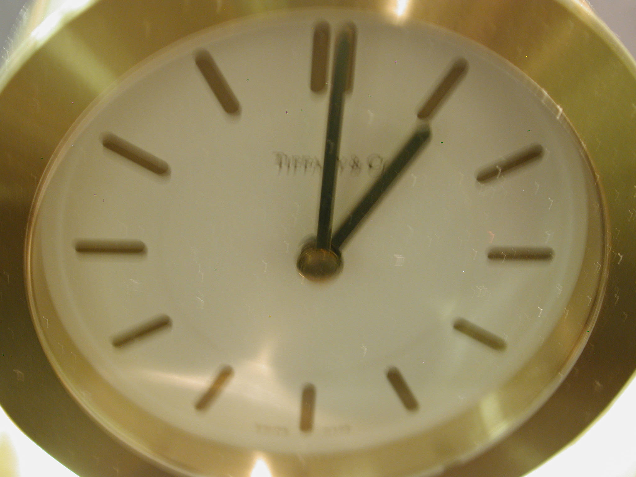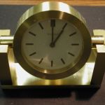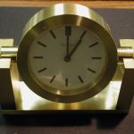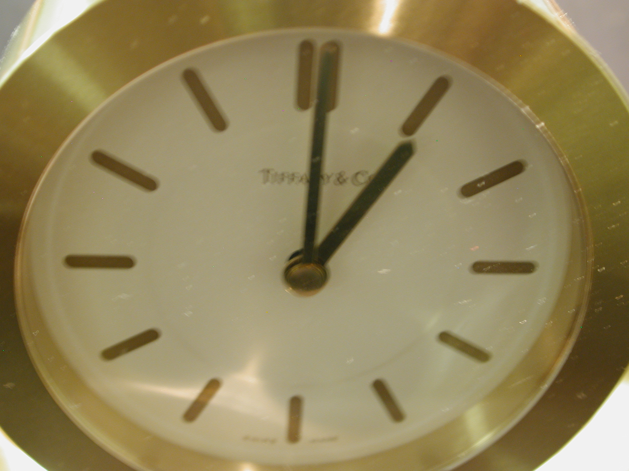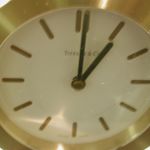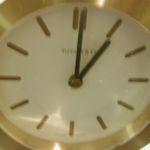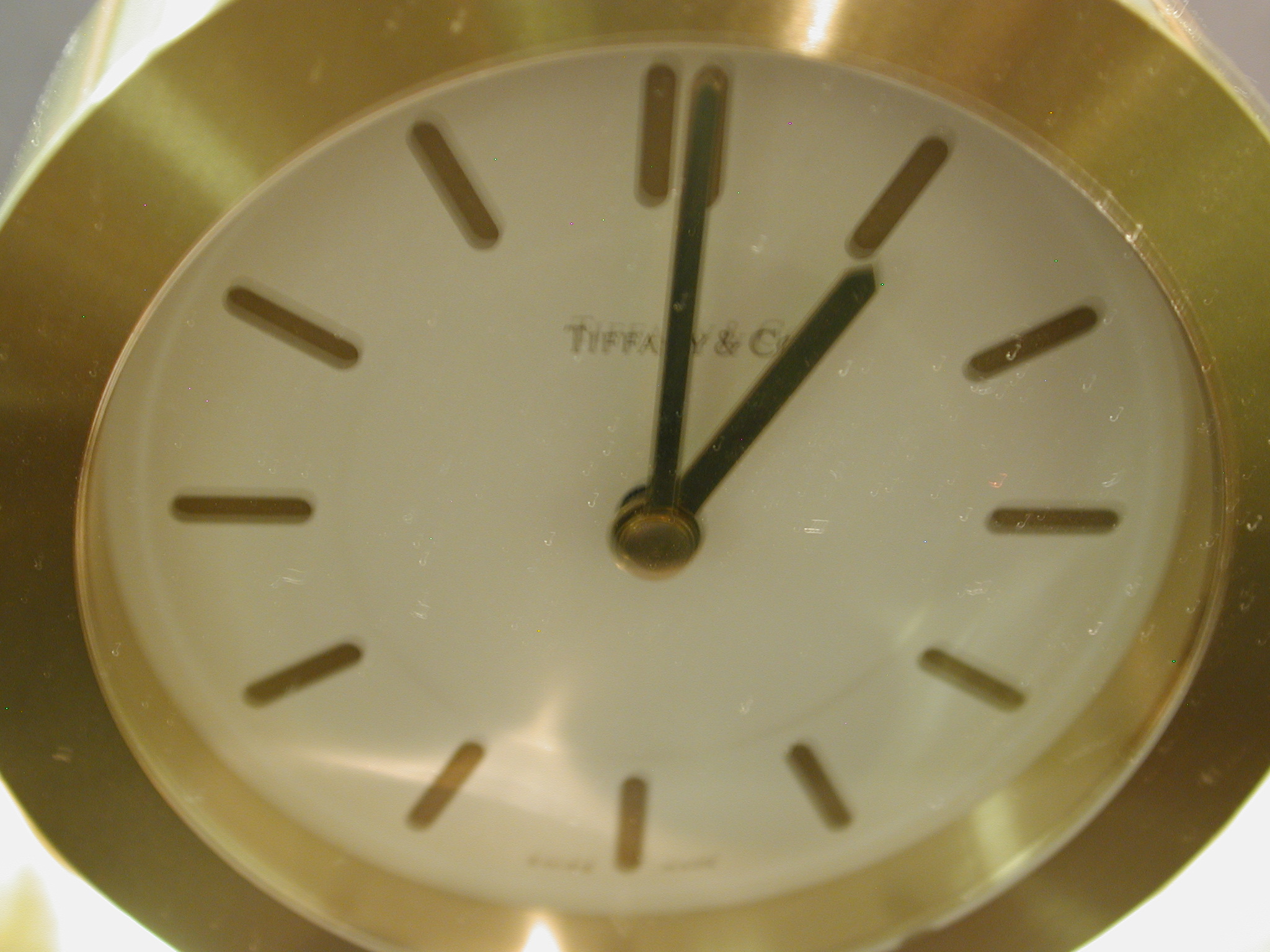 Tiffany & Co. Bronze Swiss Quartz Clock working with box and pouch and instructions – clock is heavy so it won’t topple over on a nightstand – measures 5 inches wide by 4 1/2 inches tall by 1 1/2 inches in depth. Clock portion can be removed from the base and the round dial portion can swivel. We have changed the battery and it is working just fine. I note some minor scratches and some oxidation spotting on the edges of the base. I would think those oxidation areas would polish off with a bronze cleaner. Outer packaging box Tiffany blue box has multiple scuffs and creases. Heavy! it weighs over 3 pounds.