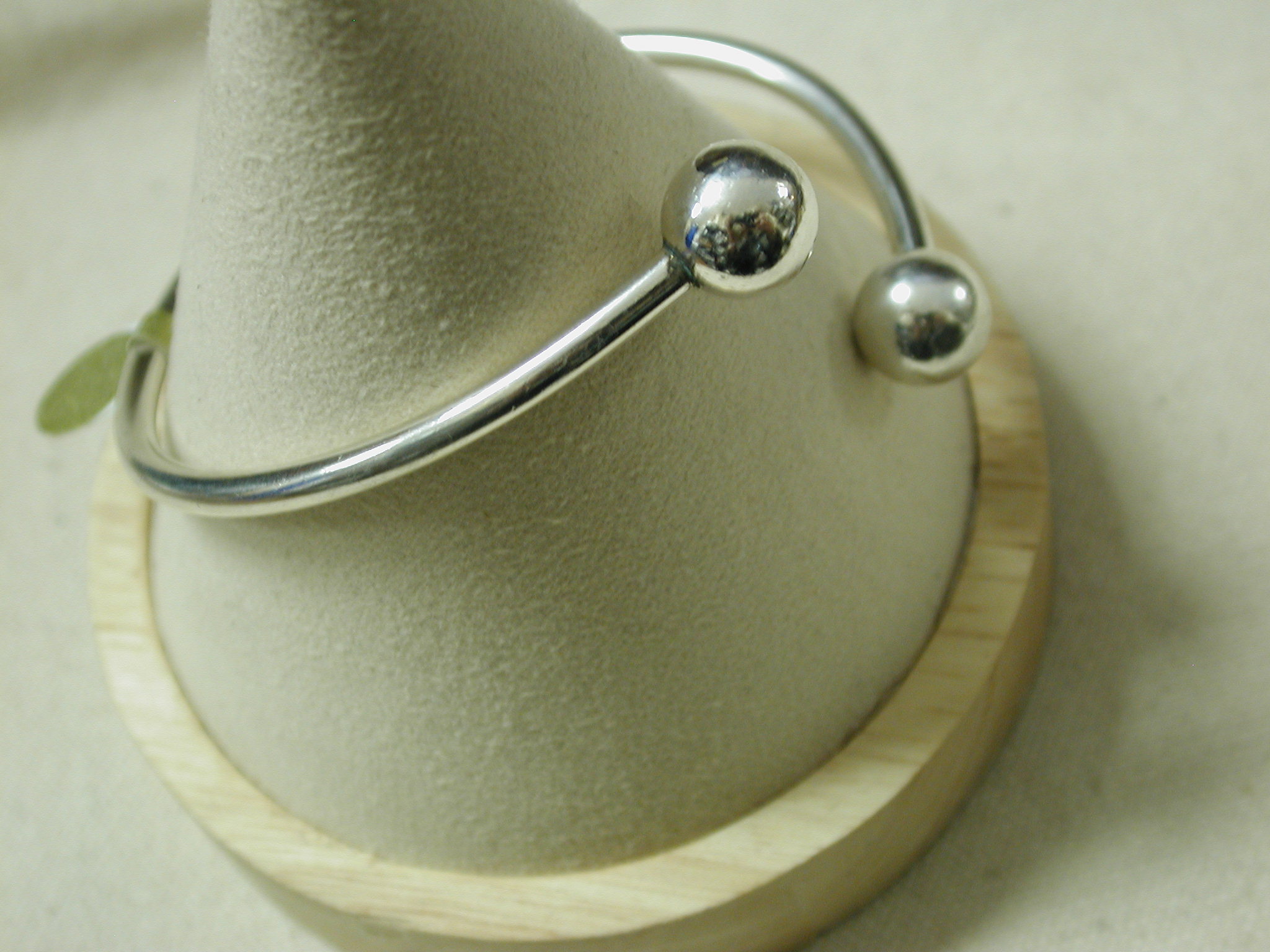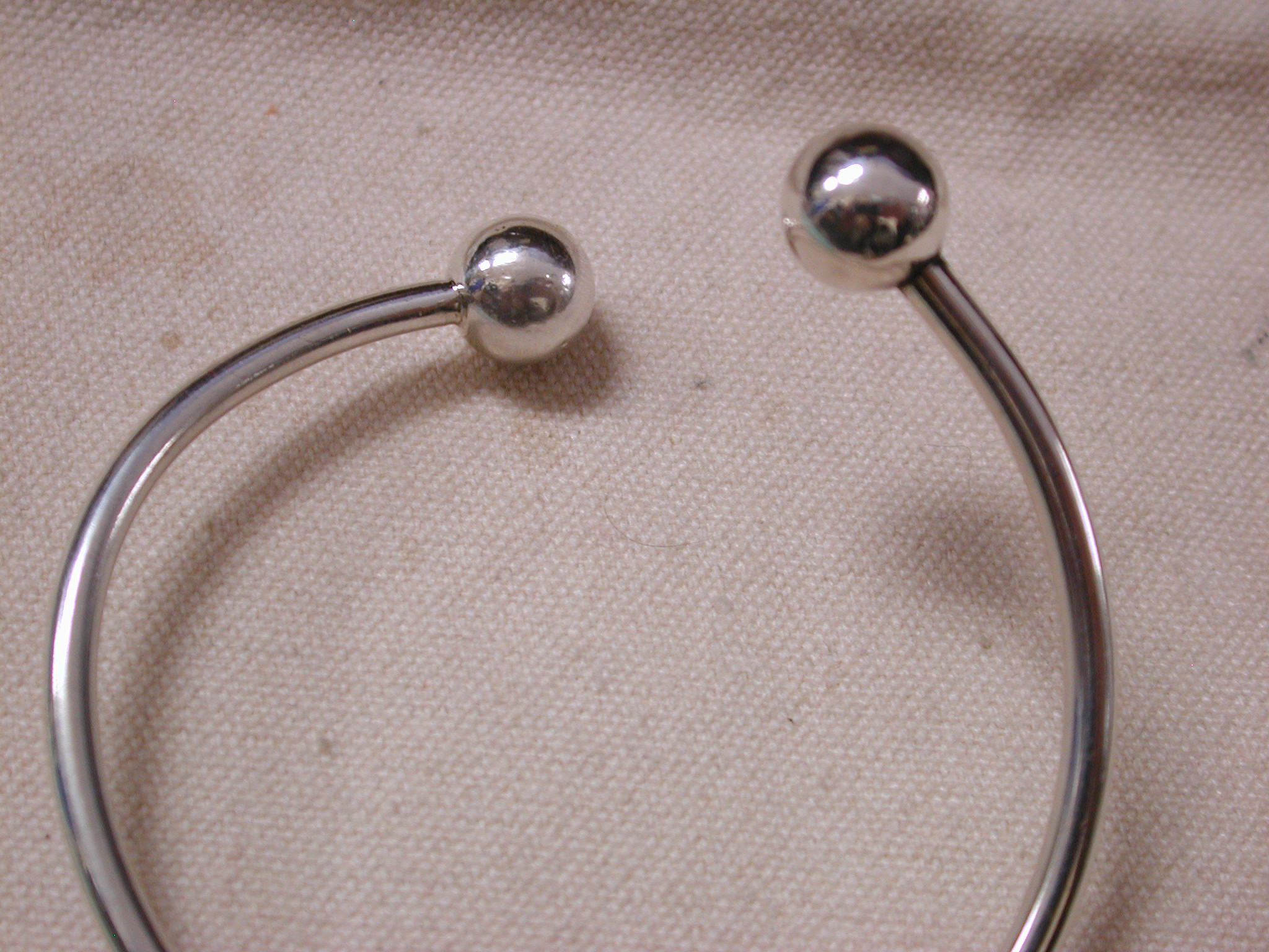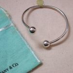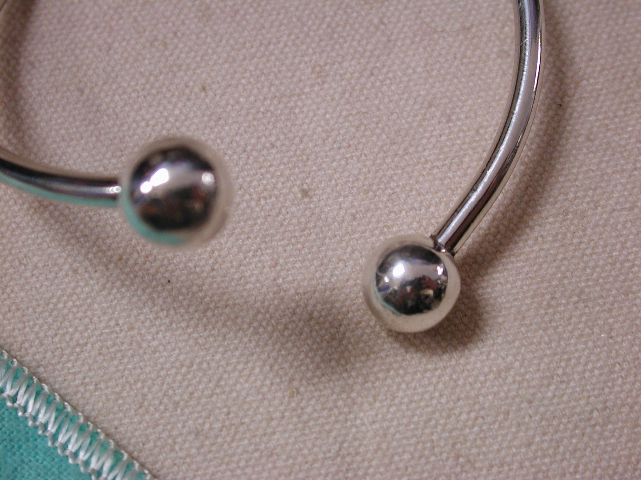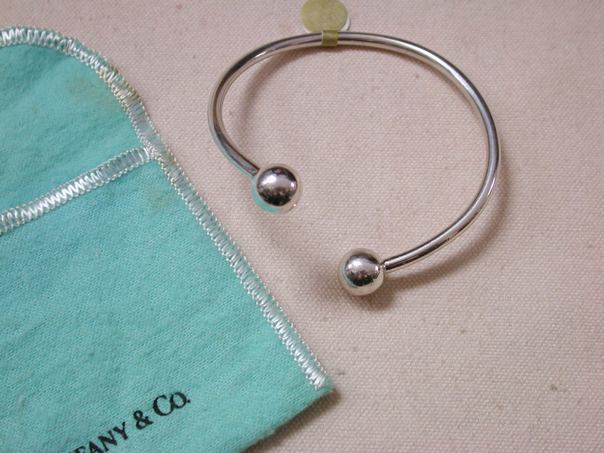 Tiffany Sterling Bypass Cuff 11mm Ball Bangle Vintage – this vintage piece is rare – solid bangle with solid balls on the ends – it is assymetrical and looks amazing on. Will fit a standard 7 inch wrist – it is NOT flexible so you have to be able to get your wrist into the 1″ space between the balls. I note a slight bend in the tubing from wear – its very slight see the photos and the two balls under a loupe you can see some slight dings and scuffs. The bracelet measures 2 5/8 inches wide. The tubing portion is 3mm round. Hallmarked Tiffany & Co. Sterling and weighs 22 grams. Will come with the tiffany pouch but I note it has a few spots from aging.