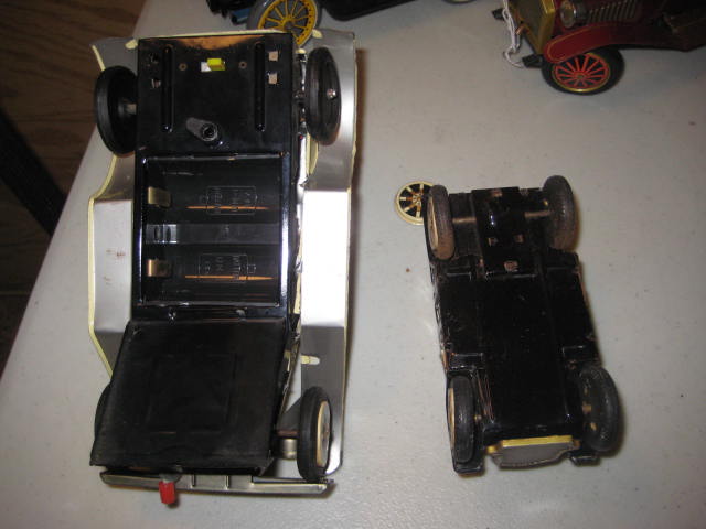1 – smaller 6 inches long and it is tin but I don’t think its battery operated – just friction. All parts appeart to be intact I note some paint chips and corrosion
