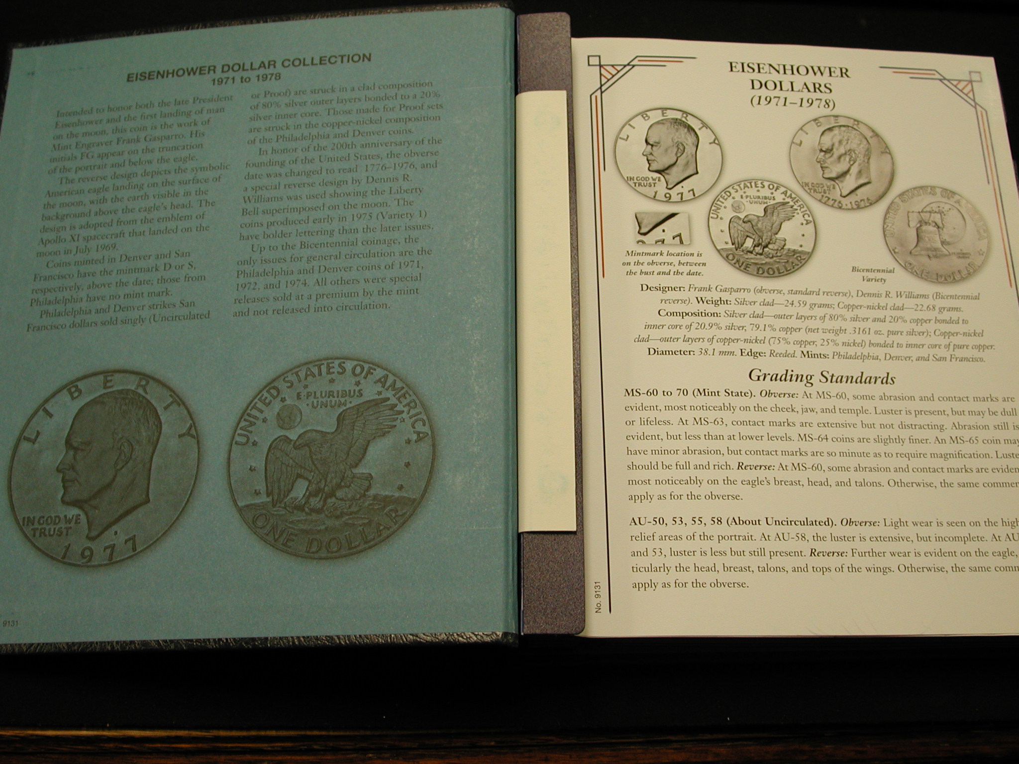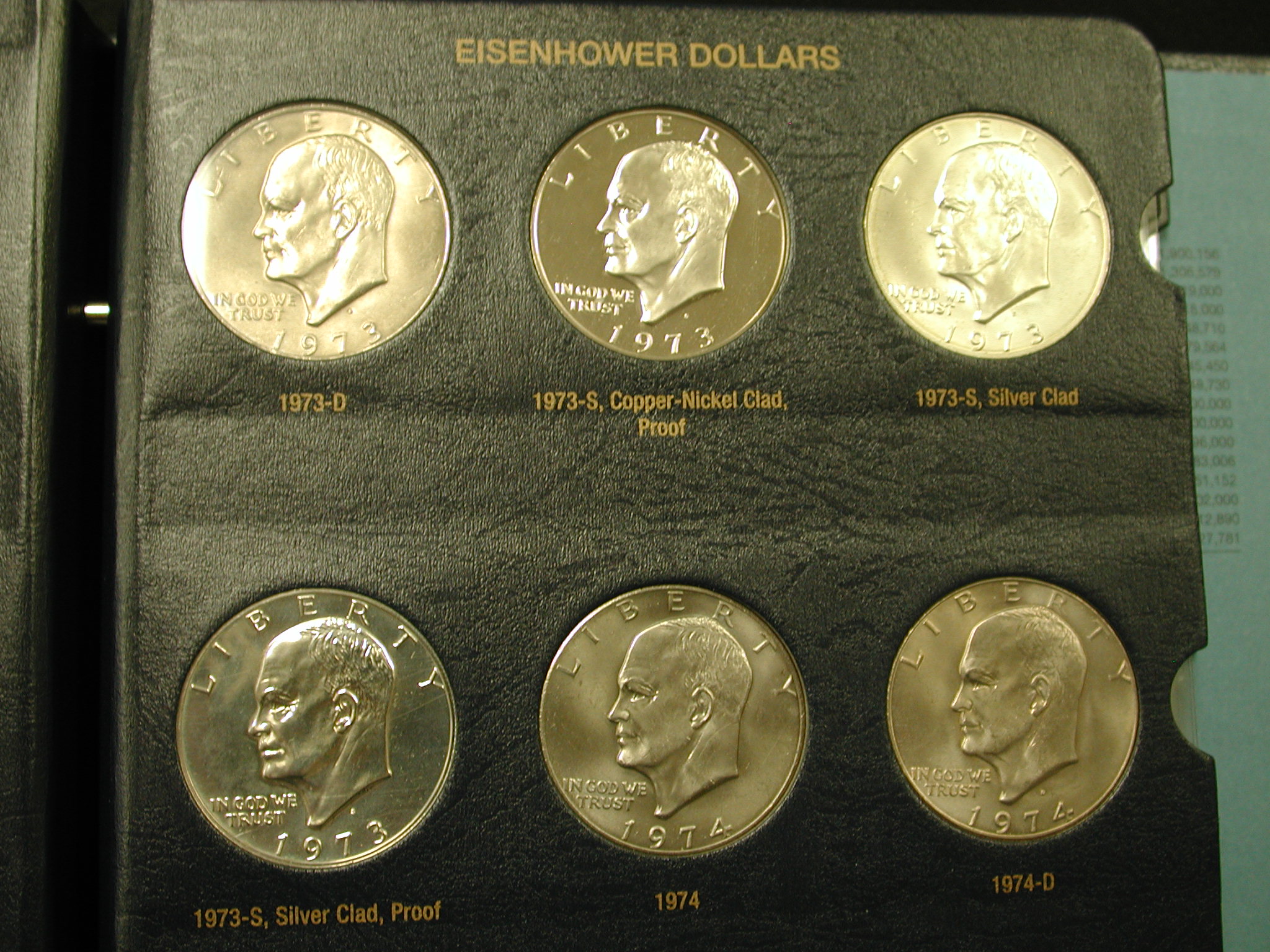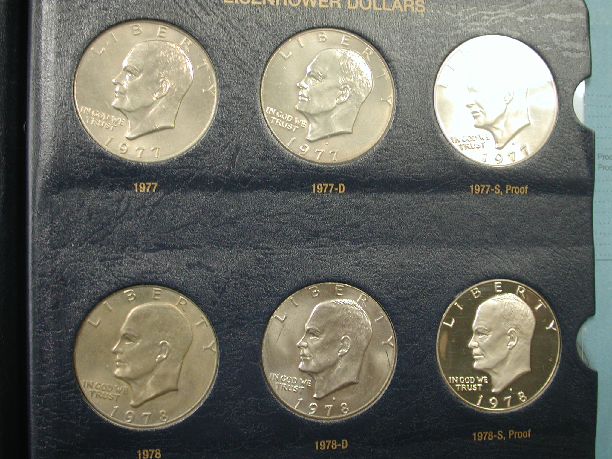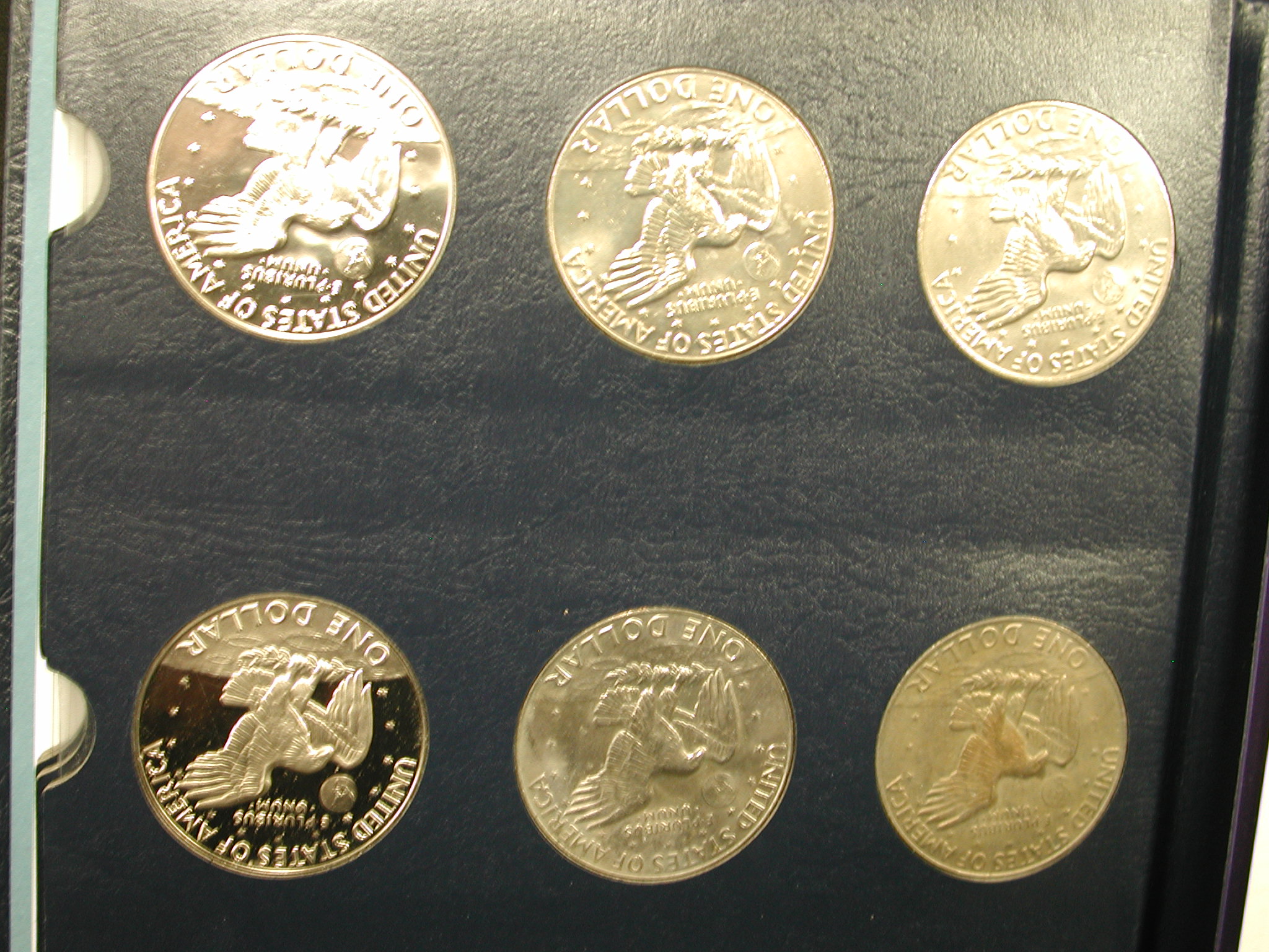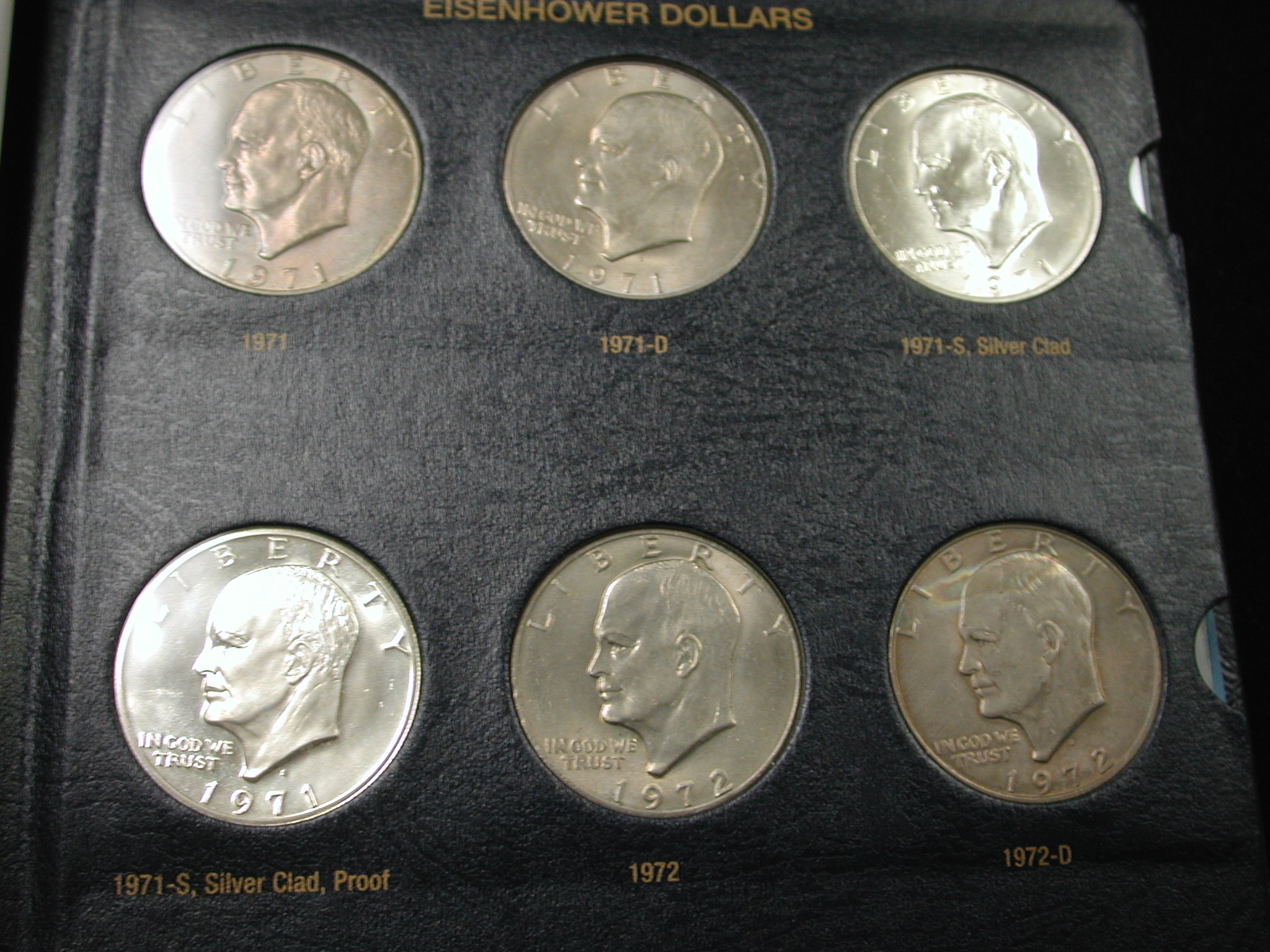 1971-1978 Eisenhower Dollars Philiadelphia, Denver, SF Mints – Amazing full set of 32 uncirculated Eisenhower dollars 1971-1978 in Whitman book. The set includes 1971, 1971-D, 1971-S Silver Clad, 1971-S Silver Clad Proof, 1972, 1972-D, 1972-S Silver Clad, 1972-S Silver Clad Proof, 1973, 1973-D, 1973-S Copper-Nickel Clad Proof, 1973-S Silver Clad, 1973-S Silver Clad Proof, 1974, 1974-D, 1974-S Copper-Nickel Clad Proof, 1974-S Silver Clad, 1974-S Silver Clad Proof, 1776-1976 Variety 1, 1776-1976 Variety 2, 1776-1976-D Variety 1, 1776-1976-D variety 2, 1776-1976-S Copper-Nickel Clad Variety 1 Proof, 1776-1976-S Copper-Nickel Clad Variety 2 Proof, 1776-1976-S Silver Clad Variety 1, 1776-1976-S Silver Clad Variety 1 Proof, 1977, 1977-D, 1977-S Proof, 1978, 1978-D, & 1978-S Proof. No Eisenhower dollars were struck in 1975. The coins and book are in great condition and the book measures about 7.25” x 9”. Any questions please message me. Thanks for looking.