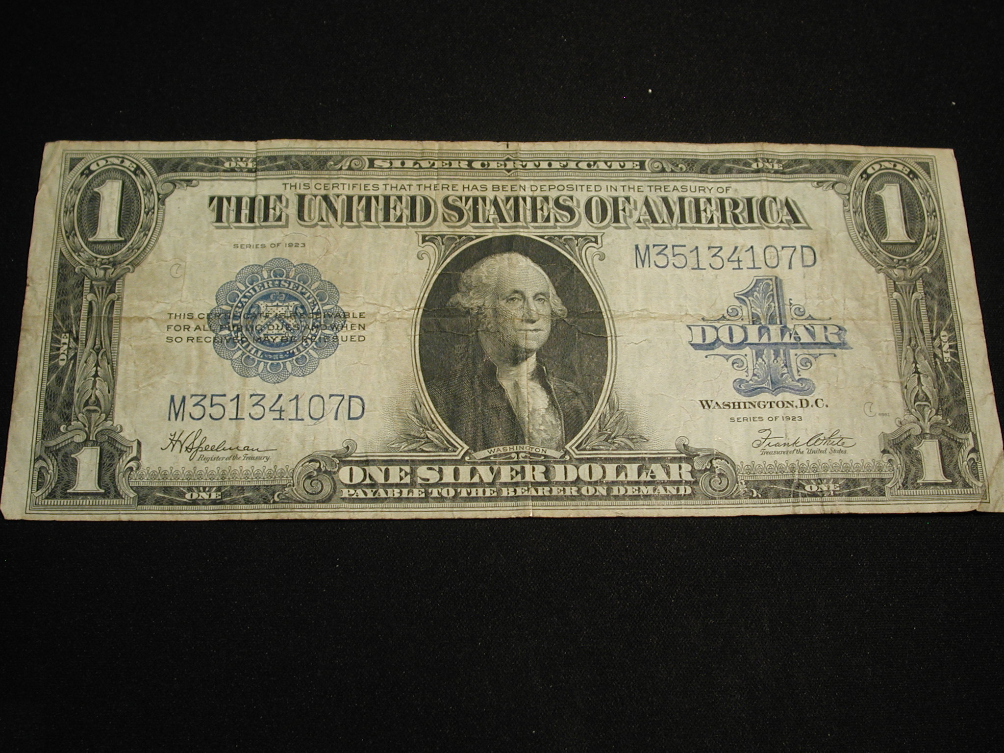 U.S One Dollar Silver Certificate 1923 Series 1923 U.S One Dollar Silver Certificate FR 237 VF – multiple folds including horizontal – light staining – paper is limp