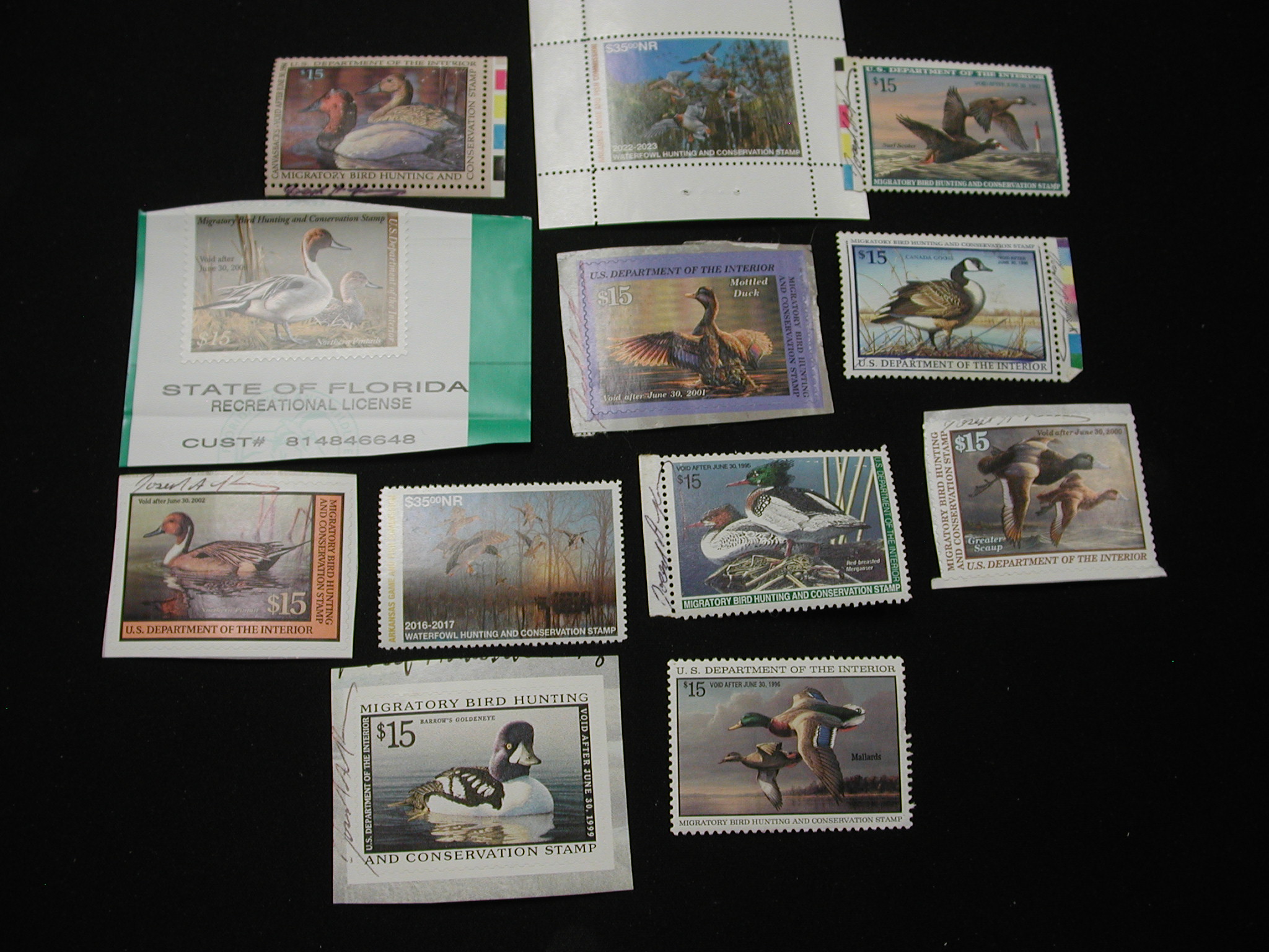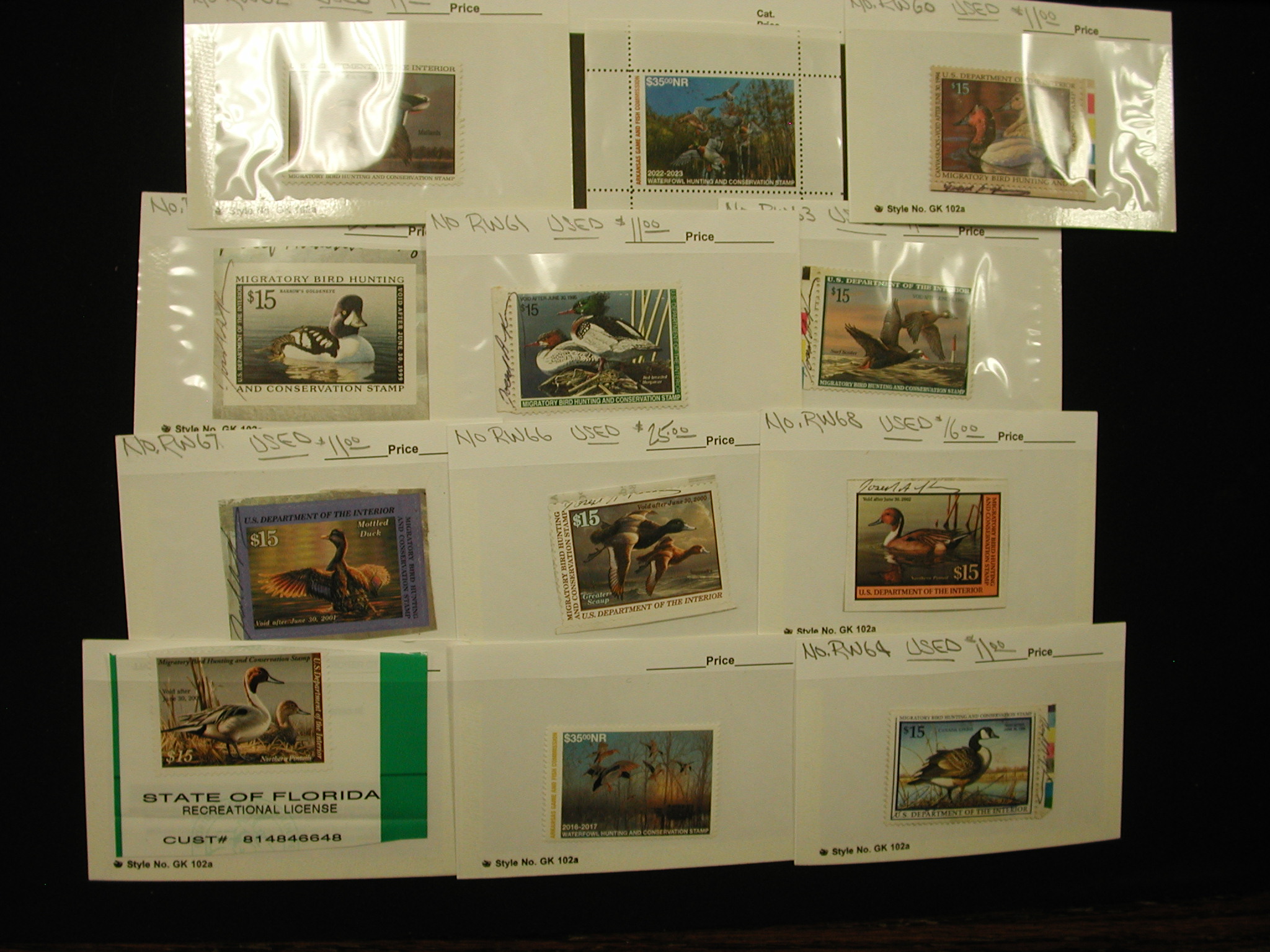 Lot of Used Duck Stamps – RW60-68 and 3 more – $15 Northern Pintails, $35 Waterfowl Hunting 2022 and $35 Waterfowl Hunting from 2016