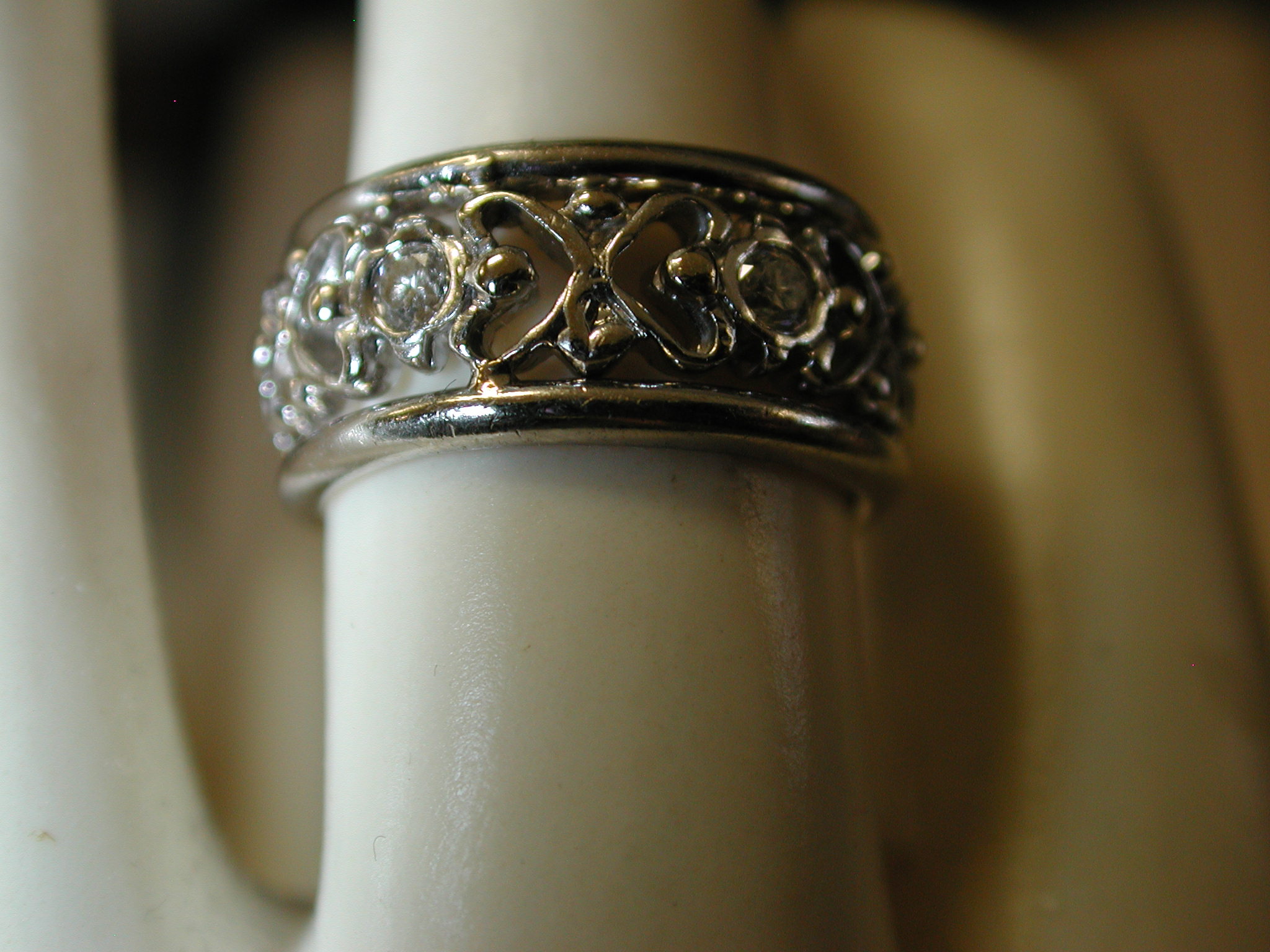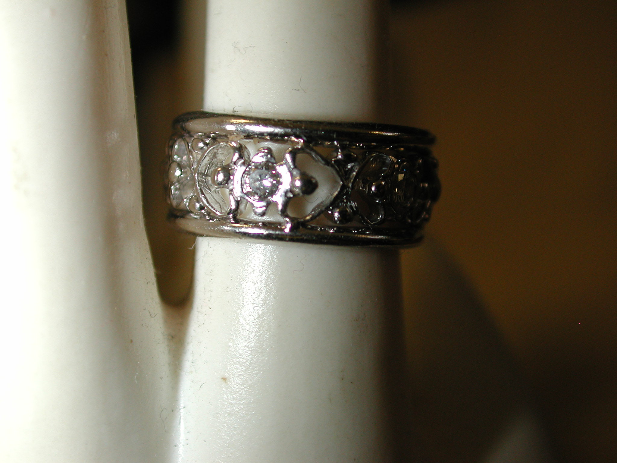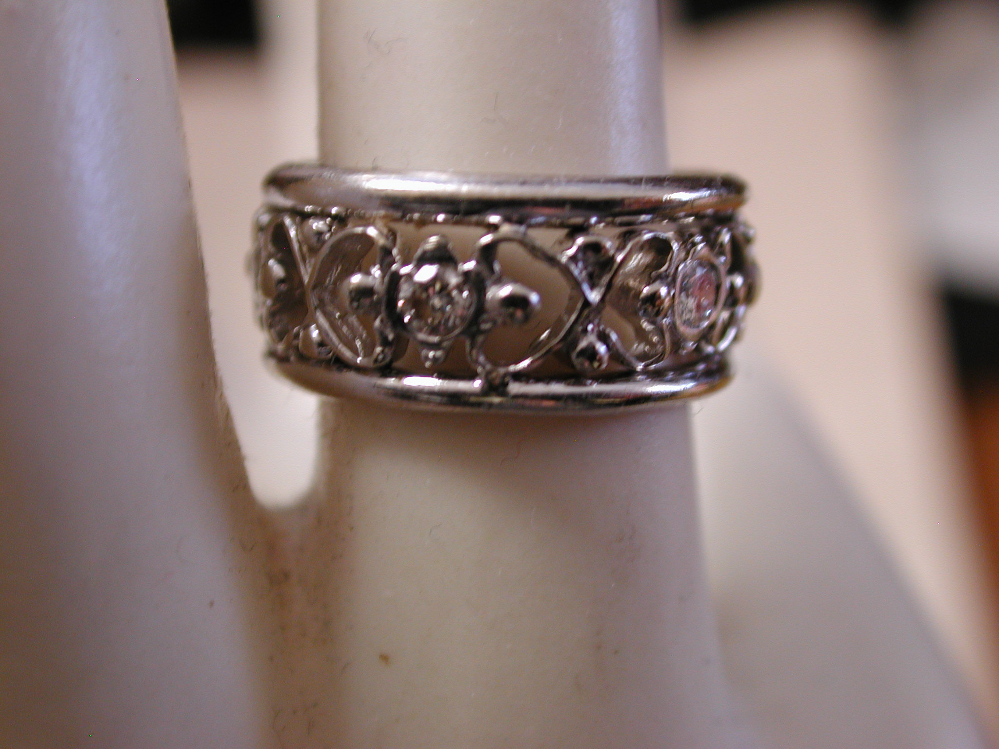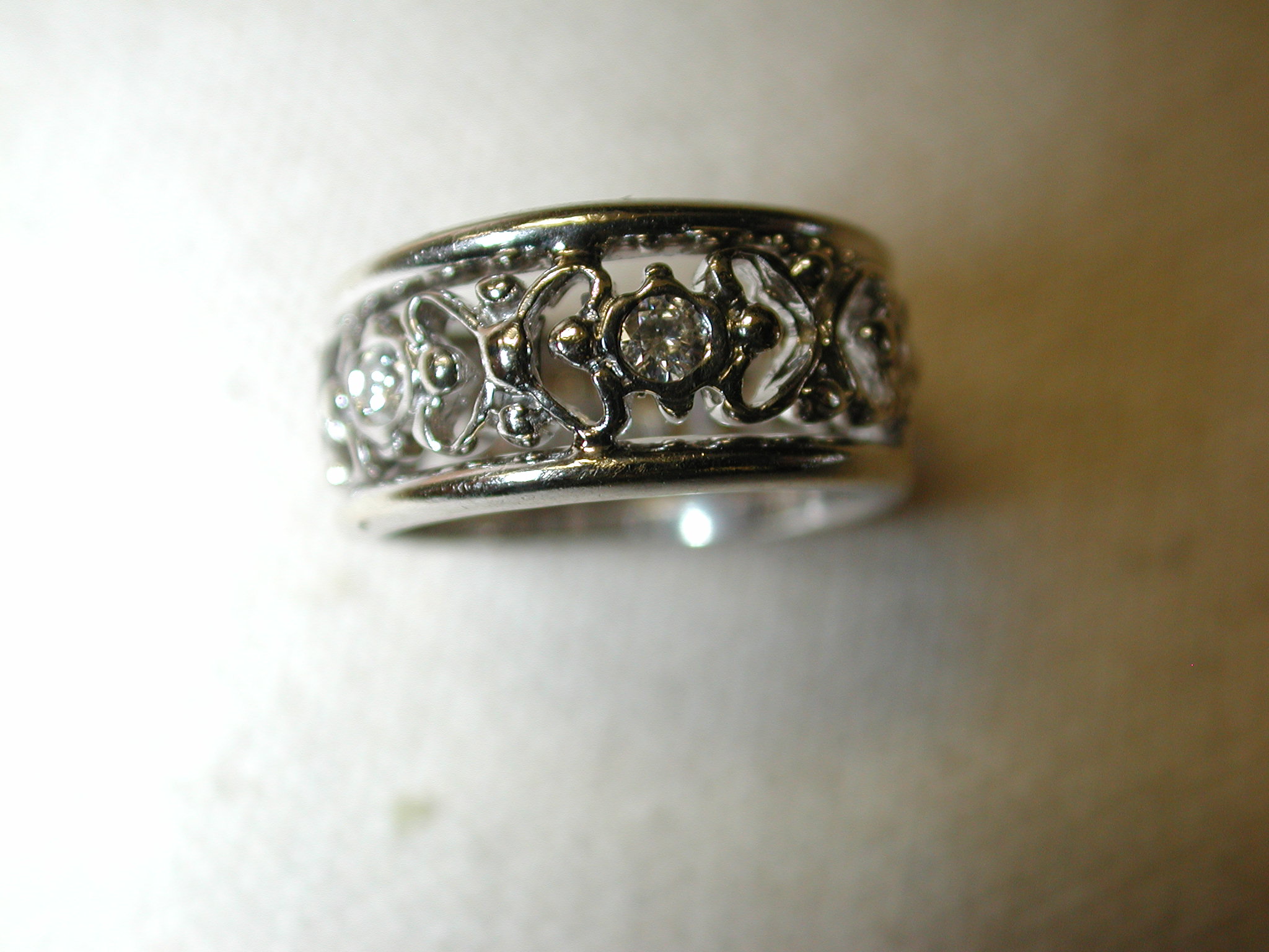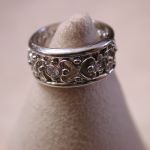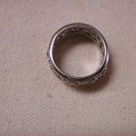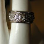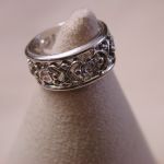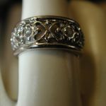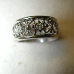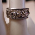 14KT 8mm Filigree Diamond cigar band interlocking hearts size 5 – stamped and tests 14KT weighs 6.2 grams. Ring is well made and solid – is 8mm in width and has a pierced cut out filigree pattern of interlocking hearts with 7 round brilliant cut natural diamonds The diamonds are approx. .05 points each, H color, SI1 clarity. So total weight is approx. .35 points – 1/3 of a carat. Ring is a size 5 however because it is a wide band if you are are a 4 1/2 or 4 3/4 this should fit well. If you are a size 5 it may be too snug. Can not be sized due to the intricate workmanship.