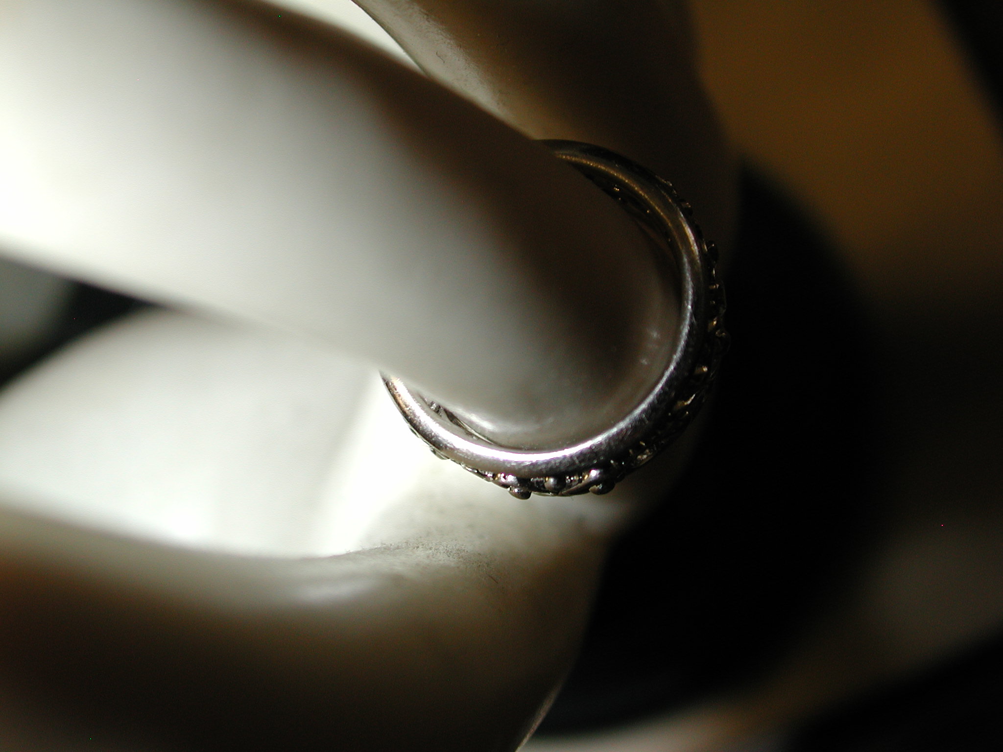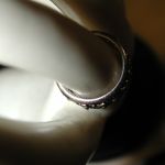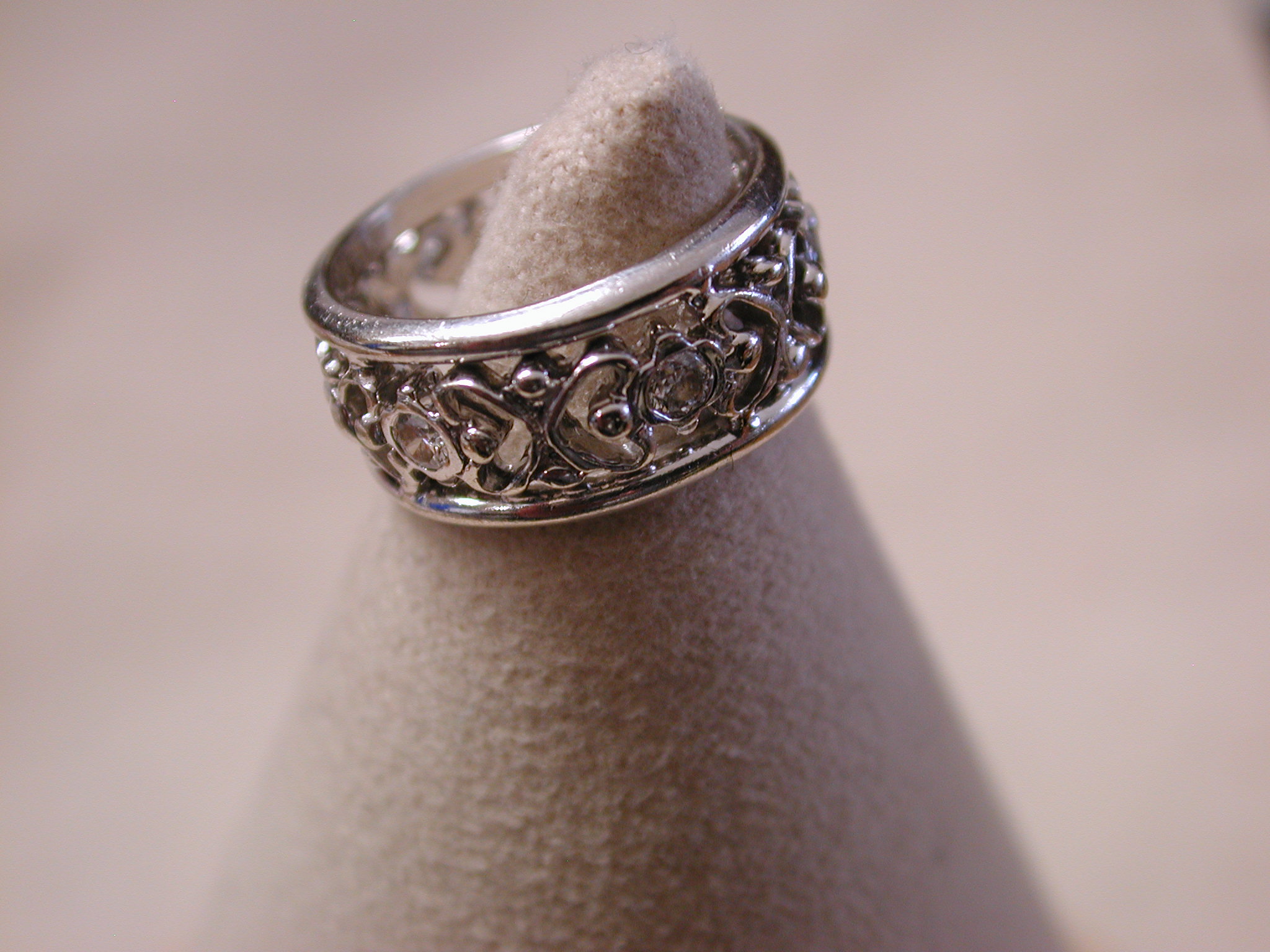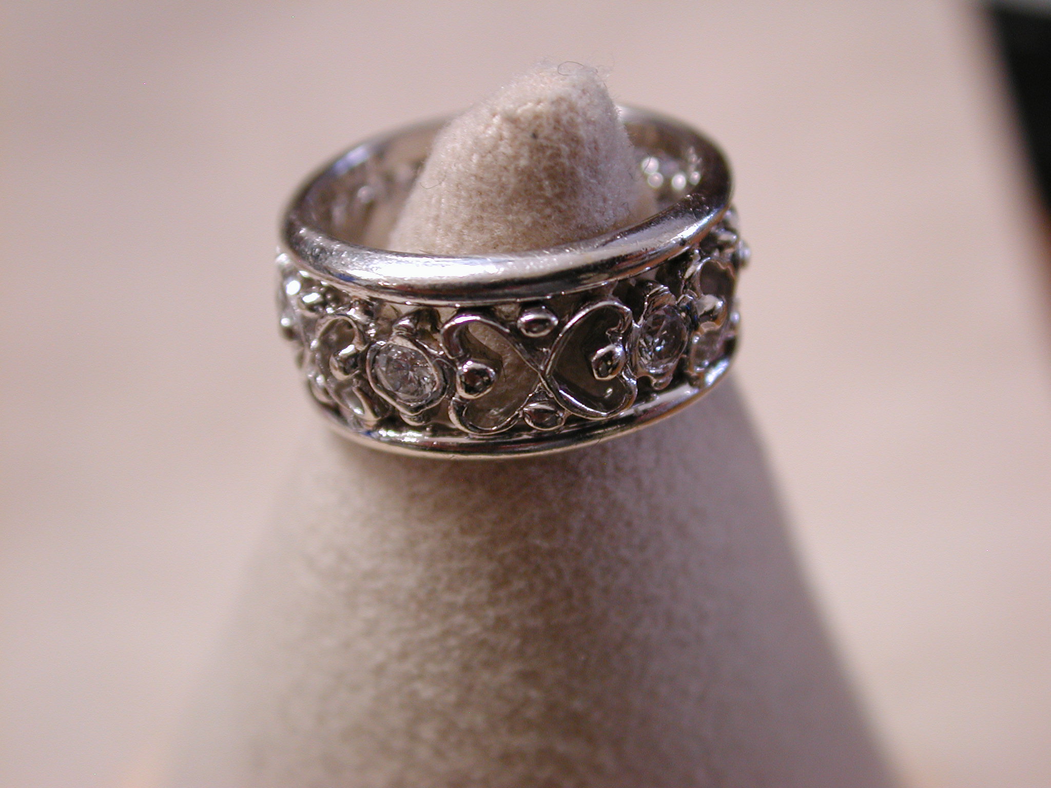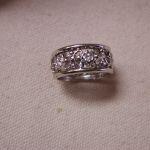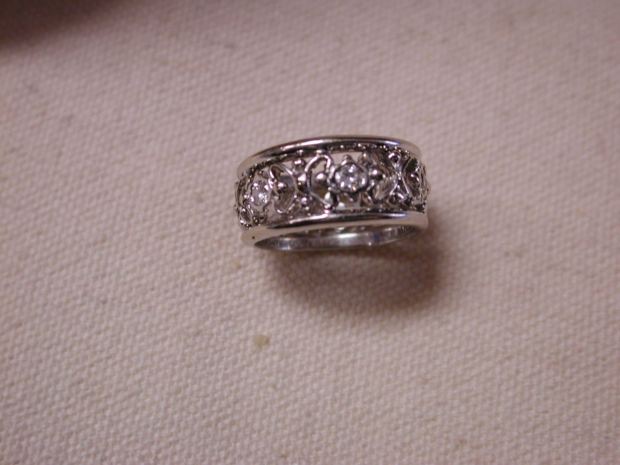 14KT 8mm Filigree Diamond cigar band interlocking hearts size 5 – stamped and tests 14KT weighs 6.2 grams. Ring is well made and solid – is 8mm in width and has a pierced cut out filigree pattern of interlocking hearts with 7 round brilliant cut natural diamonds The diamonds are approx. .05 points each, H color, SI1 clarity. So total weight is approx. .35 points – 1/3 of a carat. Ring is a size 5 however because it is a wide band if you are are a 4 1/2 or 4 3/4 this should fit well. If you are a size 5 it may be too snug. Can not be sized due to the intricate workmanship.