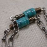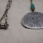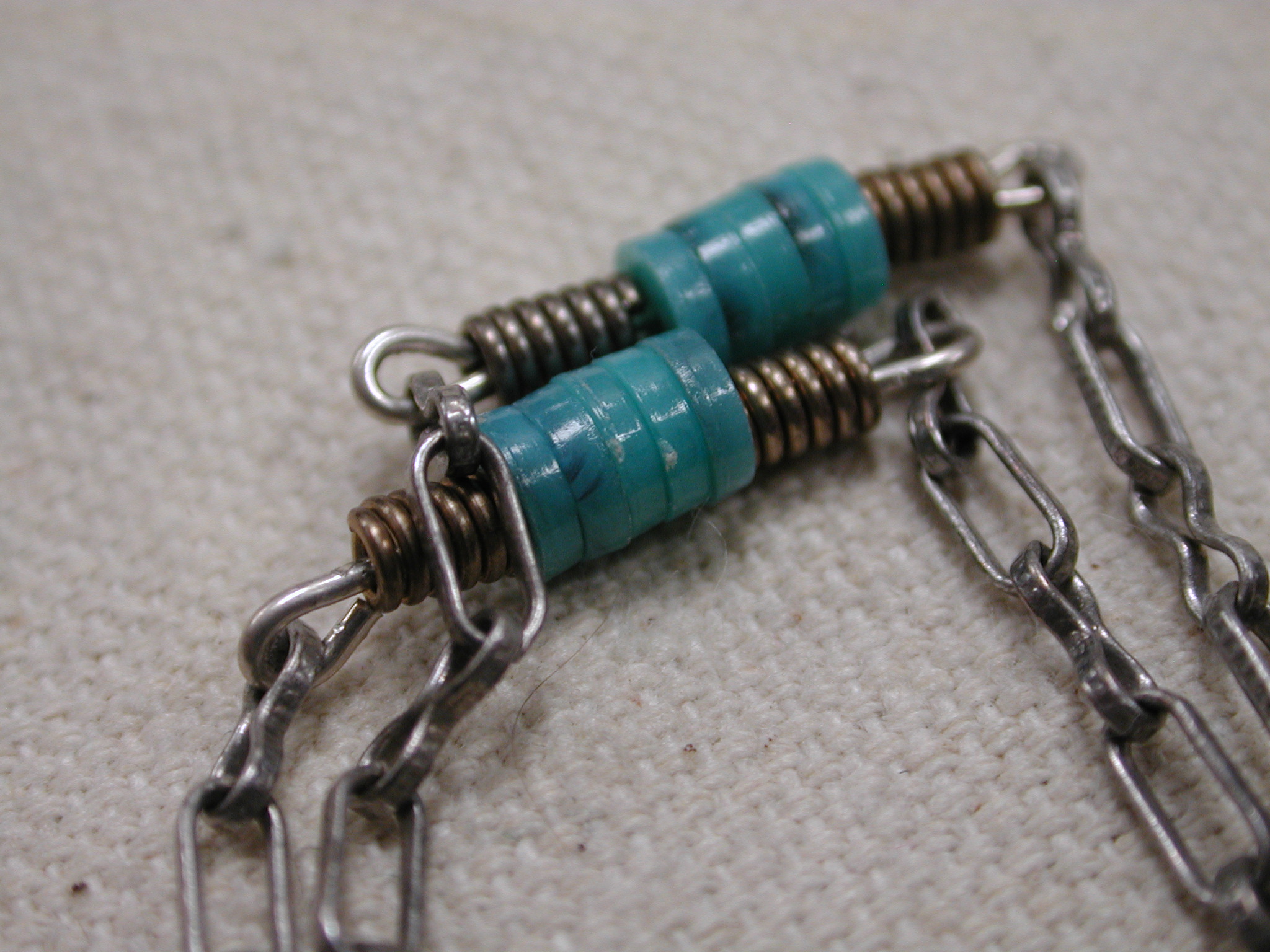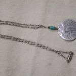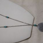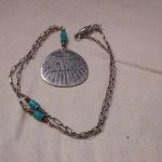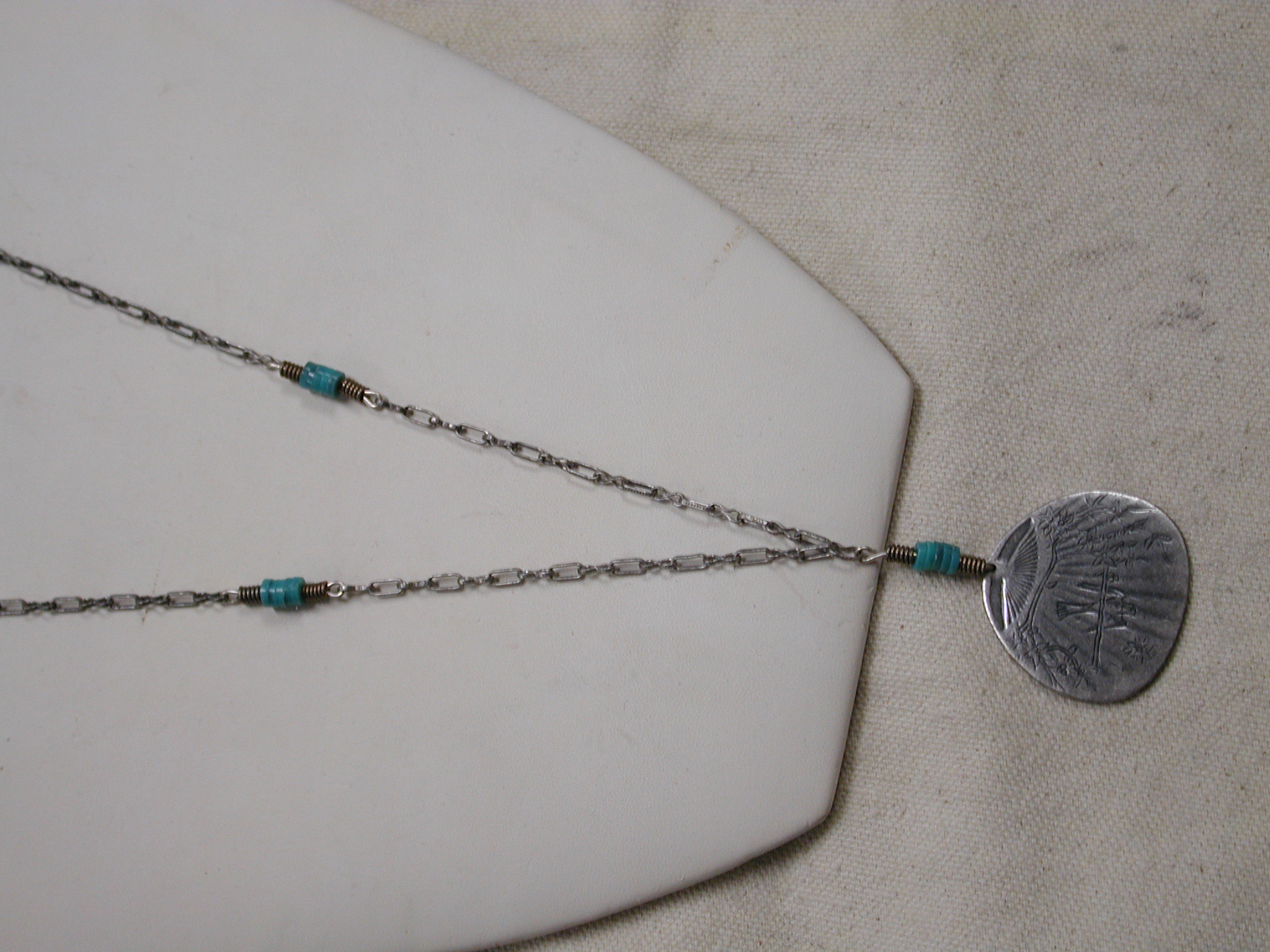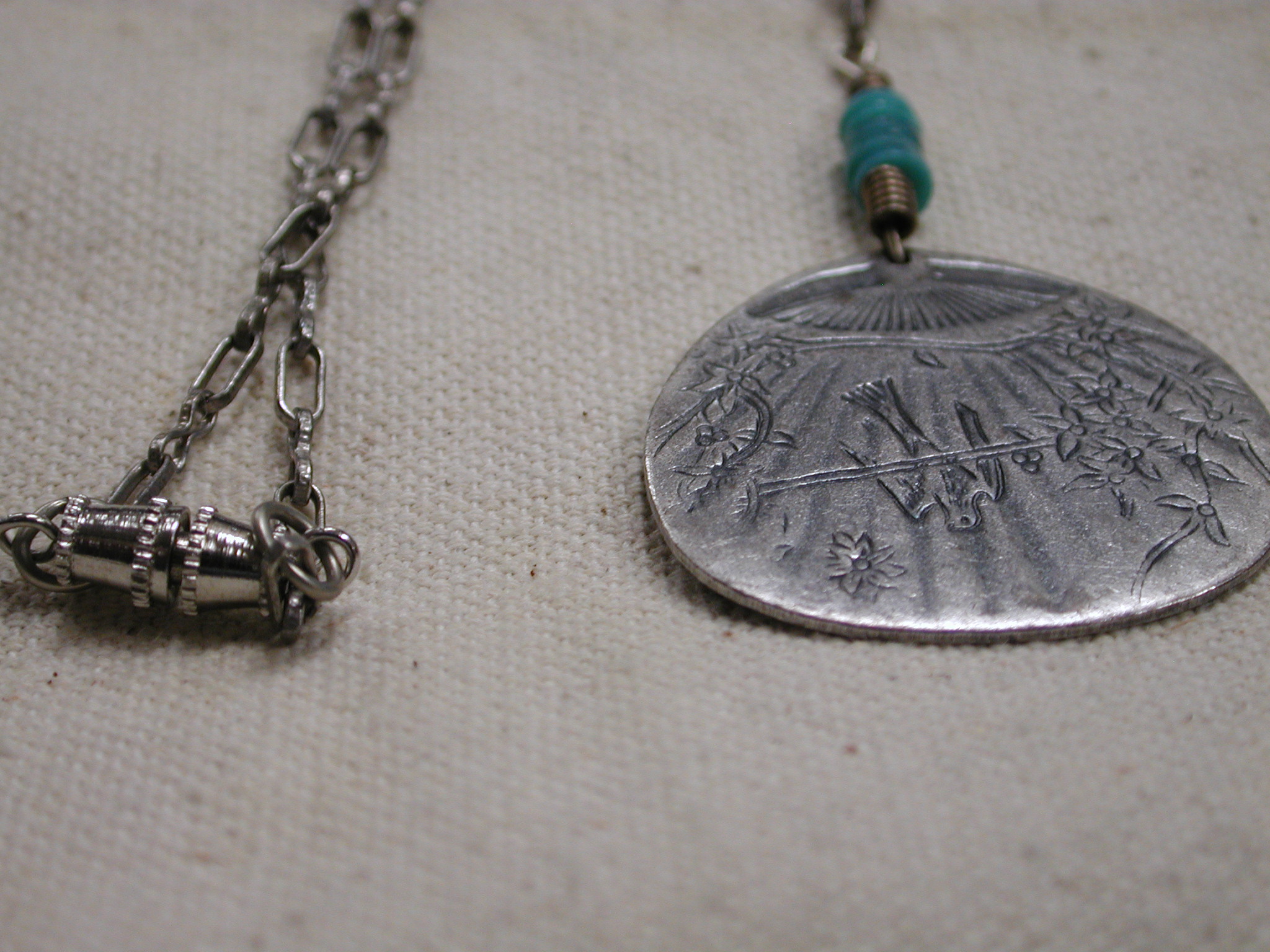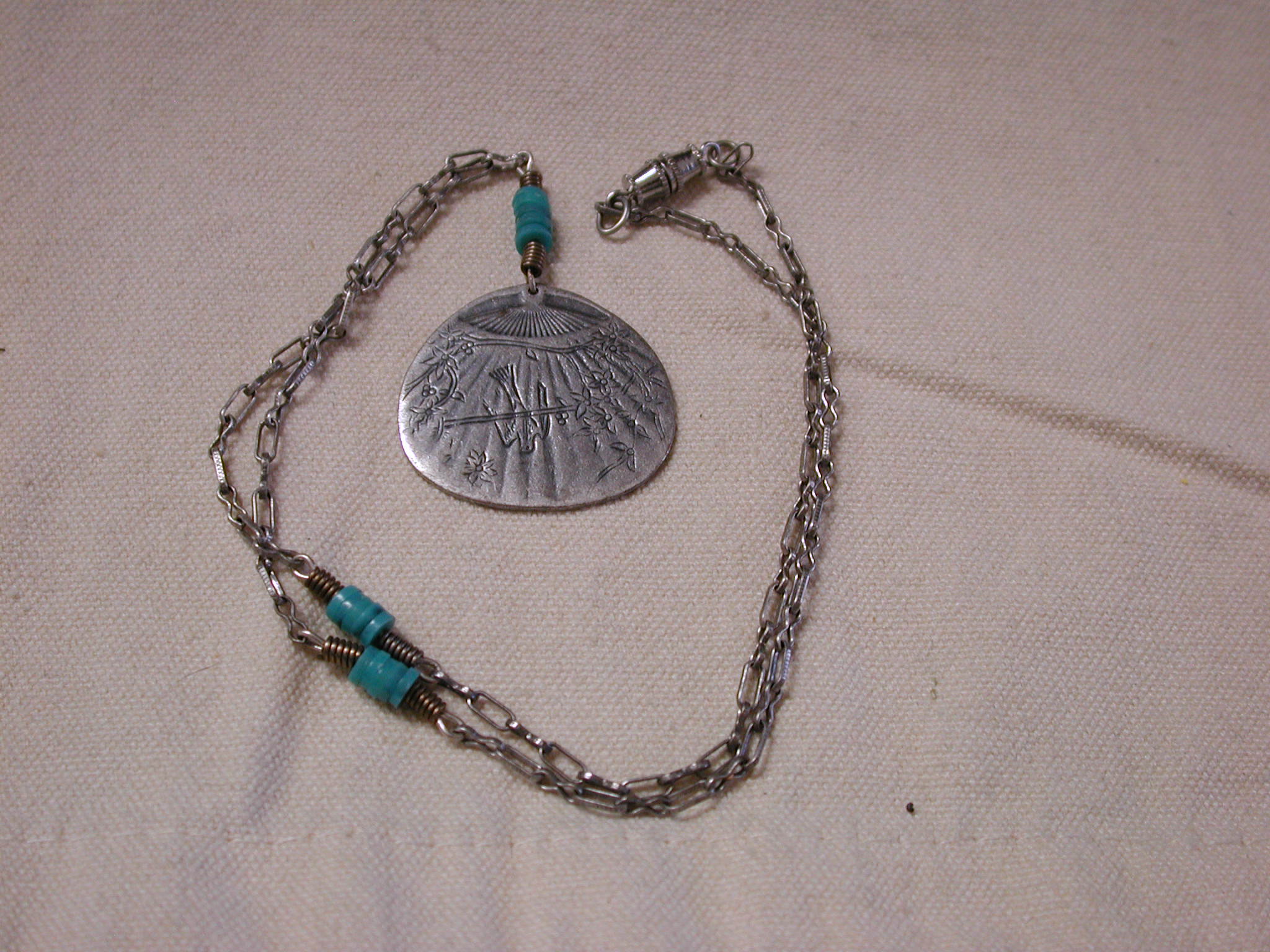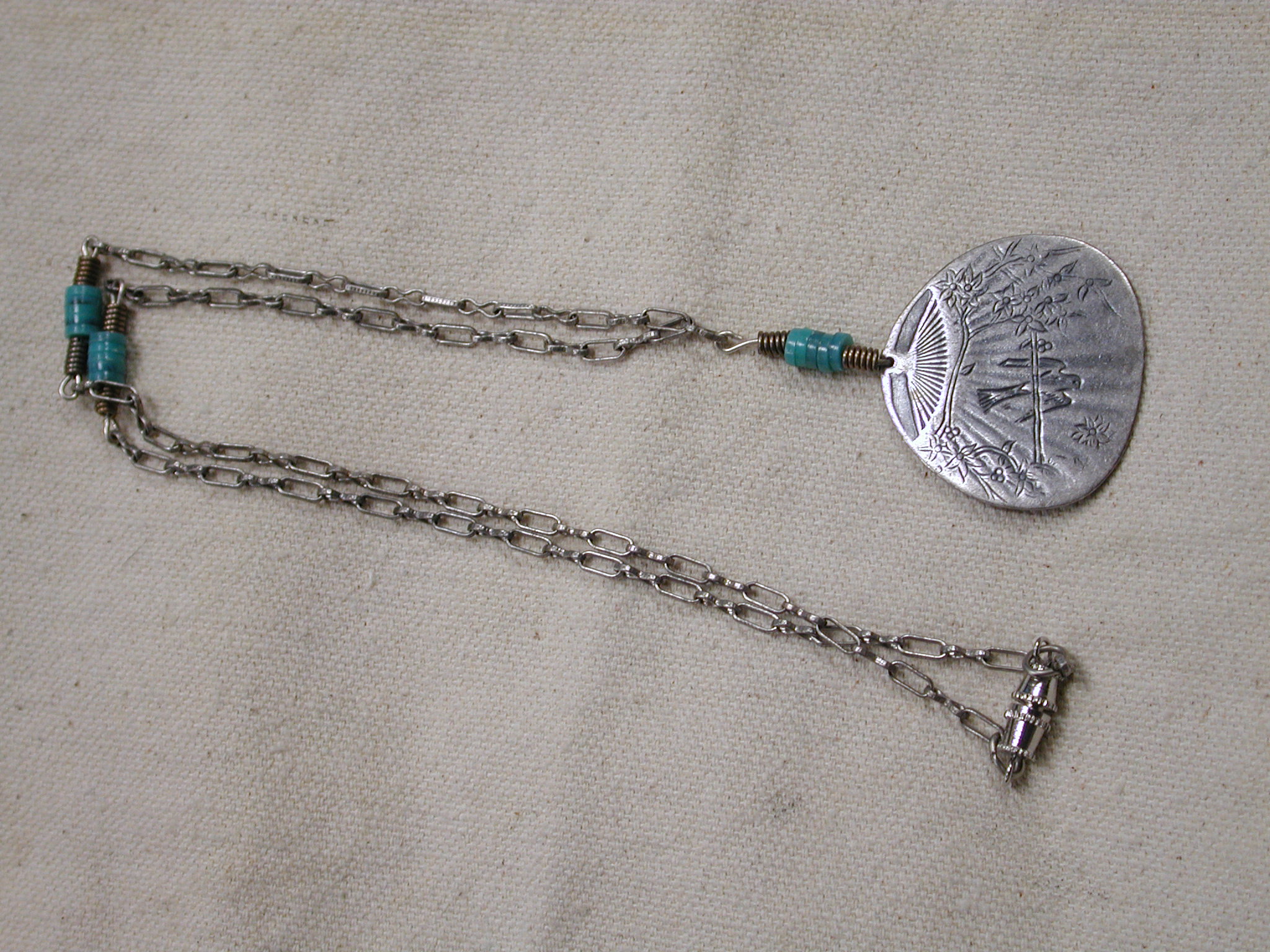 Fan medallion bird on flowering tree etching 20″ silver necklace turquoise beads – Vintage necklace crafted by someone with an unusual infinity link chain with turqoise round bead cylinders. The necklace is 20inches and then the pendant hanging is approx. 1 1/2 inches. Appears Asian in style with a fan motif and etched in bird on a branch of a flowering tree. Very Zen. The pendant is two sided so if it flips its the same.