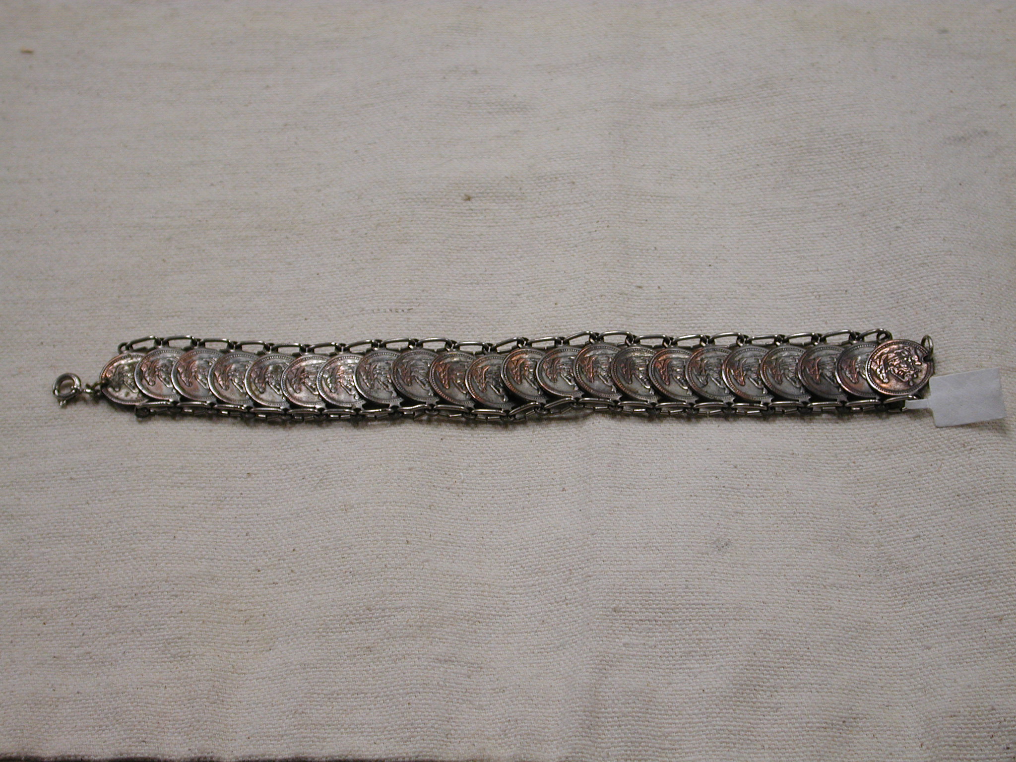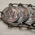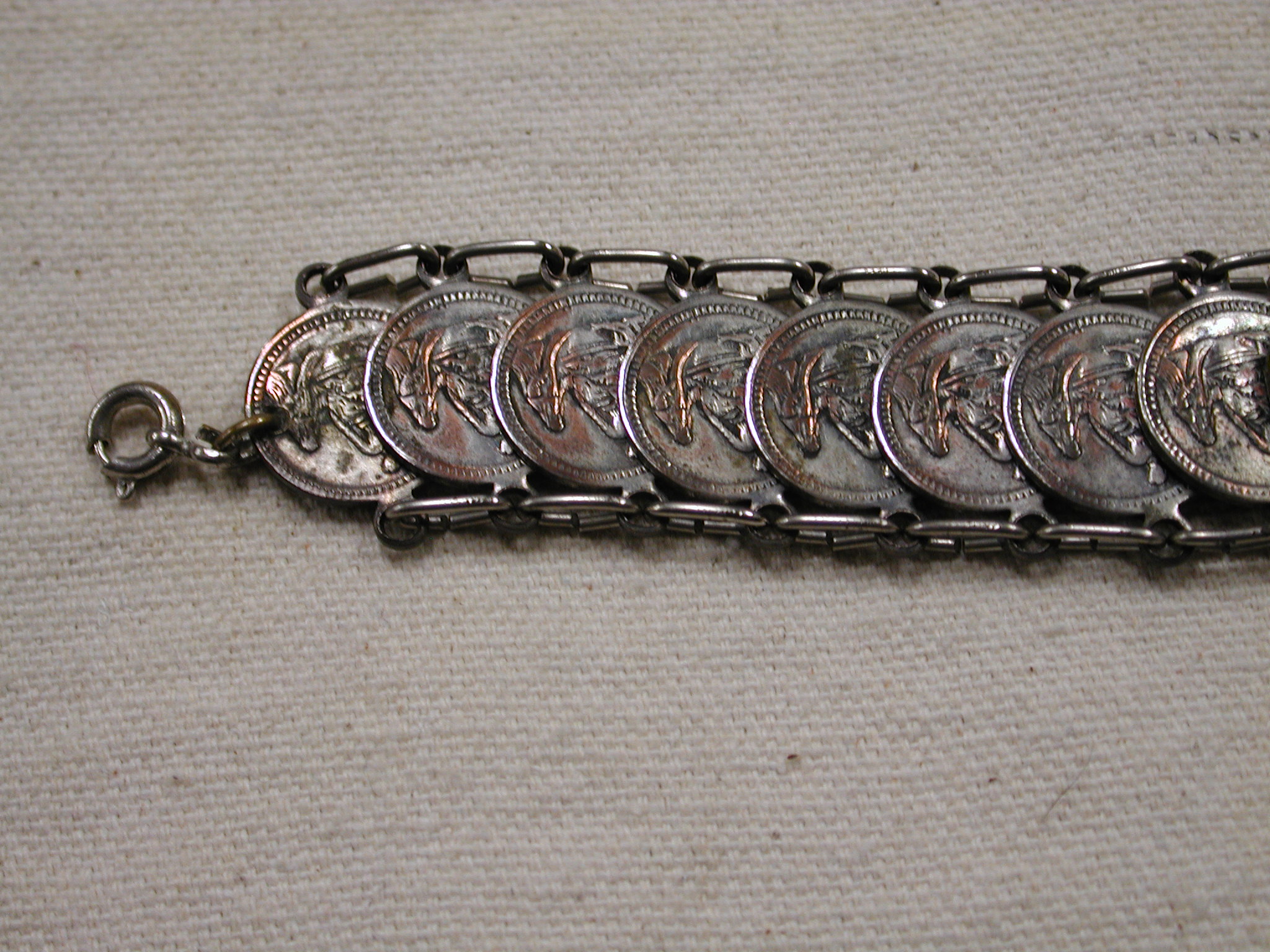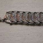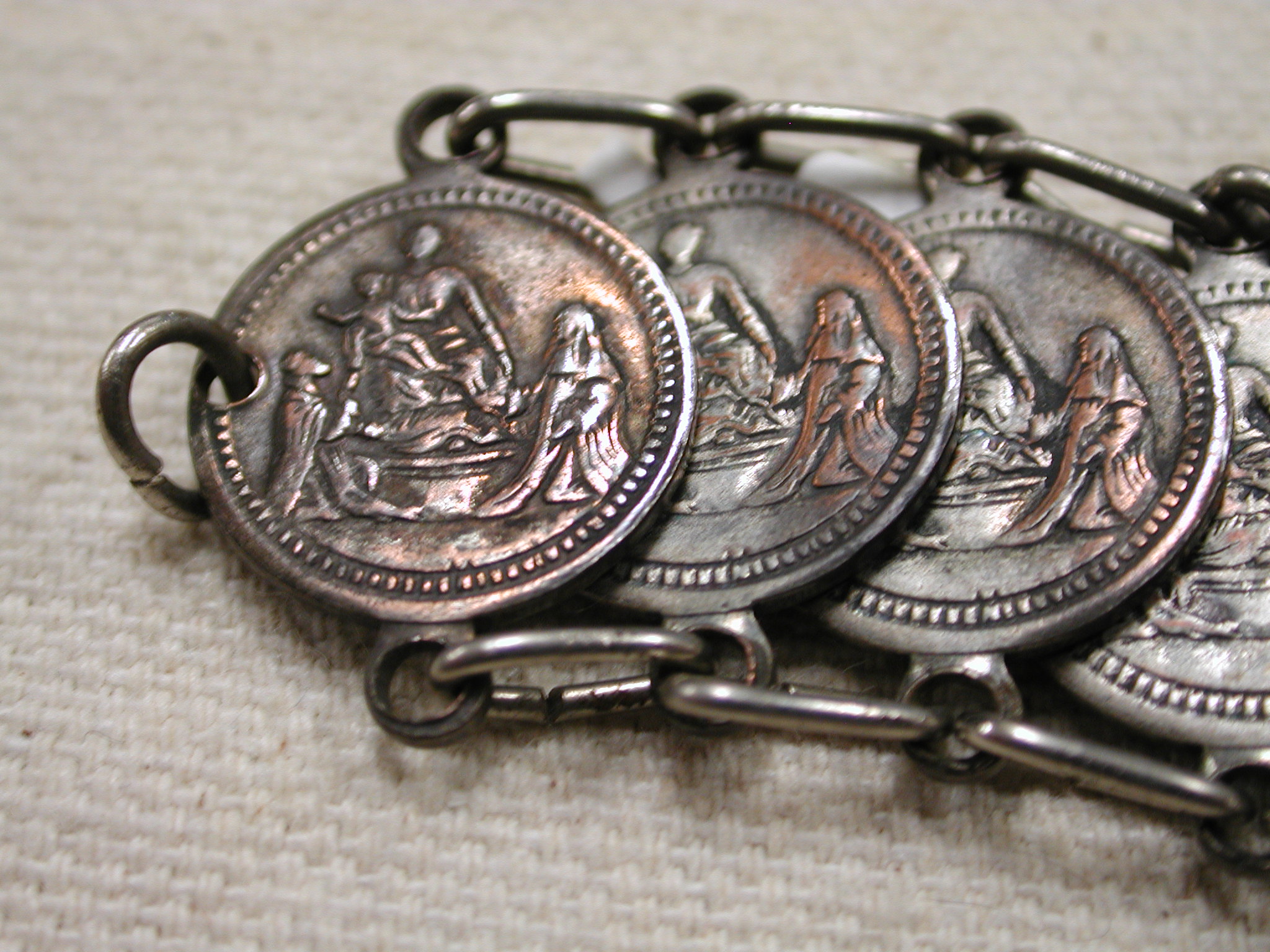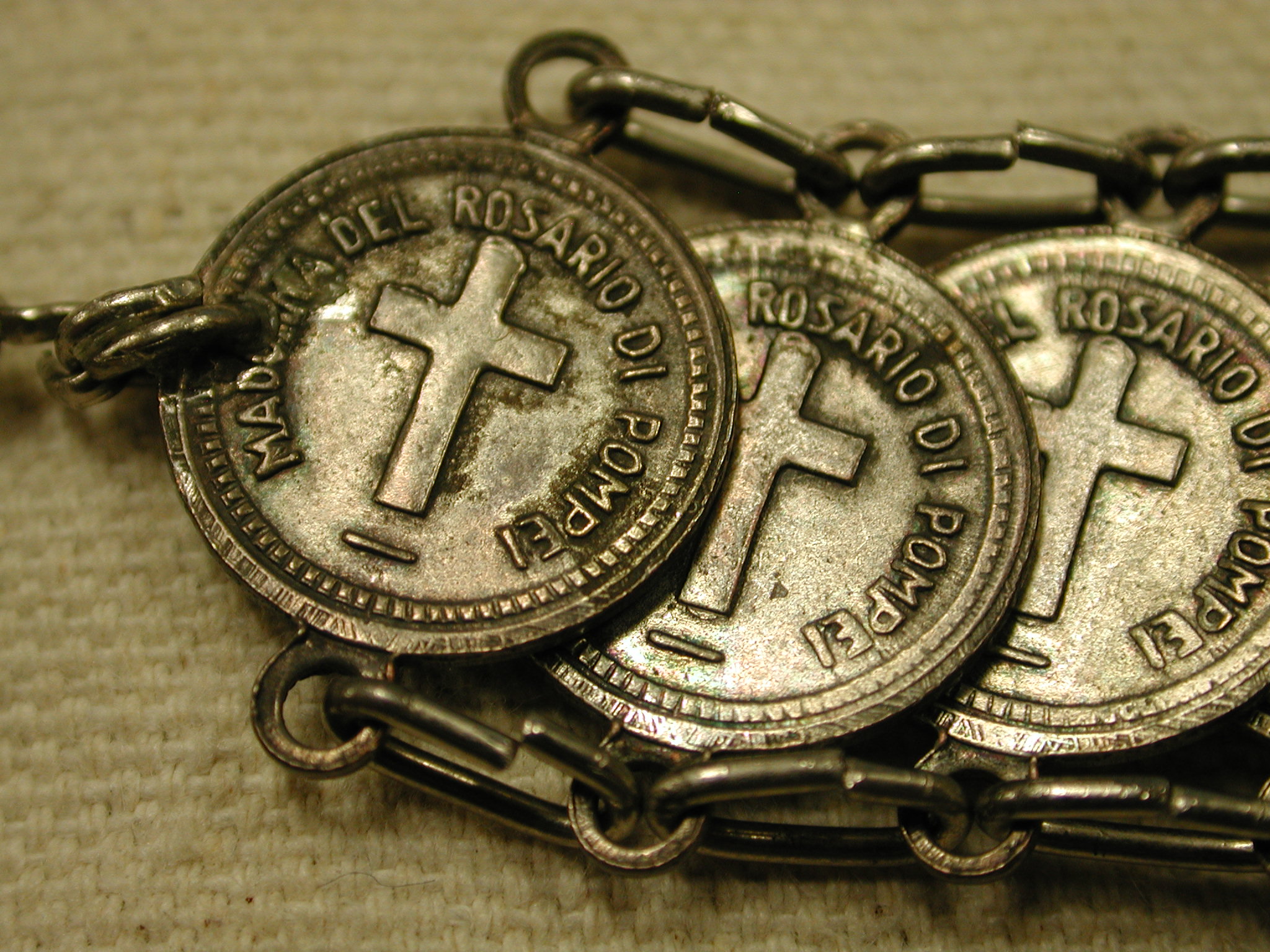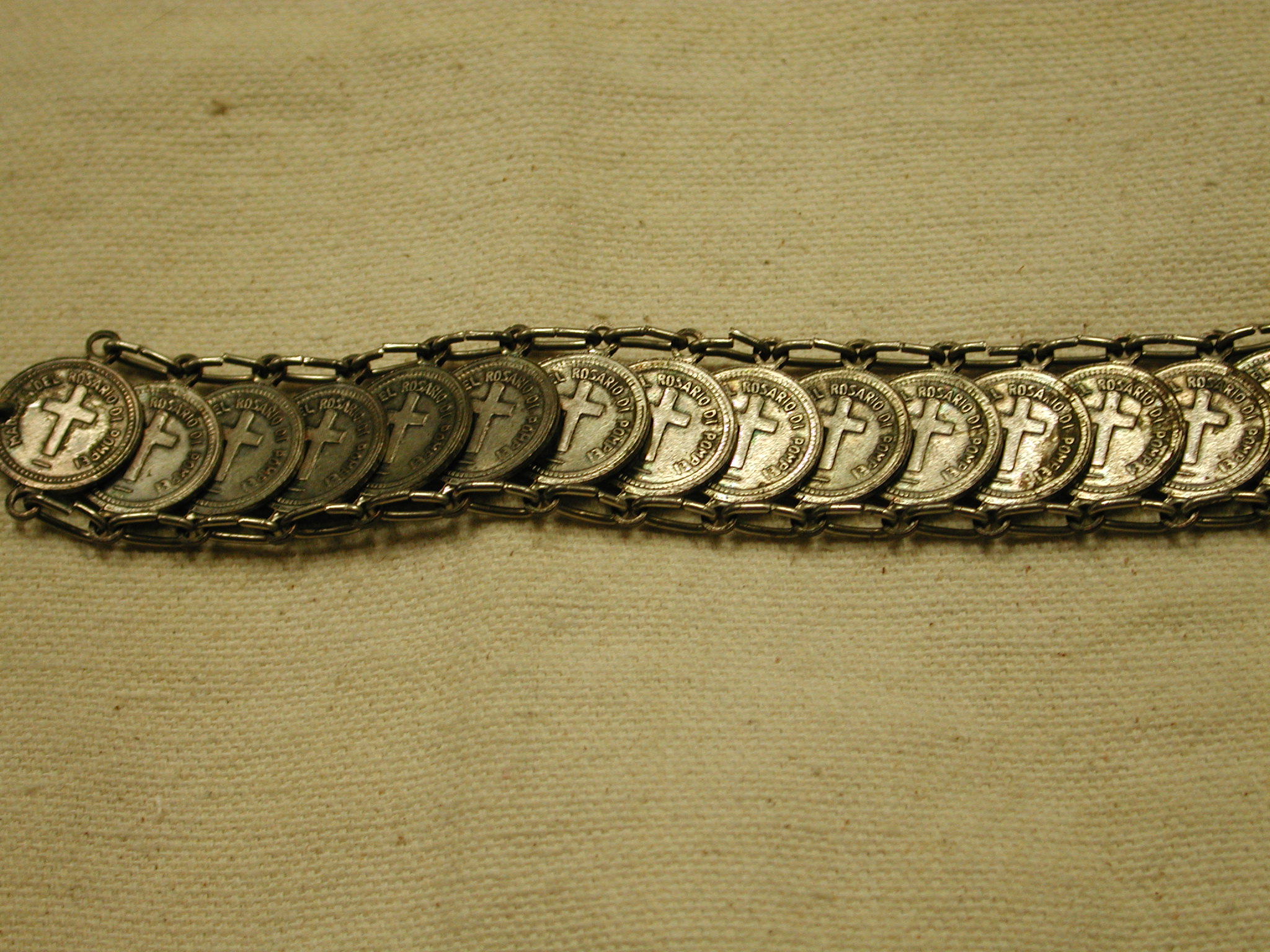 Vintage Our Lady of the Rosary of Pompei Italy bracelet 8″ Silver – measures 18mm wide and has 22 medals all attached with silver loops. Clasp is working fine. The medals are oxidized and the plating is showing the copper underneath – vintage patina!