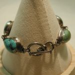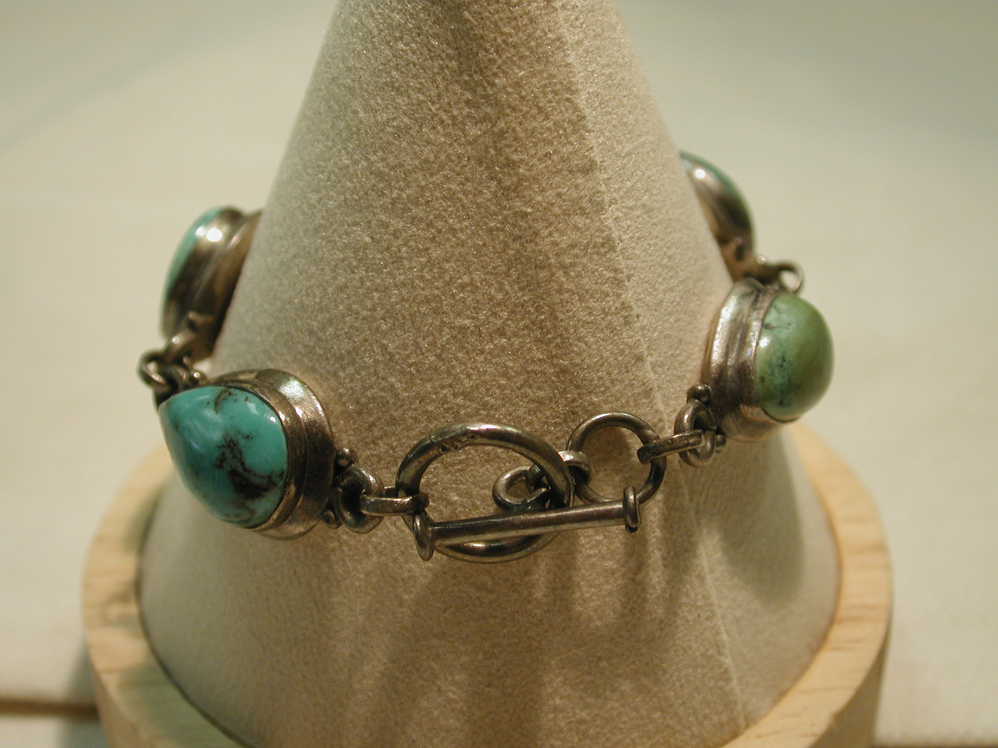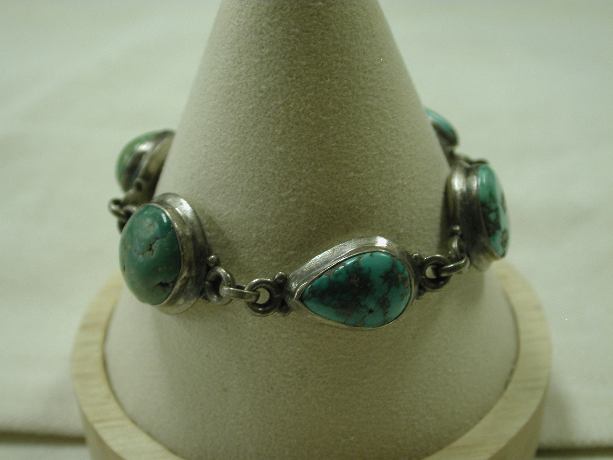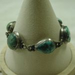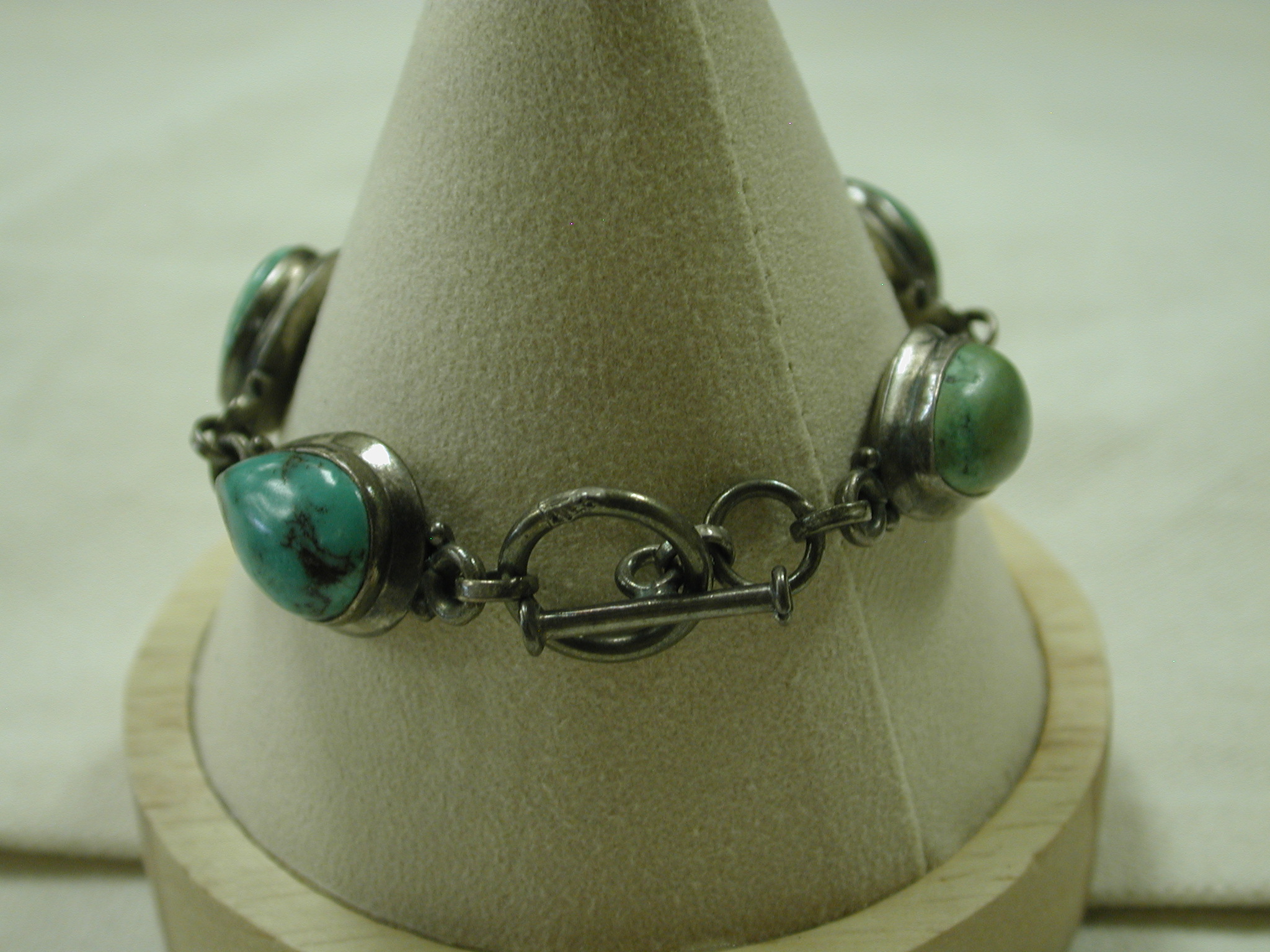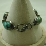 Teardrop and round Turquoise Sterling bezel set Bracelet 7 inches – toggle clasp – this is pre owned and the turquoise is green and greenish blue. Handmade it weighs 31.1 grams.